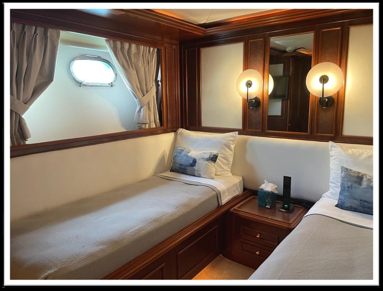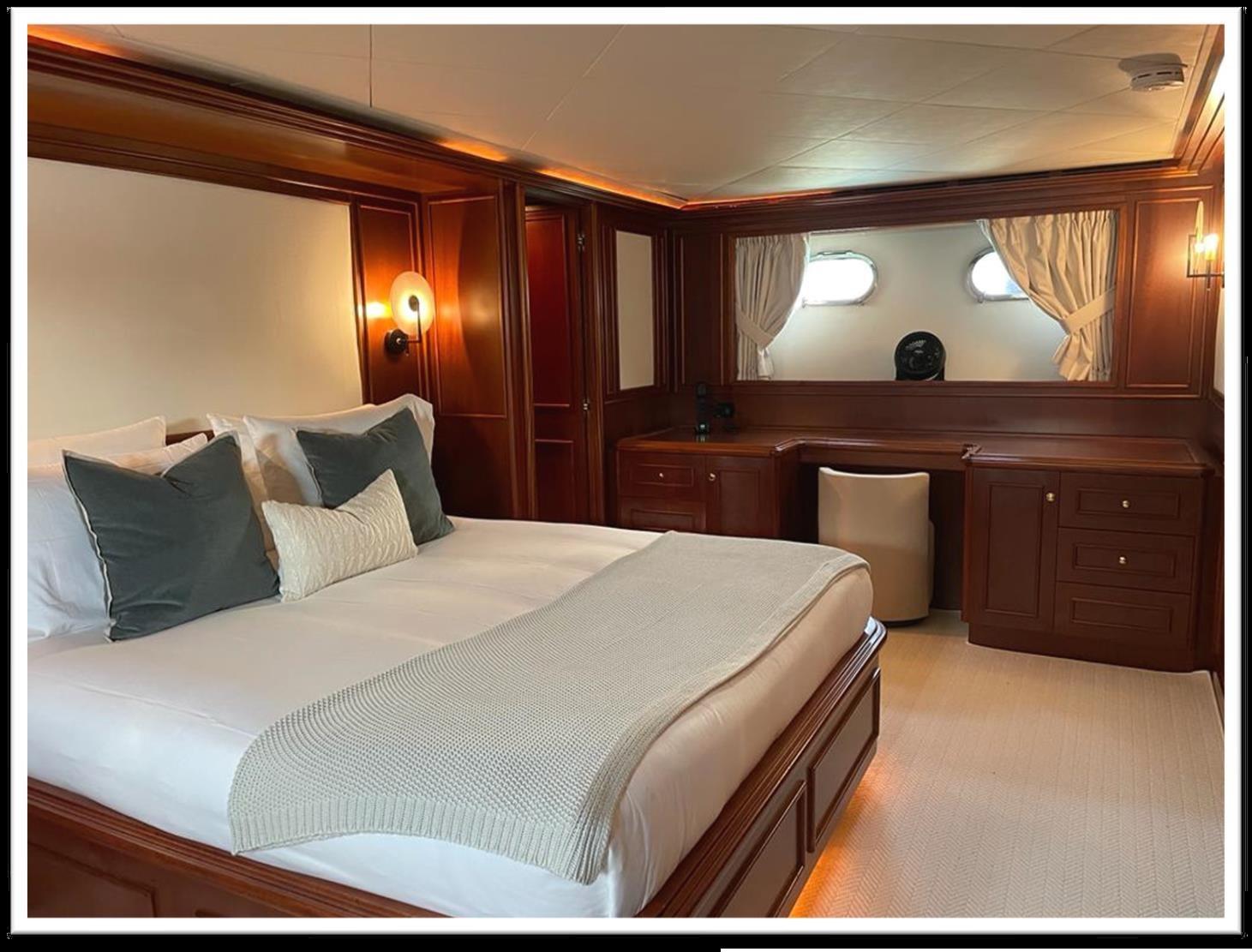 MYEERAH est un yacht à moteur de 27,45 m, construit en Italie par Custom Line en 2000. C’est l’un des deux modèles Navetta 27. Sa vitesse maximale est de 18,0 nœuds, sa vitesse de croisière est de 16,0 nœuds et son autonomie maximale de croisière est de 1200,0 nm à 15,5 nœuds, avec la puissance de deux moteurs diesel MAN. Il peut accueillir jusqu’à 8 personnes, avec 4 membres d’équipage. Il a une jauge brute de 157,0 GT et une largeur de 7,0 mètres. Il a été conçu par Zuccon International Project, qui a également conçu l’architecture navale et les intérieurs. 3 barre principale, commande électronique du moteur + 2 ailes latérales GARMIN : GPS - pilote automatique - traceur - radar - radio VHF - siège copilote -écran tactile, domotica Passerelles latérales en teck - douche lutdoor - propulseur de poupe - propulseur d’étrave fixe - phares de poupe fixes - phares réglables volets hydrauliques - garage pour annexe uniquement jetski et club de plage, annexe sur fly - grue pour annexe sur fly - système de lutte contre l’incendie - indicateurs ilaps - lavage de chaîne - évier dans le cockpit de la mouche - lumières de courtoisie - lumières sous-marines - passerelle - 2 nouvelles portes latérales - cockpit teck - prise 220V quai - quai d’eau - stabilisateurs ailerons - table sockpit 2 Winch de pêche à l’arrière - 2 Winch d’étrave avec étrave Climatisation - chargeur de batterie - BBQ/ Grill - chaudière - Climat réversible - dessalinisateur - système d’eaux noires onduleur - plancher intérieur en bois - prises internes 12v - prises internes 220v - réservoir d’eaux noires - 5 WC marins électriques + équipage Haut-parleurs - antenne satellite TV - DVD - home cinéma - système TV - mécanisme de levage pour TV dans le salon - Radio AM/FM - 5 téléviseurs Congélateur - four - réfrigérateur externe - réfrigérateur interne - machine à glaçons - laveuse sécheuse - lave-vaisselle