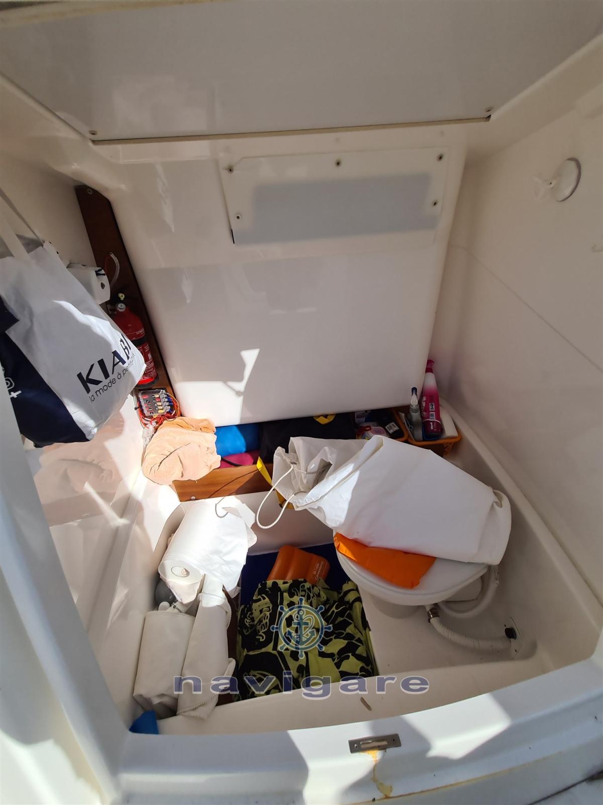 • Casier sous le bain de soleil avant • Console de pilotage habitable • Portes avec pistons à gaz • Siège passager devant la console • Siège conducteur avec pare-brise enveloppant • Disposition pour WC marin électrique dans la console