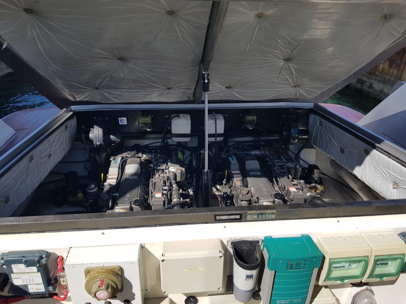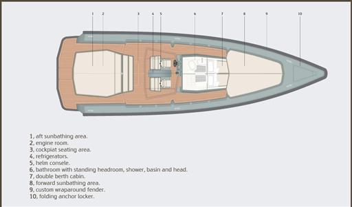 Alarme moteur, Alarme de pompe de cale, Passavant en teck, Douche de cockpit, Flaps électriques, Éclairage de courtoisie, Spots sous-marins, Plateforme arrière, Pompe de cale manuelle, Cockpit en teck, Prise de quai, Connexion eau sous pression à quai, Guindeau électrique, Echelle de bain, Corne.