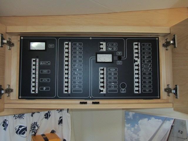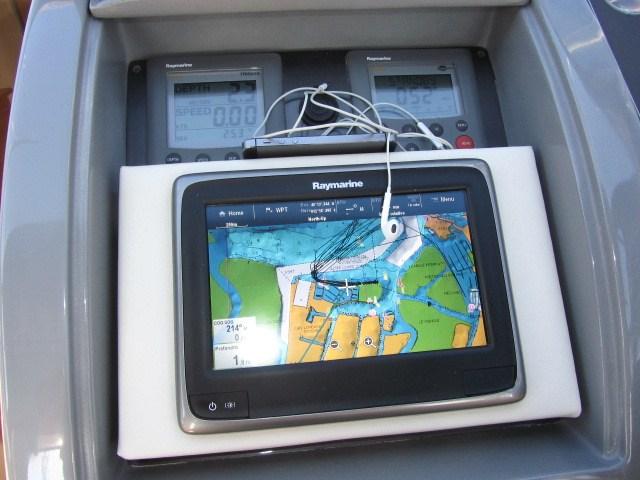 Indicateur d'angle de barre, Commande électrique, Ordinateur fixe de bord, Moniteur, Sondeur pêche (Raymarine), GPS (Raymarine E80), Pilote automatique (Raymarine).
