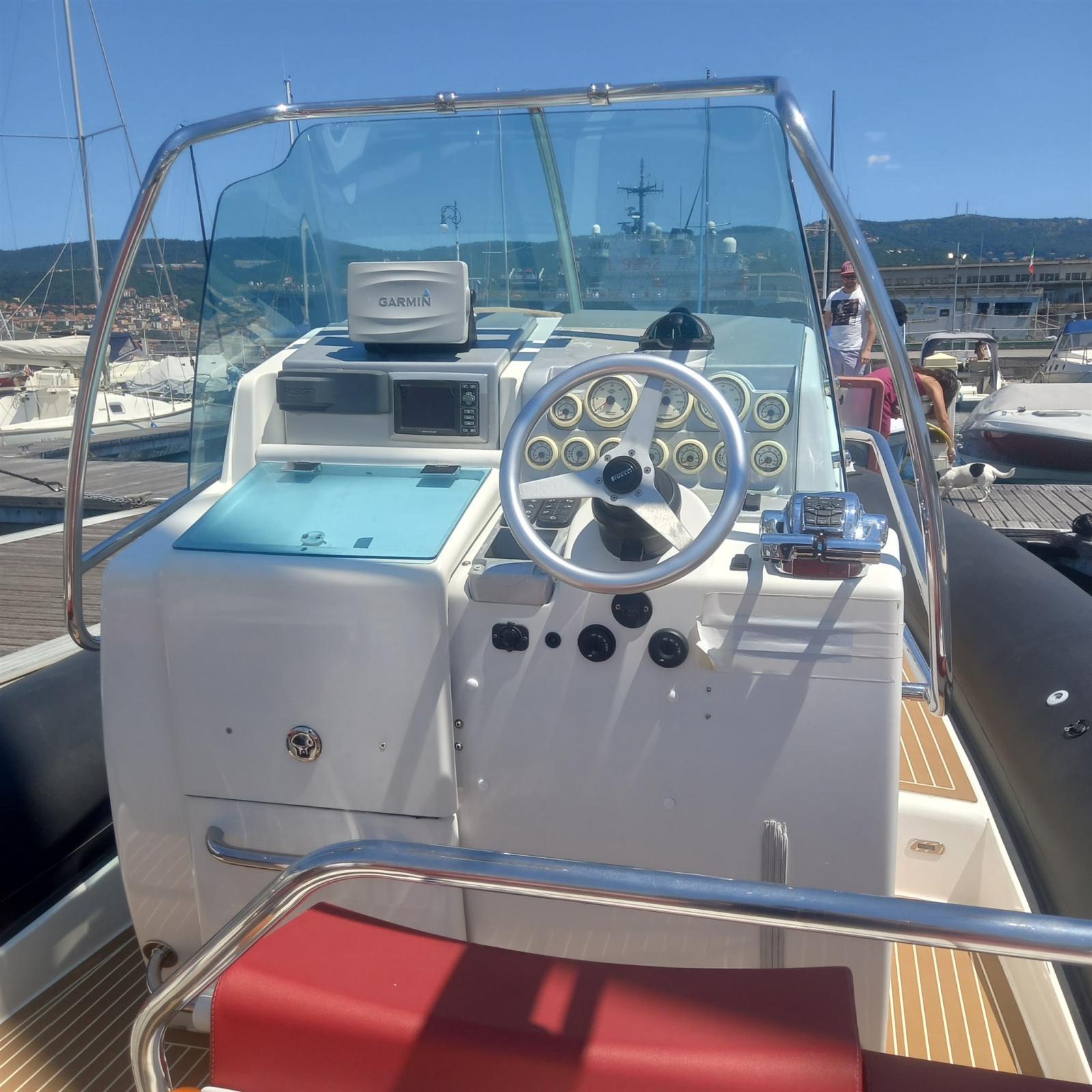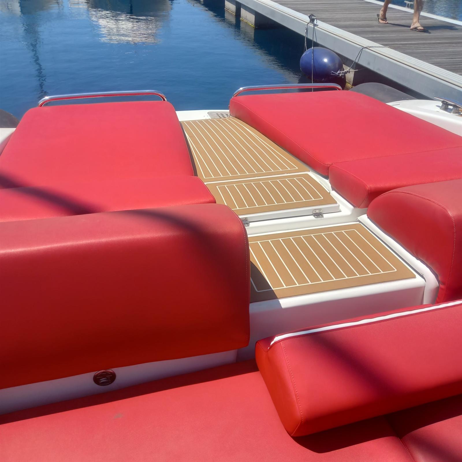 Alarme moteur, Alarme de pompe de cale, Ouverture du compartiment moteur électrique, Eau sous pression, 3 Batteries, Douche de cockpit, Extincteur(s) fixe(s), Éclairage de courtoisie, Spots sous-marins, Plateforme arrière, Pompe de cale automatique, Cockpit en teck, Prise de quai, Rollbar, Guindeau électrique, Echelle de bain, Table, Corne.