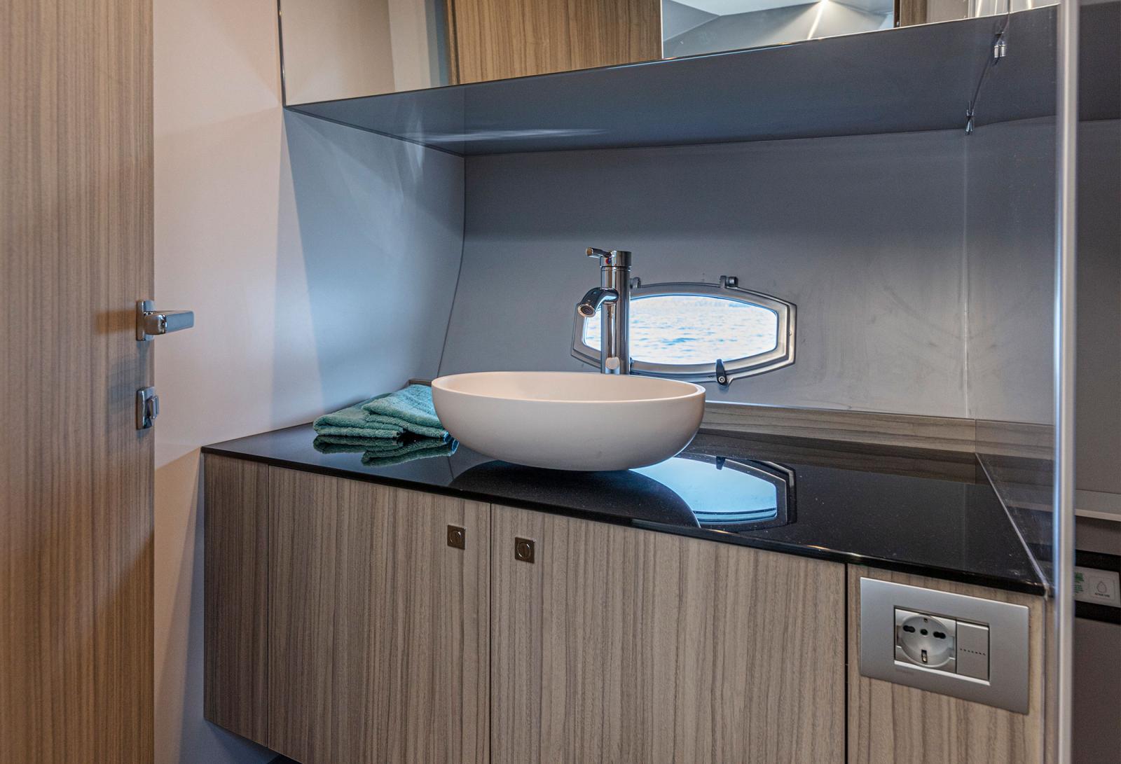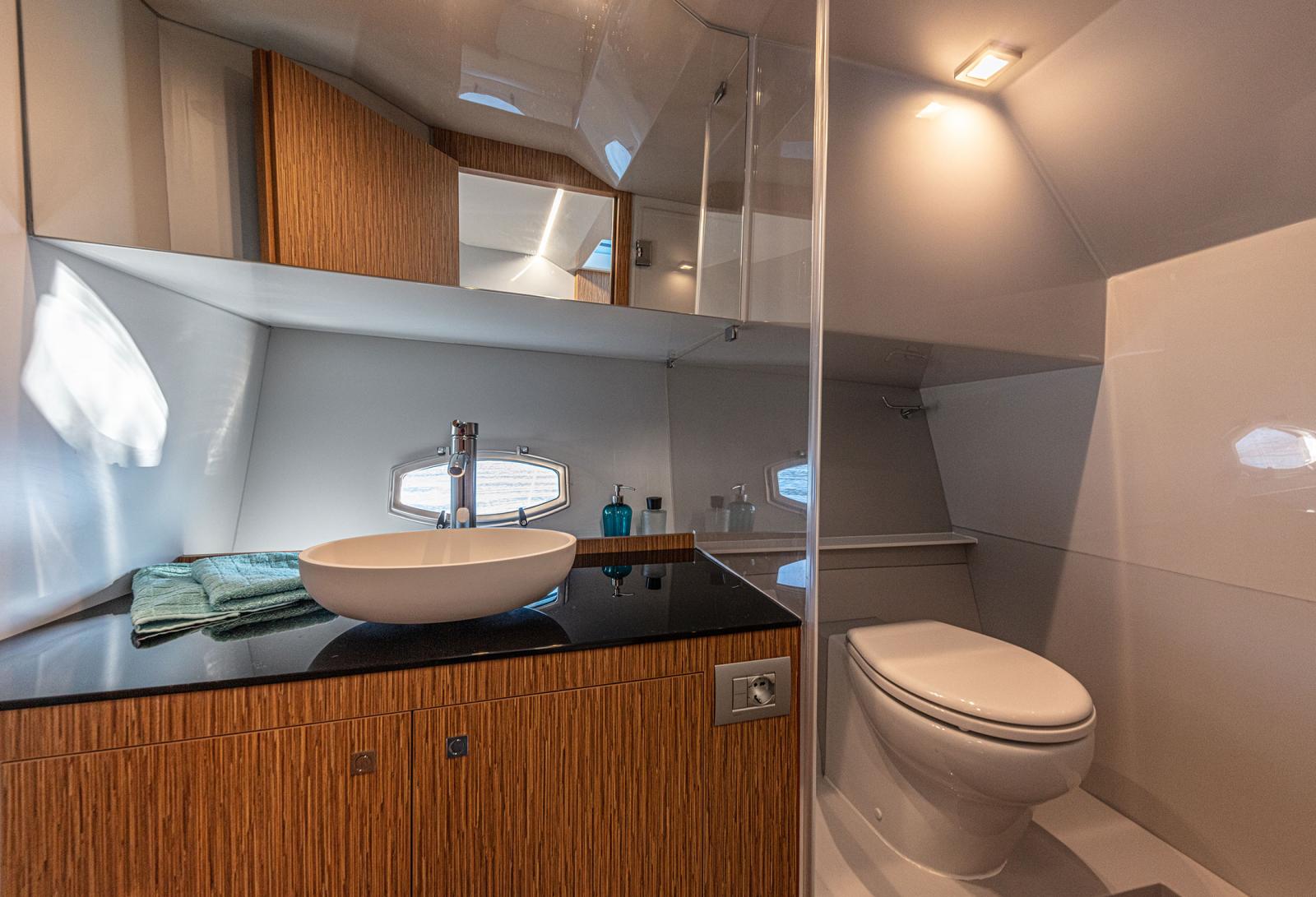 En descendant sous le pont, on trouve une salle de bain avec la douche et quatre lit éclairés par des splendides fenêtres qui ennoblissent la coque : tout ce dont vous avez besoin pour un week-end 5 étoiles.