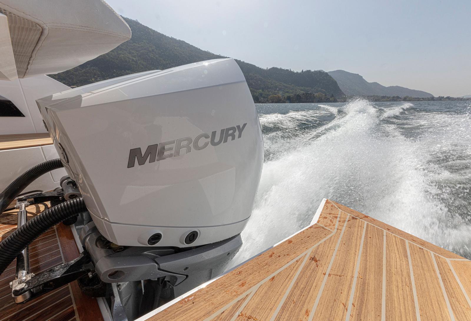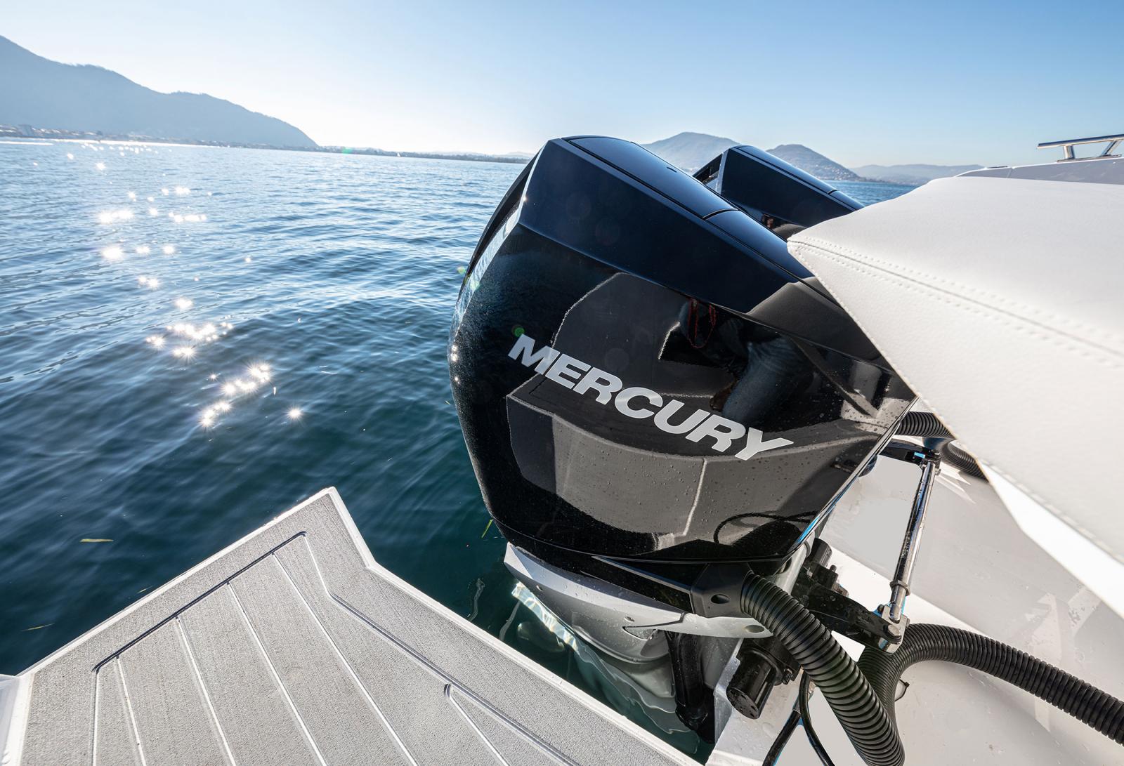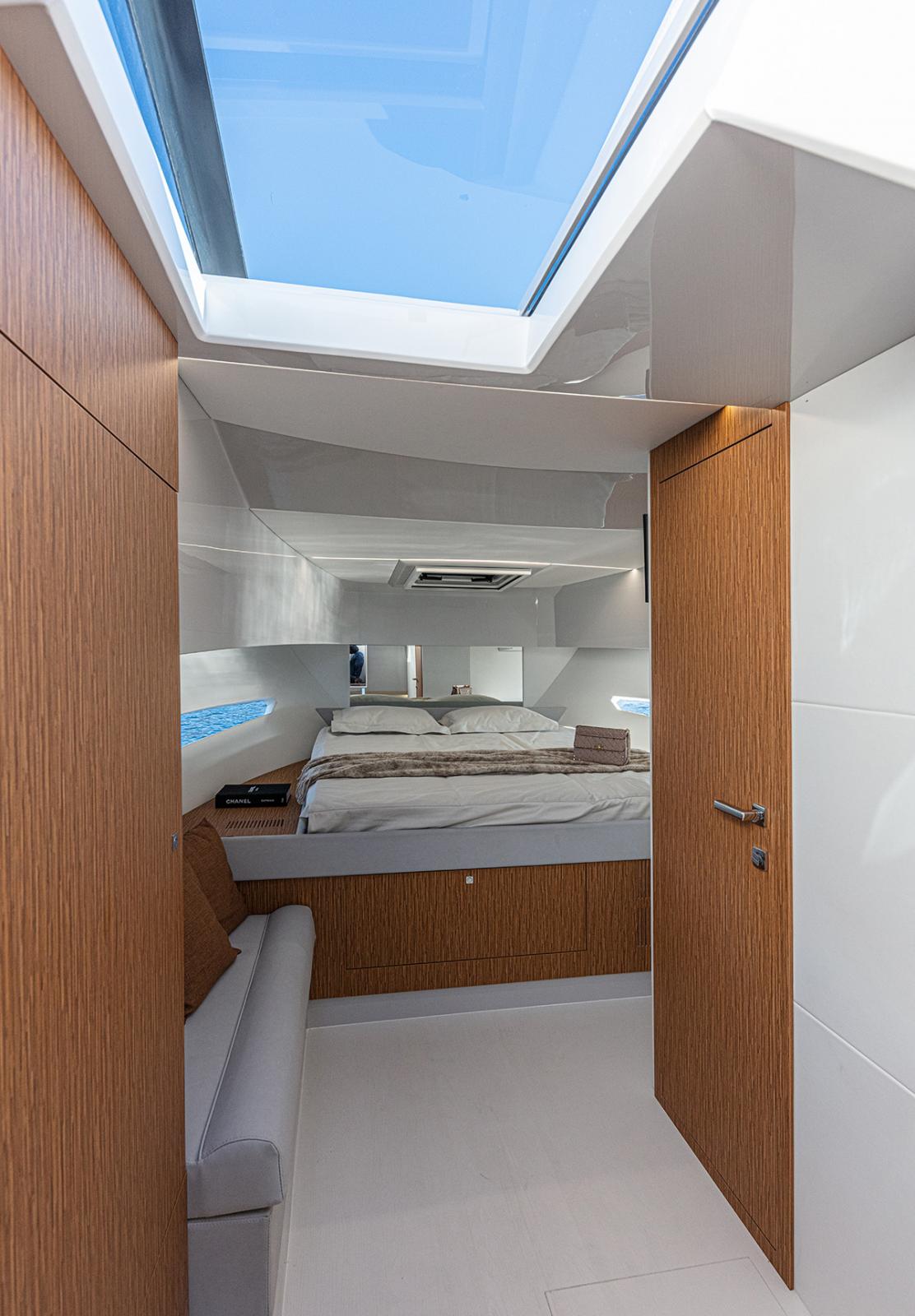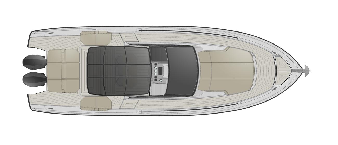 Le cockpit est grand, tout comme les terrasses avant et arrière. A l'arrière, on trouve également une table escamotable et, vers le centre, un monobloc en fibre de verre qui divise la zone de conduite et peut accueillir une petite cuisine, le tout protégé par un T-Top élégant et sportif.