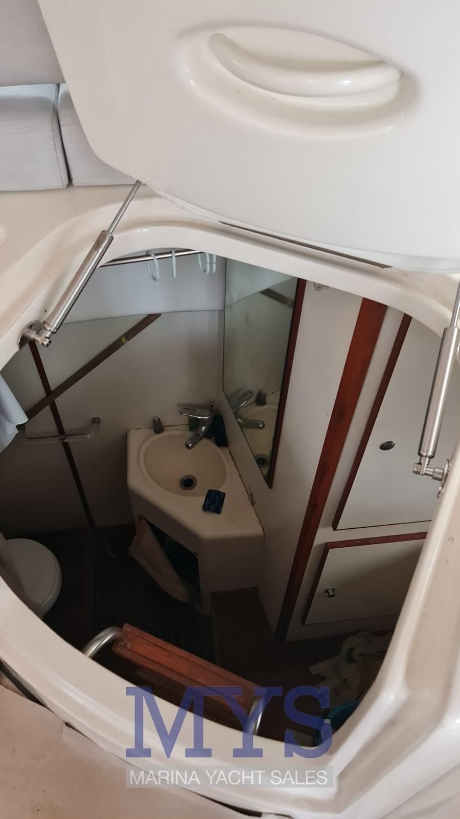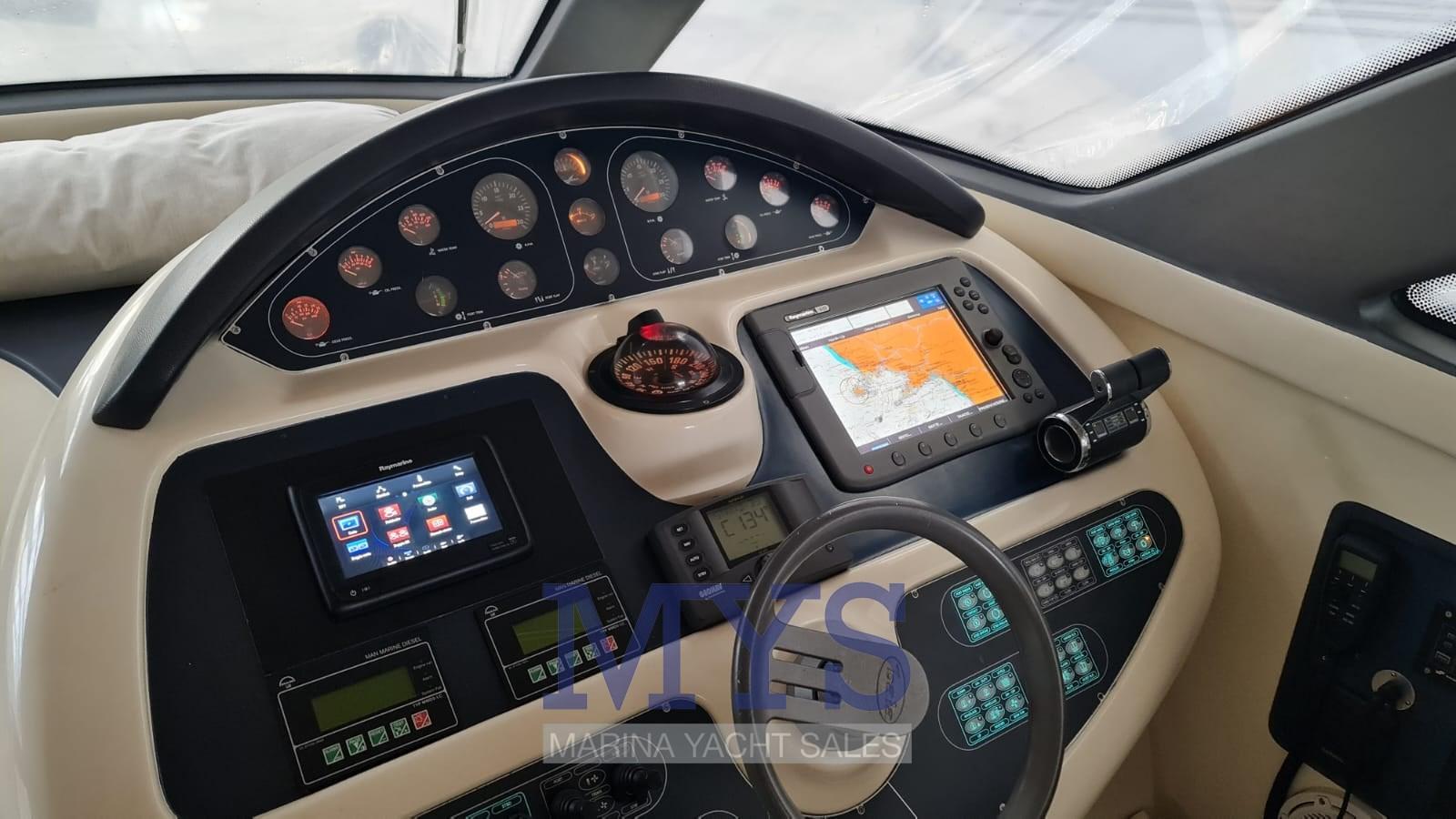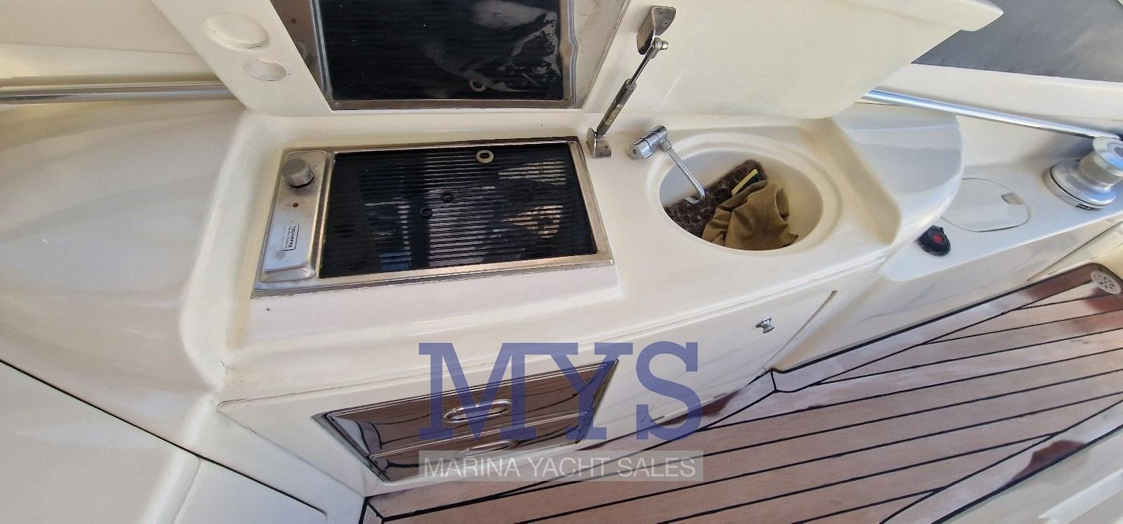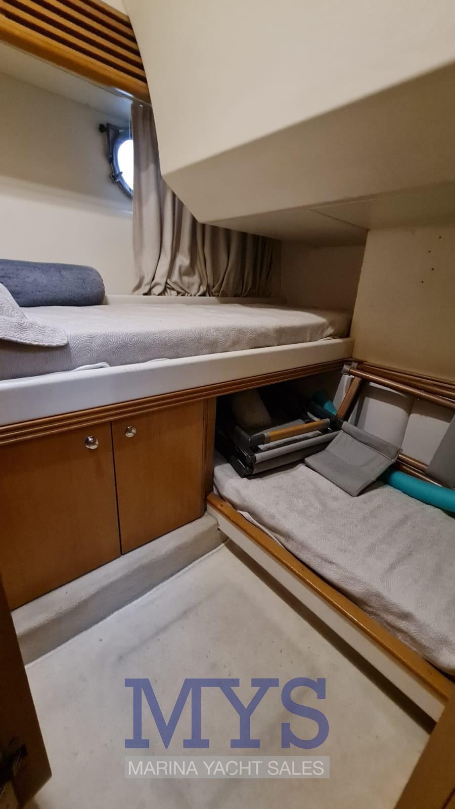 À l’avant du grand salon se trouve la cabine du propriétaire avec salle de bain privée. Vers la poupe, il y a les 2 cabines d’invités et un deuxième toilette. Poste de barre : à tribord du cockpit, desservi par un canapé 2 places. Pont ergonomique avec instrumentation moteur, radiotéléphone VHF, traceur avec GPS, échosondeur, compas, pilote automatique avec interface GPS Zone des cartes : sur les tables dans le cockpit et dans le salon intérieur Zone de la cuisine : située dans la zone centrale du bateau, à tribord. Éléments bas et hauts en bois précieux ; plaque de cuisson ; micro-ondes; Armoire avec réfrigérateur/congélateur de 270 litres.