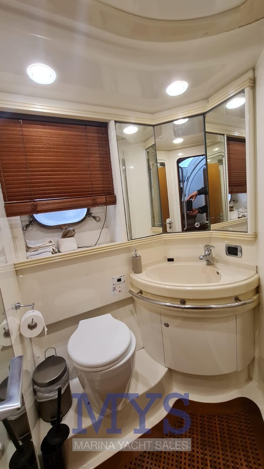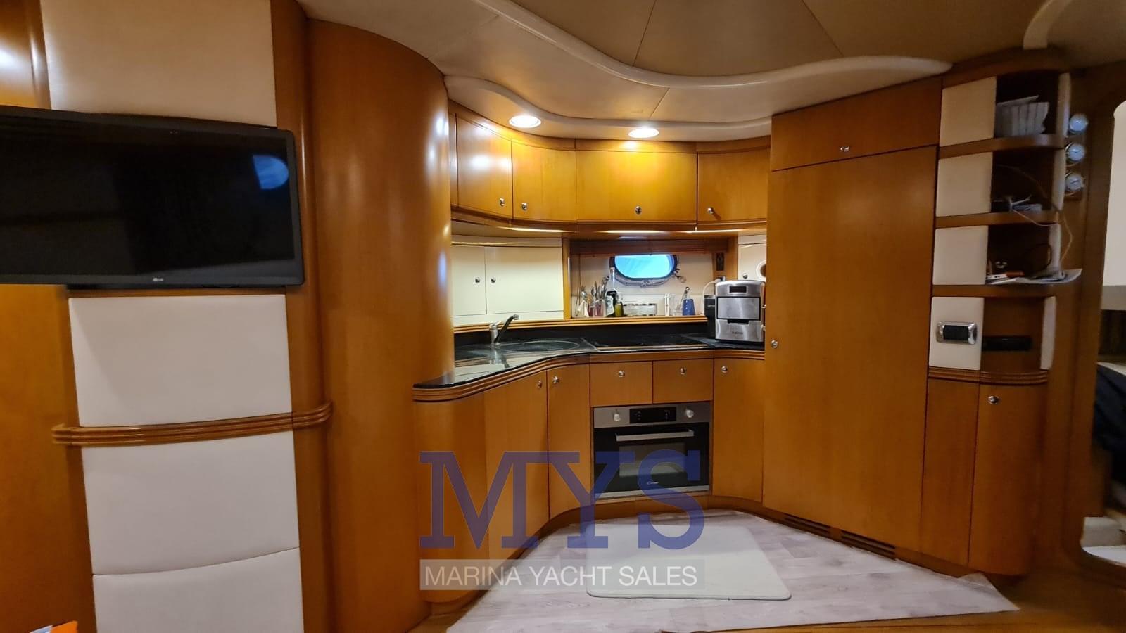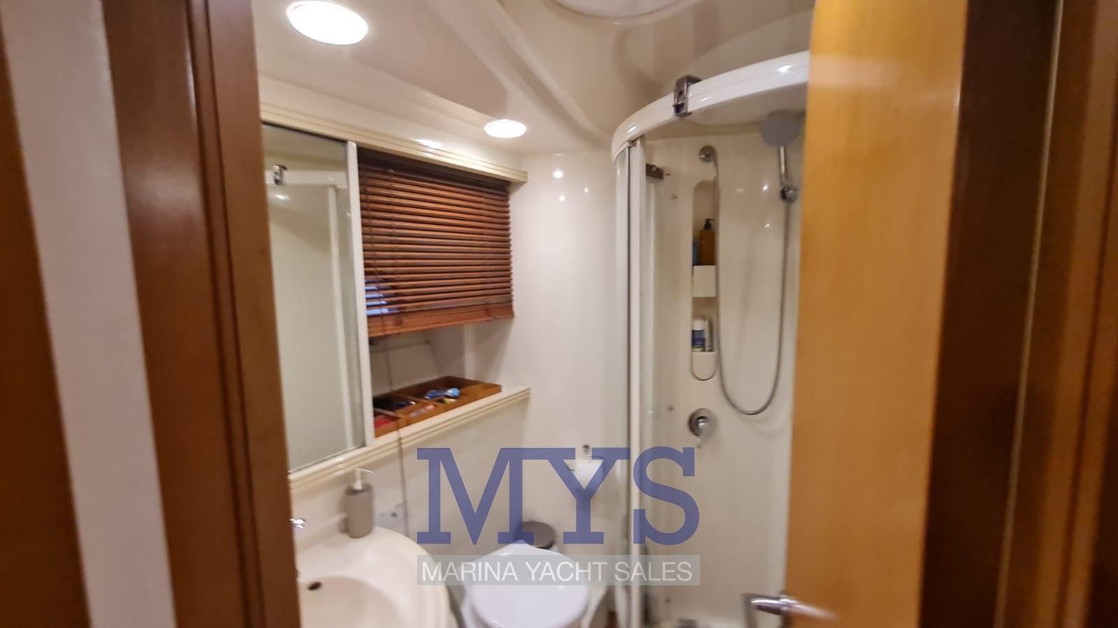 À l’avant du grand salon se trouve la cabine du propriétaire avec salle de bain privée. Vers la poupe, il y a les 2 cabines d’invités et un deuxième toilette. Poste de barre : à tribord du cockpit, desservi par un canapé 2 places. Pont ergonomique avec instrumentation moteur, radiotéléphone VHF, traceur avec GPS, échosondeur, compas, pilote automatique avec interface GPS Zone des cartes : sur les tables dans le cockpit et dans le salon intérieur Zone de la cuisine : située dans la zone centrale du bateau, à tribord. Éléments bas et hauts en bois précieux ; plaque de cuisson ; micro-ondes; Armoire avec réfrigérateur/congélateur de 270 litres.