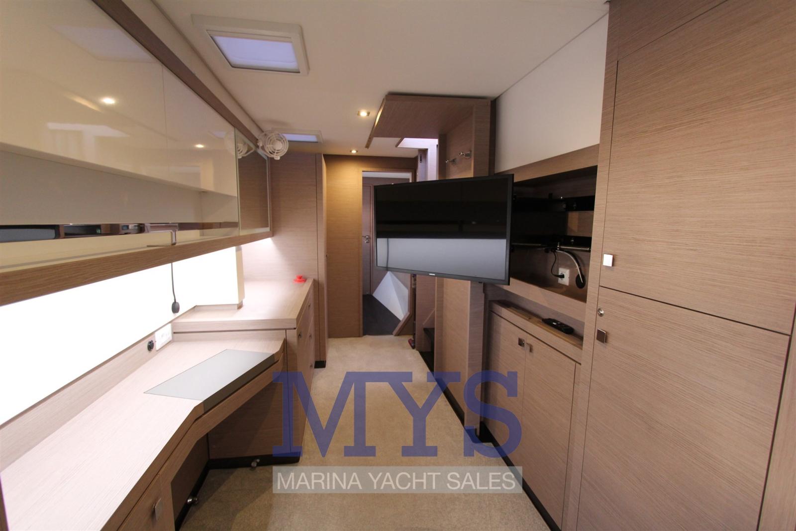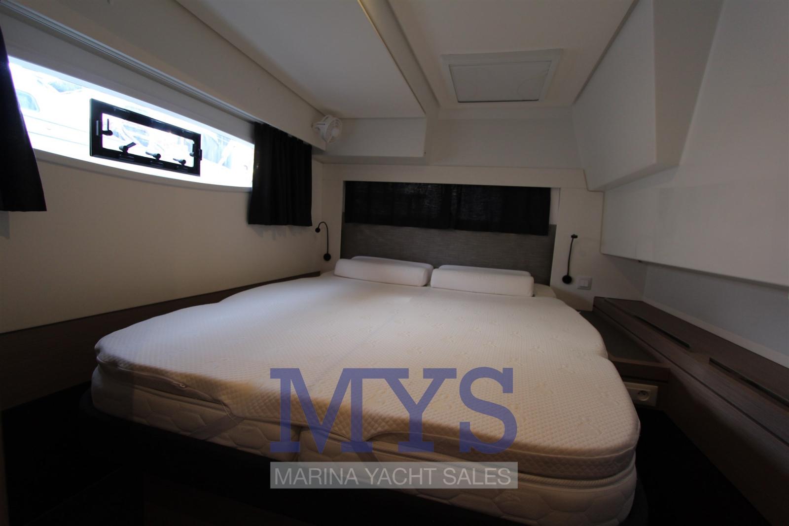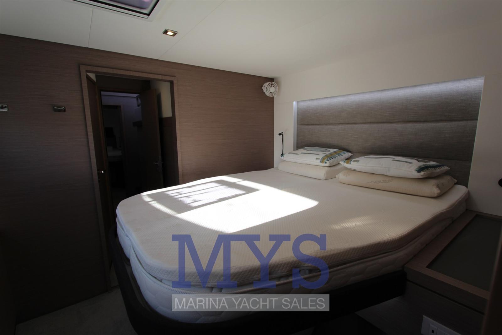Cabine principale dans la coque bâbord qui comprend un lit double, un coin bureau avec armoires, une salle de bain privée avec cabine de douche séparée