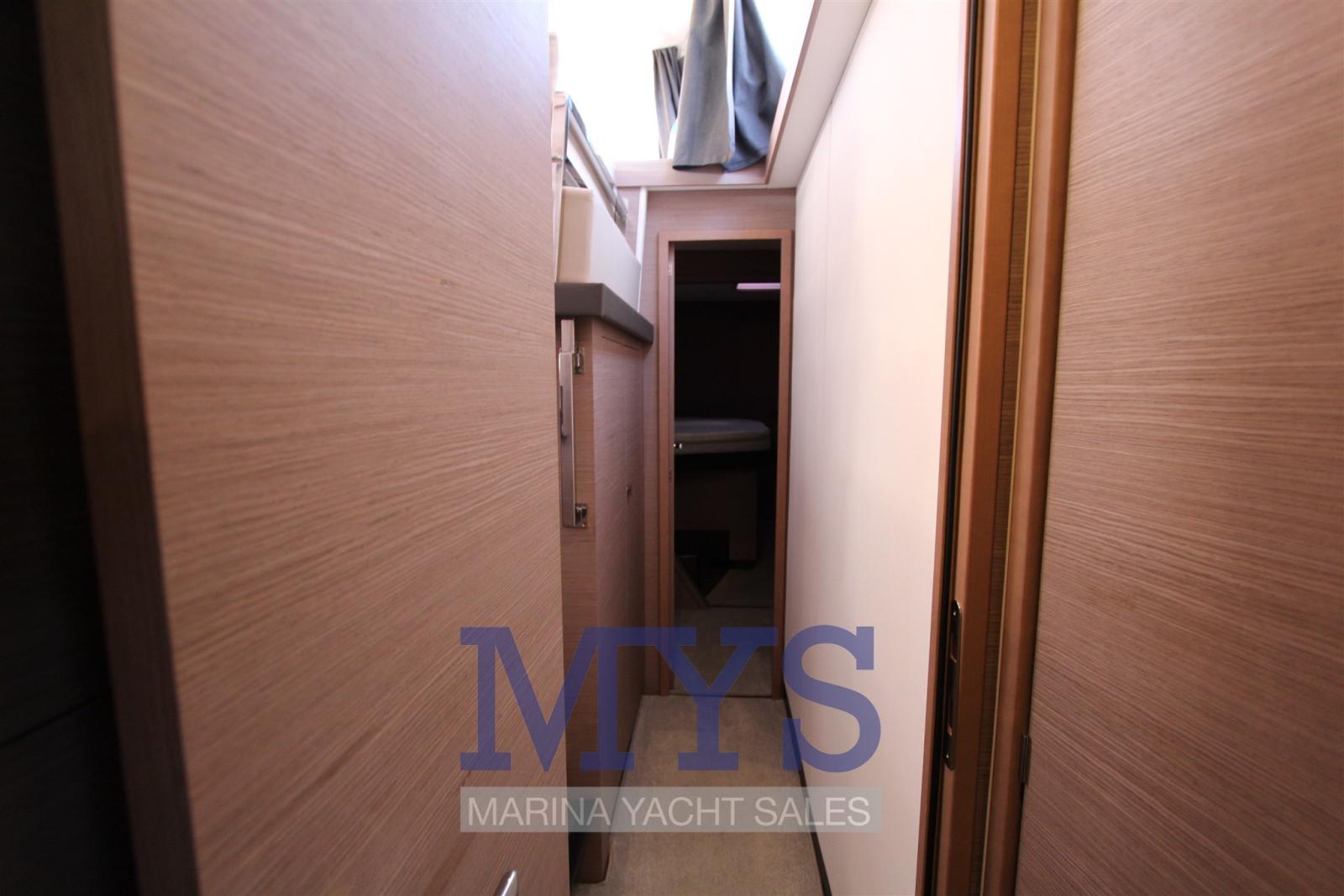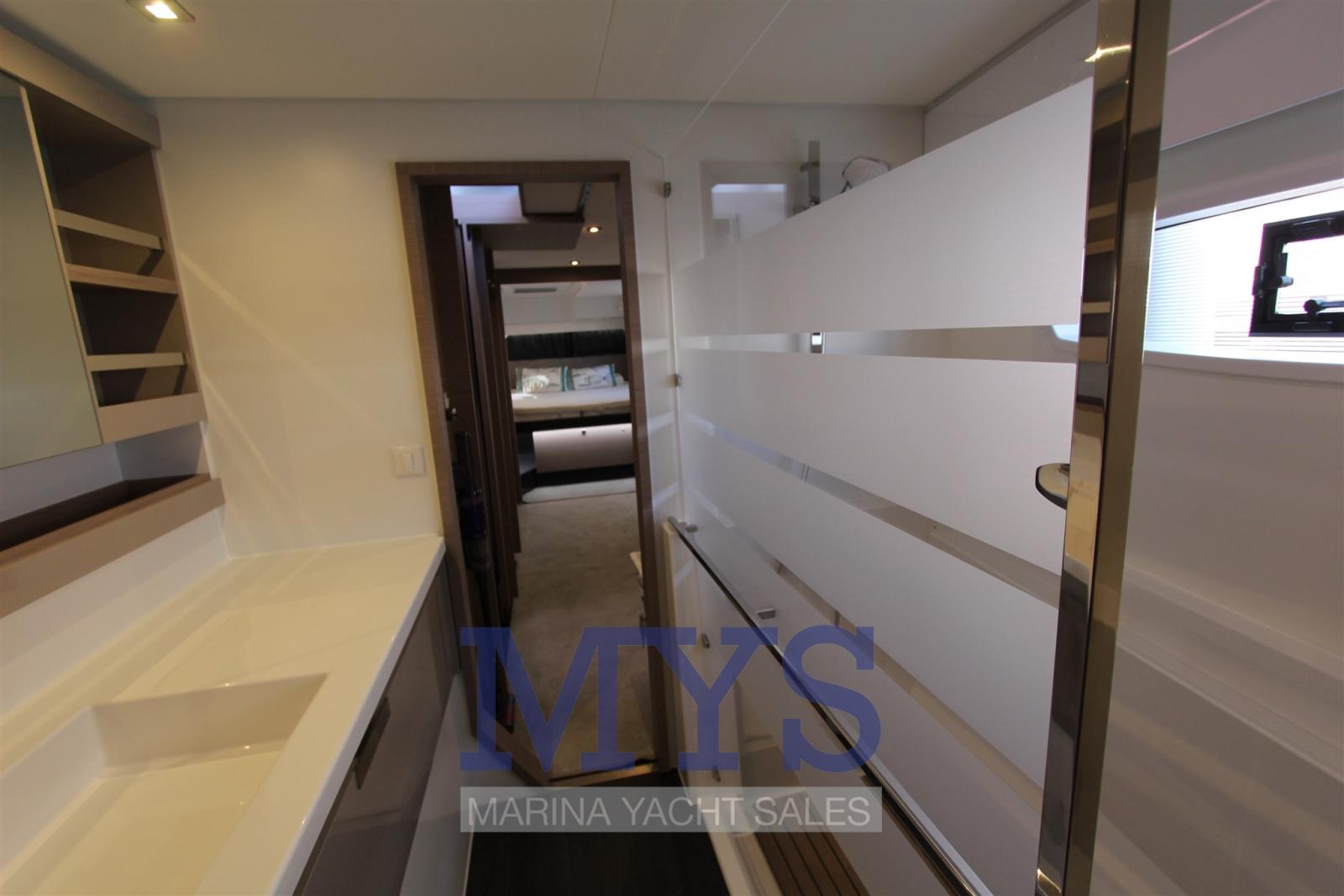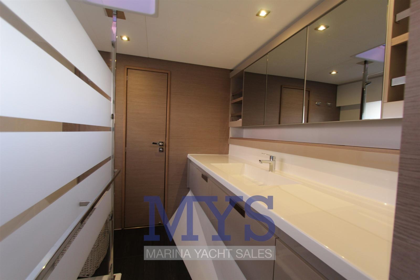 Cabine principale dans la coque bâbord qui comprend un lit double, un coin bureau avec armoires, une salle de bain privée avec cabine de douche séparée