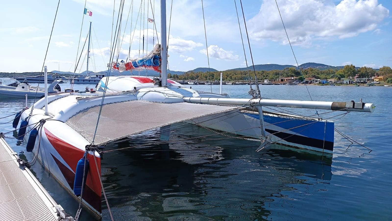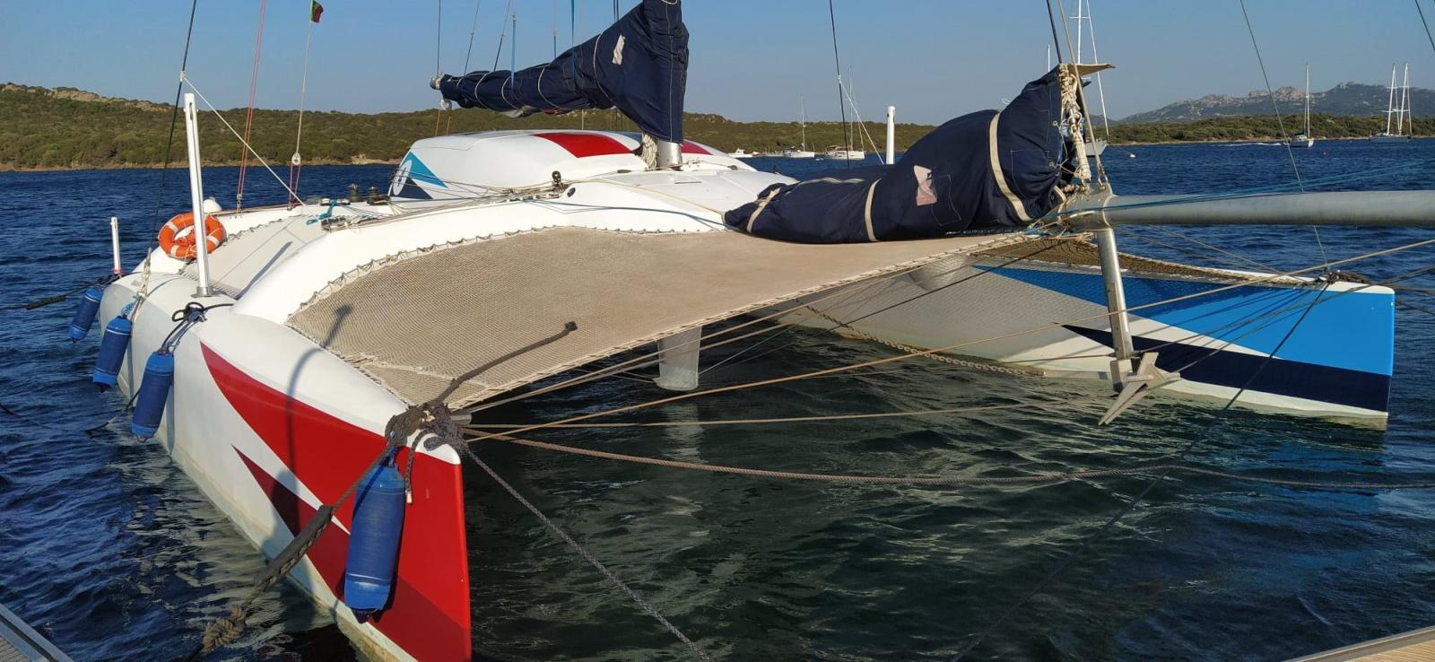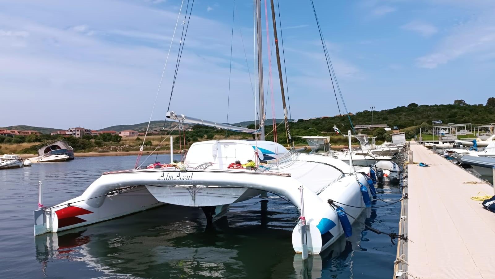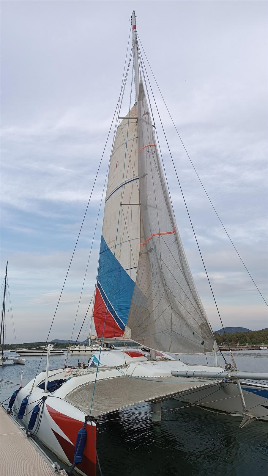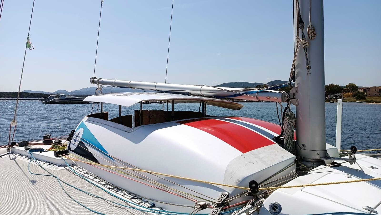 Le catamaran sur mesure de Crowther en matériau composite. Rouf relevable en 2 parties pour dinette et salle de bain et cuisine Dériveurs mobiles avec contrôle depuis le cockpit tels que les pales de gouvernail FB moteur dans un compartiment spécial ; Lever. De nombreuses voiles