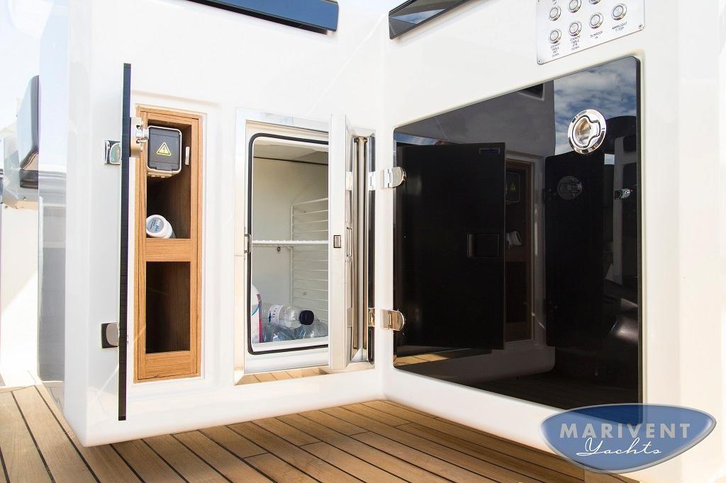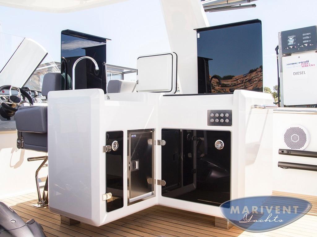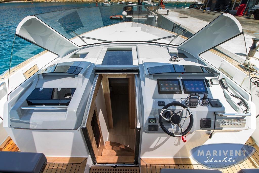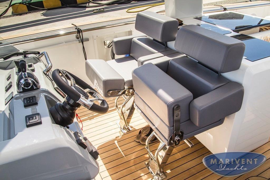 AIS (Raymarine AIS650, Class B emisor/receptor), Indicateur d'angle de barre, Commande électrique (Volvo Penta EVC), Ordinateur fixe de bord (C-Zone domotic system), Compteur de chaîne, Moniteur (7' Volvo Trip Computer), DSC VHF (Raymarine 260), Joystick, Pilote automatique (Raymarine evolution), 2 Lecteur de cartes (Raymarine GS125), Radar (Raymarine Quantum), 2 Siège copilote.