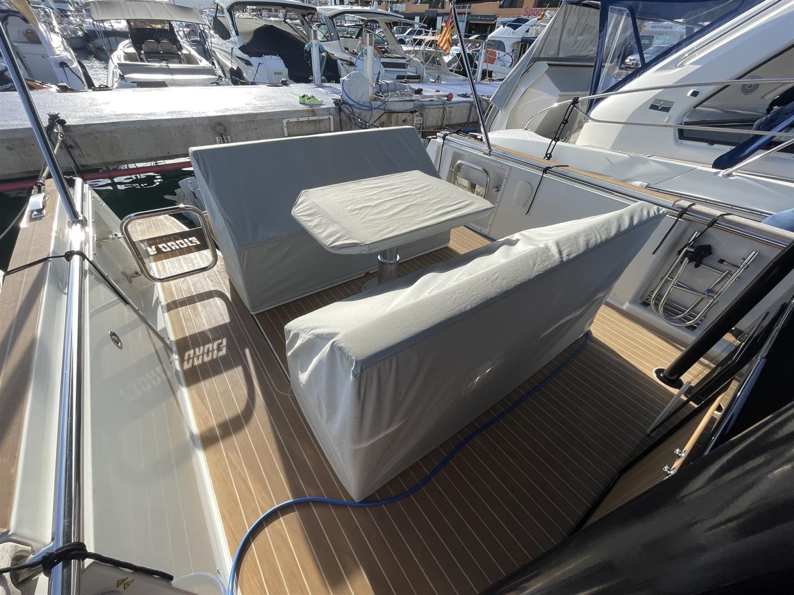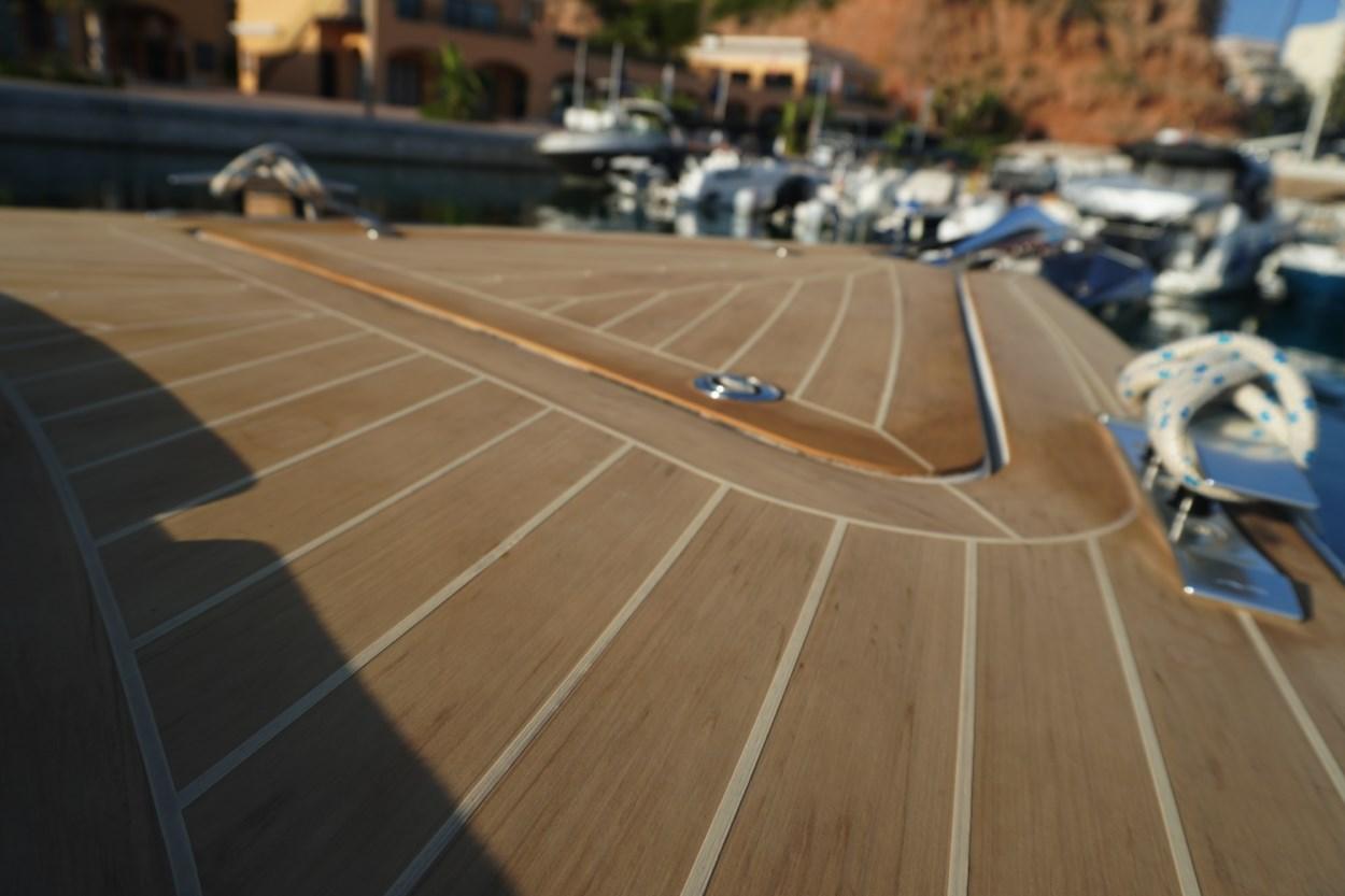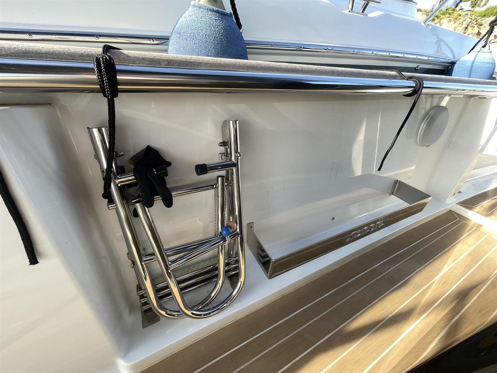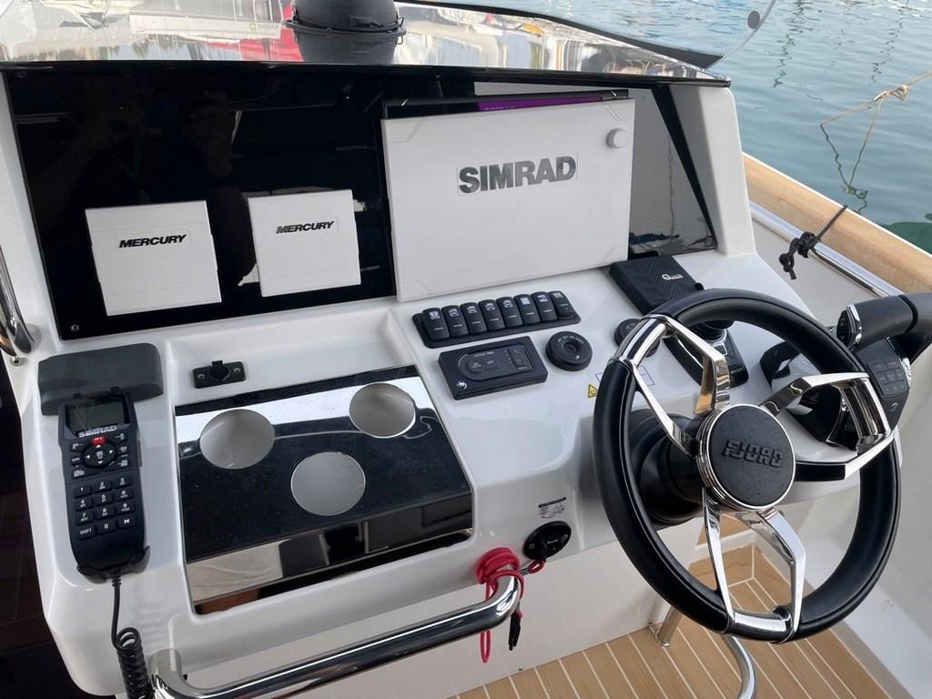 2 Alternateur, Ancre (10kg and 50m), Eau sous pression, Trim hydraulique (tilt steering system & engine active trim system), Batteries (2x90Ah + 3x160Ah AGM), 6 Taquets pliants, Passavant en teck (Synthetic scrubbed white), Câble d’alimentation à quai, Douche de cockpit, Lavabo dans le cockpit, Panneau solaire, 6 Défenses, 2 Plateforme arrière (Extended), Pompe de Vidange du Réservoir d’Eaux Usées, Pompe de cale automatique, 2 Pompe de cale électrique, Pompe de cale manuelle, Pont en teck (Synthetic scrubbed white), Porte latérale, Cockpit en teck (Synthetic scrubbed white), Guindeau électrique, Echelle de bain (3 steps, foldable), table de cockpit (convertible into sun pad (aft) + removable foredeck table), 2 Filières avec sortie latèrale, Corne, T-Top.