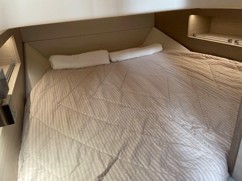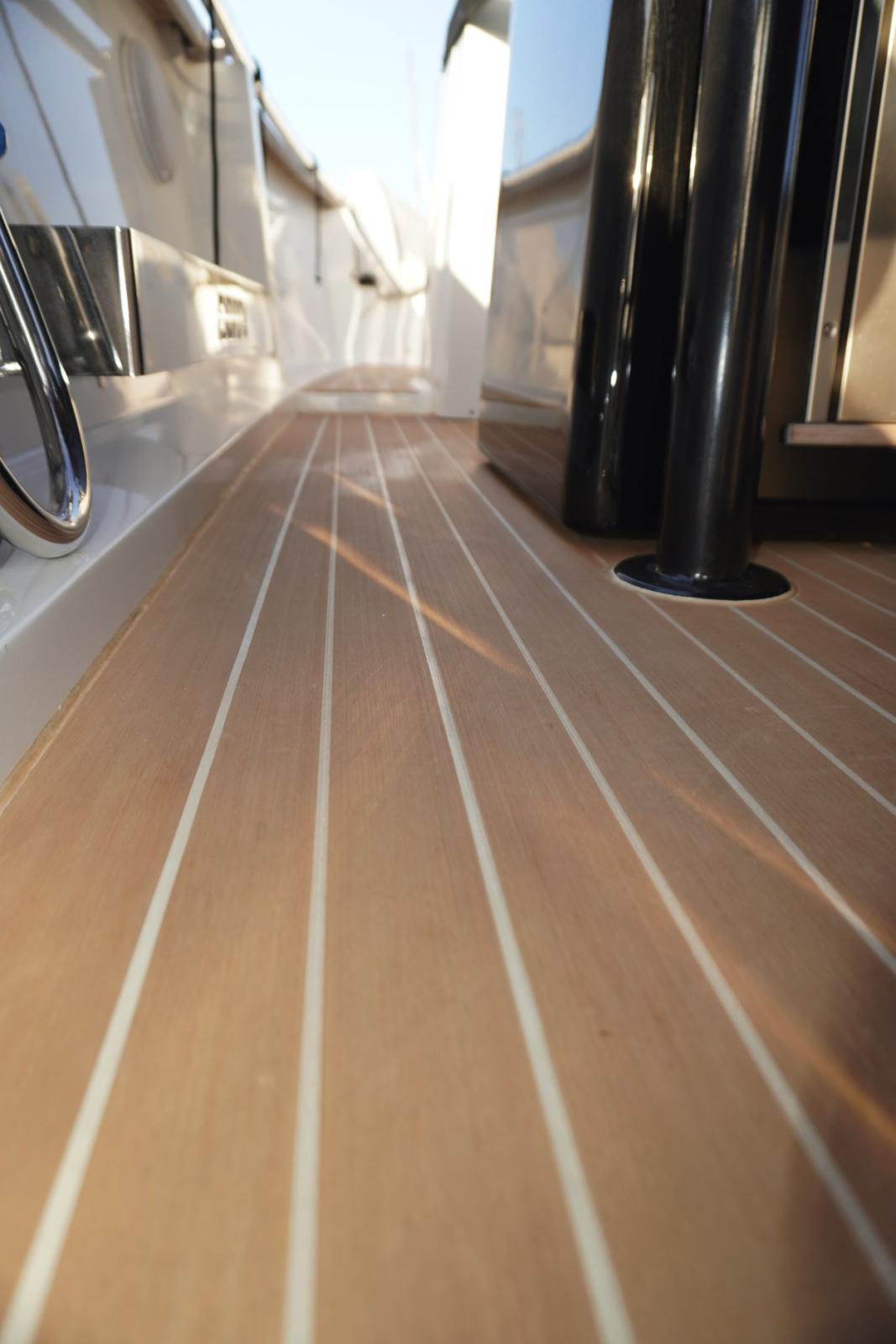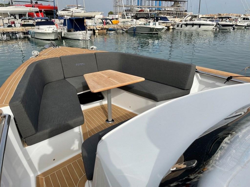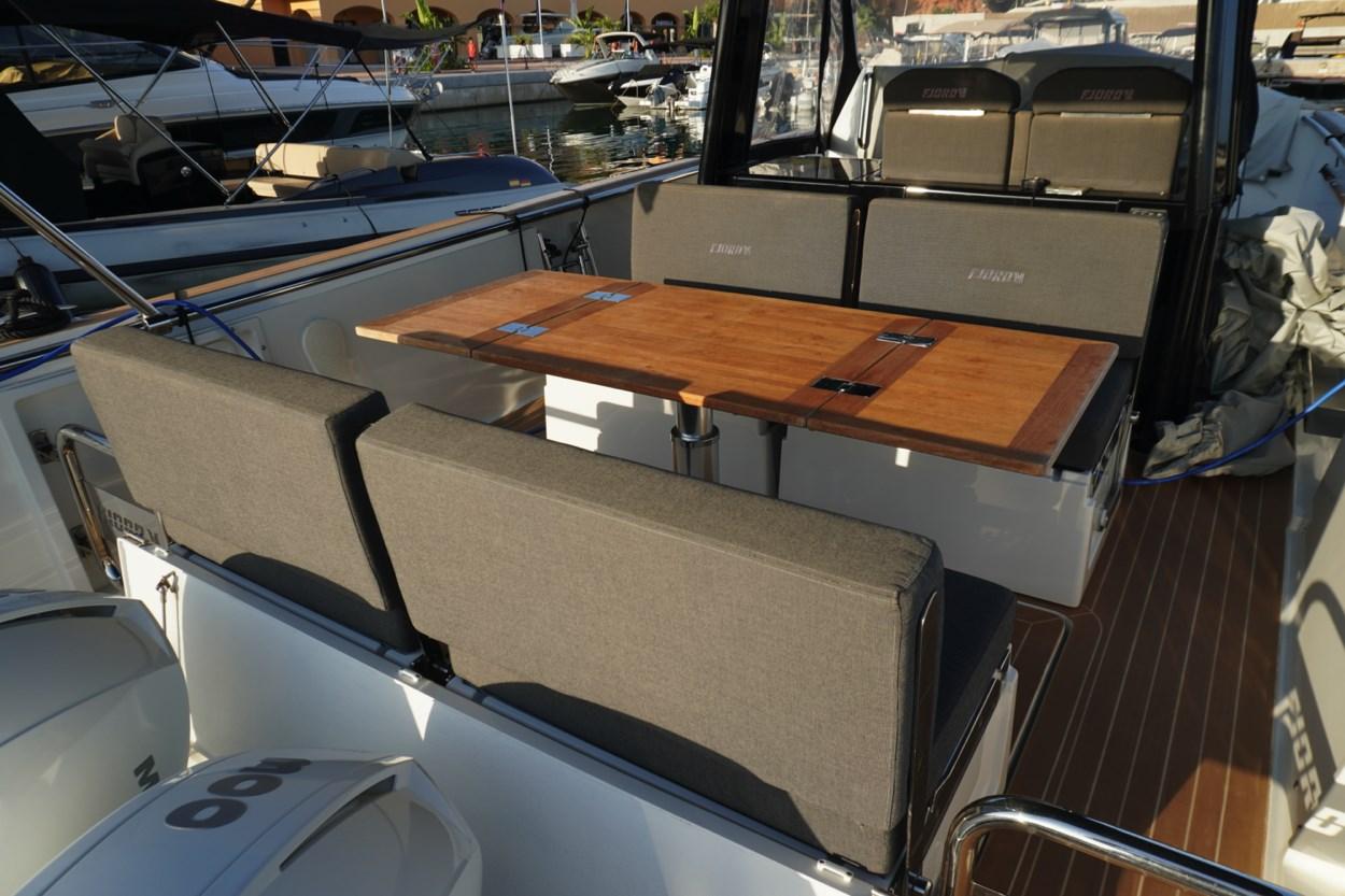 2 Alternateur, Ancre (10kg and 50m), Eau sous pression, Trim hydraulique (tilt steering system & engine active trim system), Batteries (2x90Ah + 3x160Ah AGM), 6 Taquets pliants, Passavant en teck (Synthetic scrubbed white), Câble d’alimentation à quai, Douche de cockpit, Lavabo dans le cockpit, Panneau solaire, 6 Défenses, 2 Plateforme arrière (Extended), Pompe de Vidange du Réservoir d’Eaux Usées, Pompe de cale automatique, 2 Pompe de cale électrique, Pompe de cale manuelle, Pont en teck (Synthetic scrubbed white), Porte latérale, Cockpit en teck (Synthetic scrubbed white), Guindeau électrique, Echelle de bain (3 steps, foldable), table de cockpit (convertible into sun pad (aft) + removable foredeck table), 2 Filières avec sortie latèrale, Corne, T-Top.