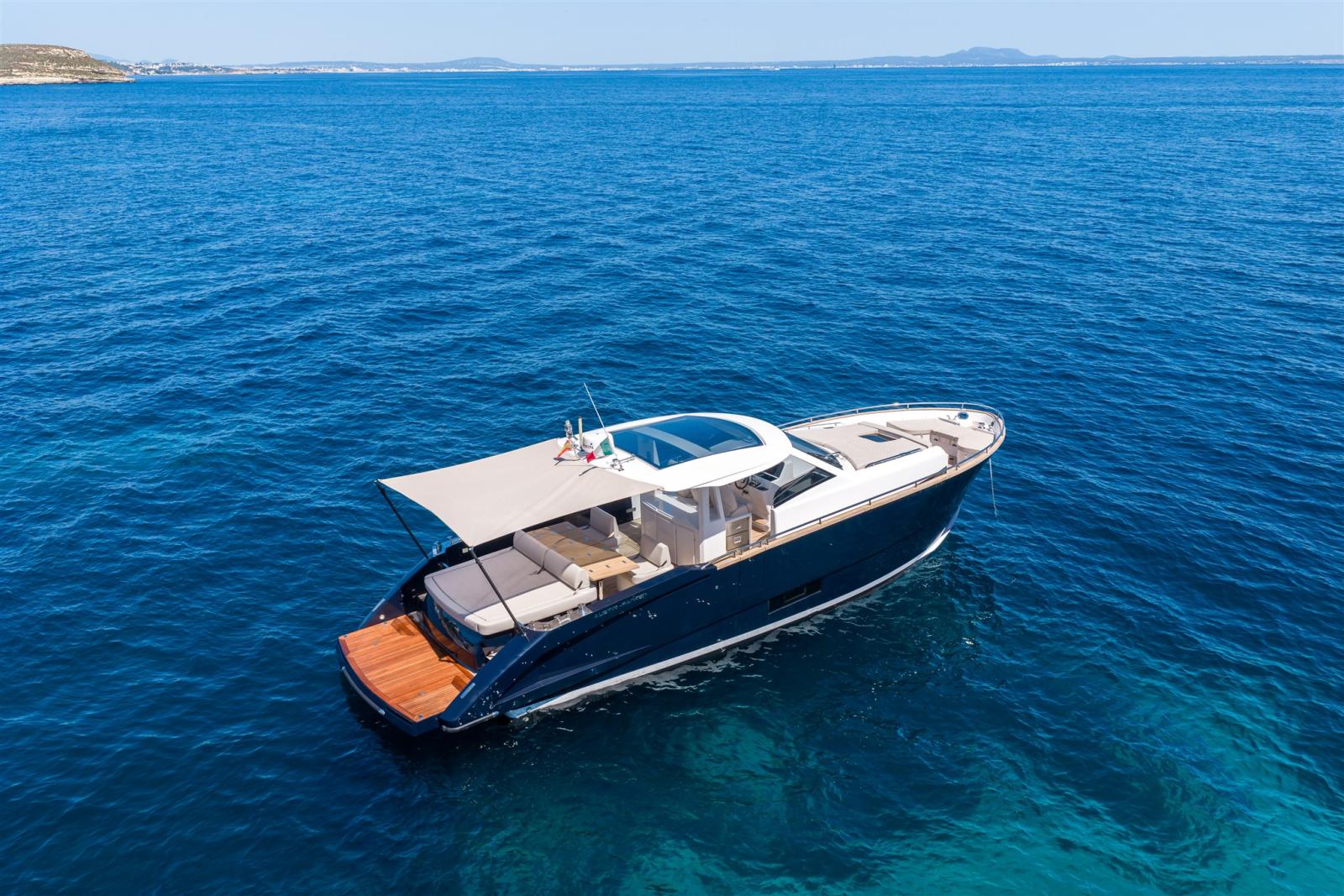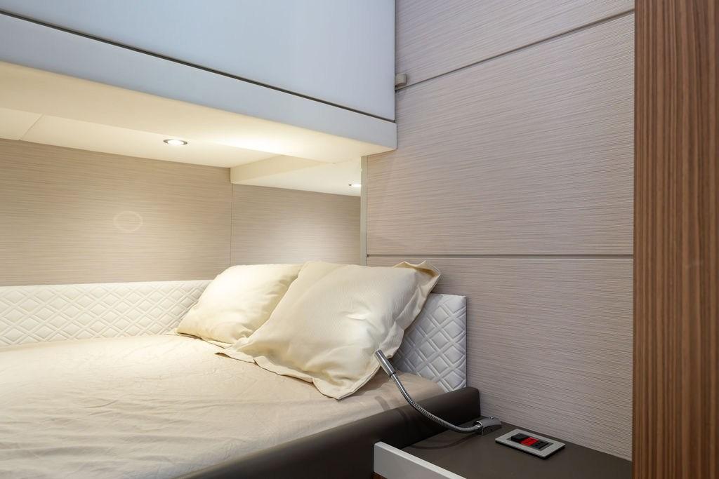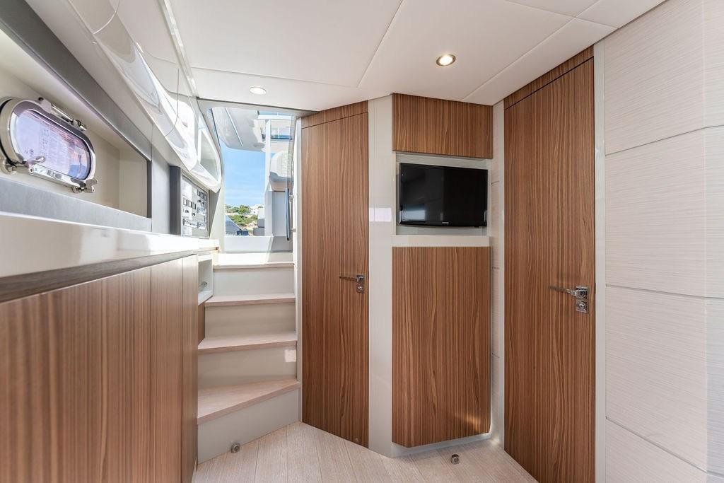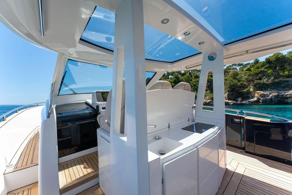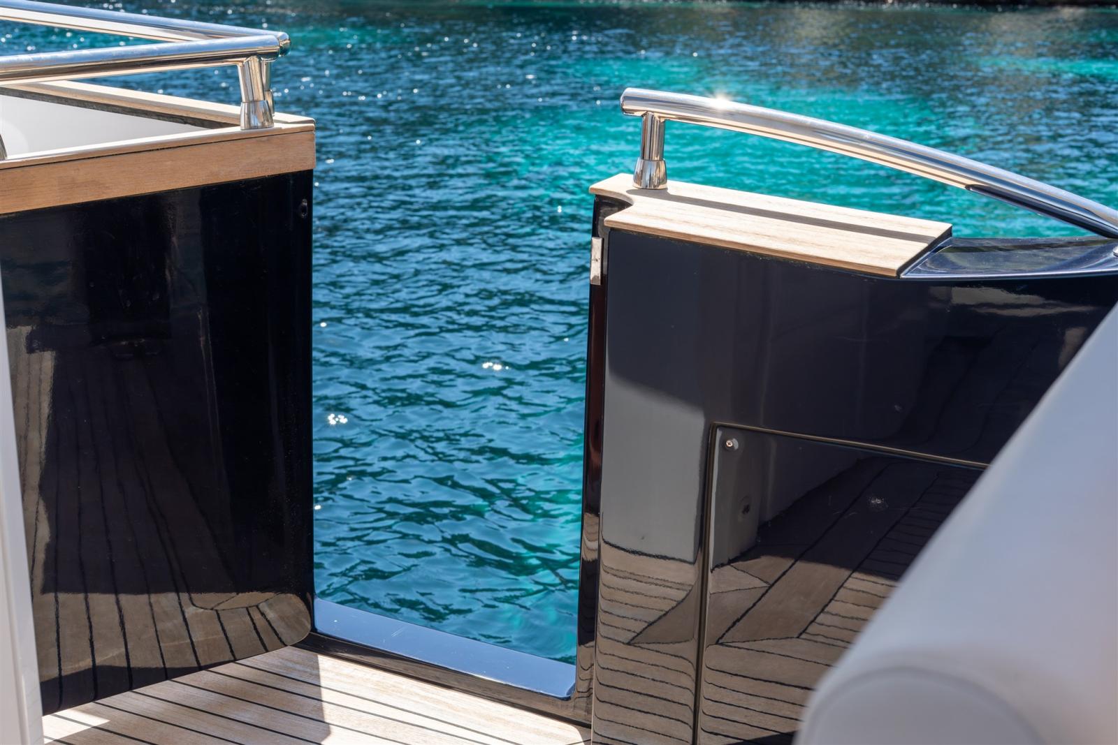Alarme moteur, 2 Alternateur, Ancre (20 Kg SS with 100m chain and bow protection), Eau sous pression, 4 Batteries (235 Ah service batteries (upgrade)), 2 Taquets pliants (aft for cross lines), Système de vidange, Couleur spéciale (Blue Navy), 2 Douche de cockpit (foredeck & swimming platform), Propulseur de poupe (joystick integrated), Propulseur d'étrave (joystick integrated), Phare de poursuite, 2 Flaps hydrauliques (BCS), Garage à annexe (with hydraulic opening), Extincteur(s) fixe(s), Indicateurs de flaps (BCS), Lavage de chaine, Lavabo dans le cockpit, Éclairage de courtoisie, 6 Défenses, Passerelle (Hydraulic Opacmare), Plateforme arrière (extended with hydraulic tender lift), Pompe de cale automatique, 4 Pompe de cale électrique, Pompe de cale manuelle, Pont en teck, Porte latérale (Sliding), 2 Porte latérale, Prise de quai, Guindeau électrique, Echelle de bain (foldable - fitted in platform storage), 2 table de cockpit (with teak), 2 Filières avec sortie latèrale, Corne, T-Top, 2 Winch électrique arrière, Winch électrique avant.