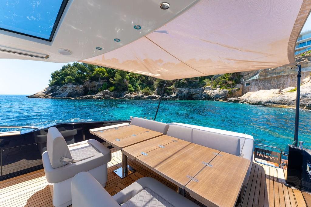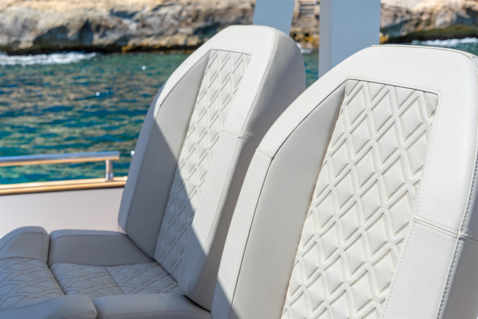 Bimini (Aft mesh attached to the Ttop with 2 poles (upgrade)), Coussins arrieres (Aft sun pad with foldable backrest and bench), 6 Coussin avant (Foredeck sunpad with bench + U-shaped bench), 2 sellerie de cockpit (for benches with foldable backrests), Tauds de pare-brise (Mesh), 5 Taud de console (and dashboard cover), 8 Taud de siège (for pilot seats, benches, galley and sunpads).