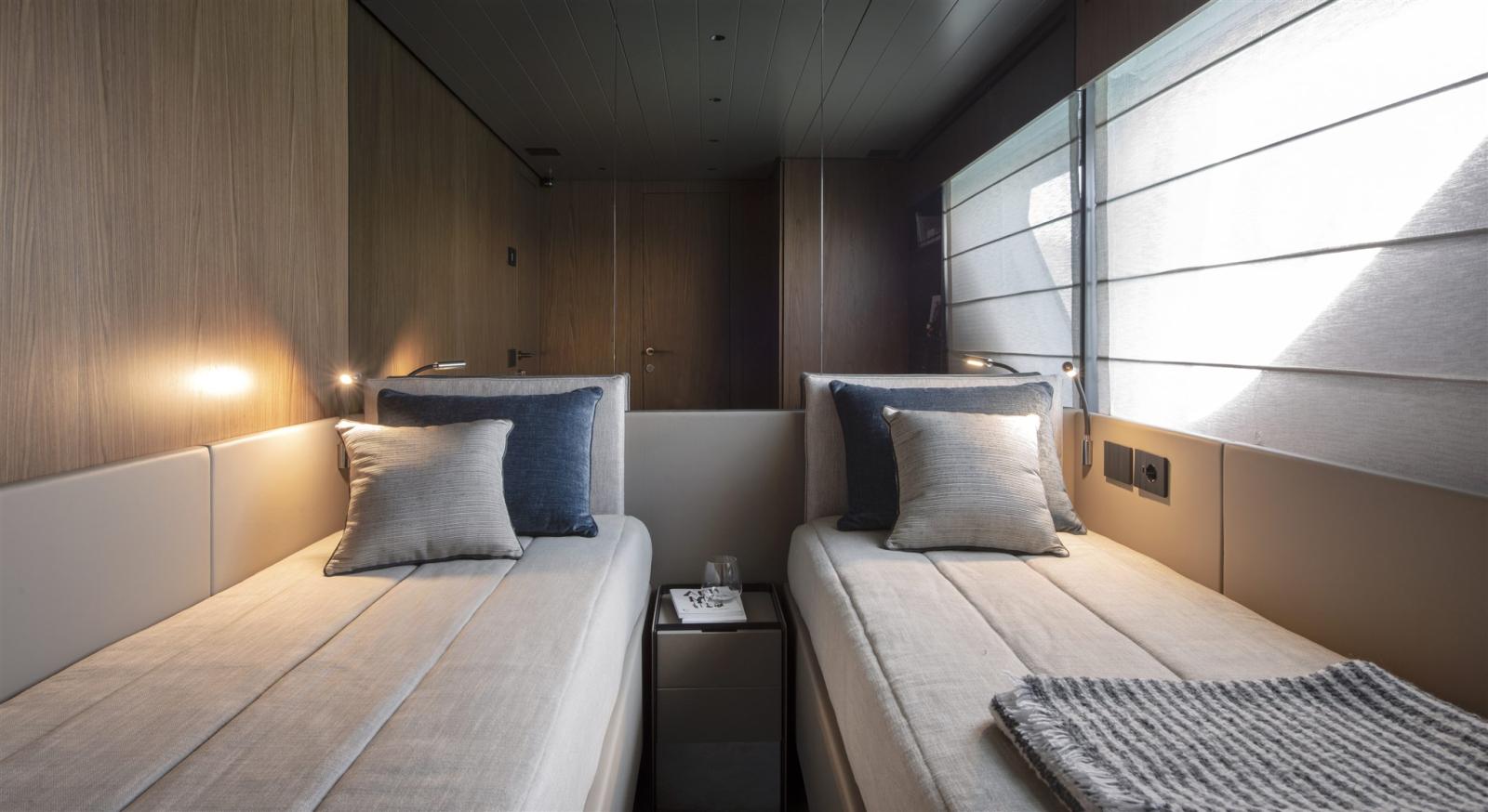 Air conditionné (Tropical A/C 96.000 BTU), Ballon d'eau chaude, Dessalinisateur (180 l/h), Convertisseur (3.000 W), Plancher intérieur en bois, Réservoir d'eau noire, 4 Toilettes électriques.