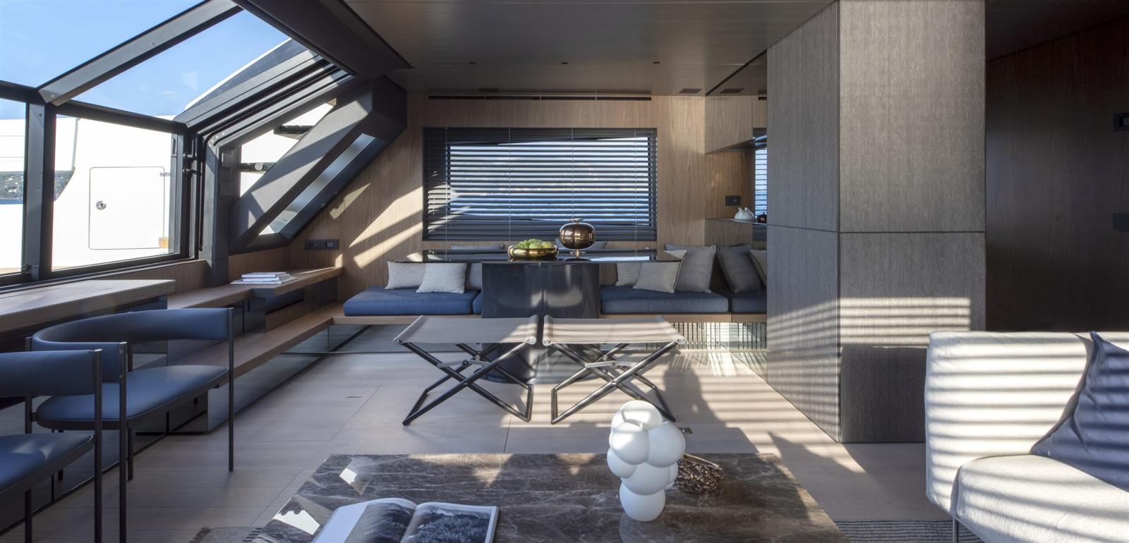 3 Bimini (at foredeck and aft lounges and beach area with 2 carbon poles each), Taud de cockpit (stratoglass cockpit enclosure), Supplément bain de soleil (on top of hard top), Taud de console.