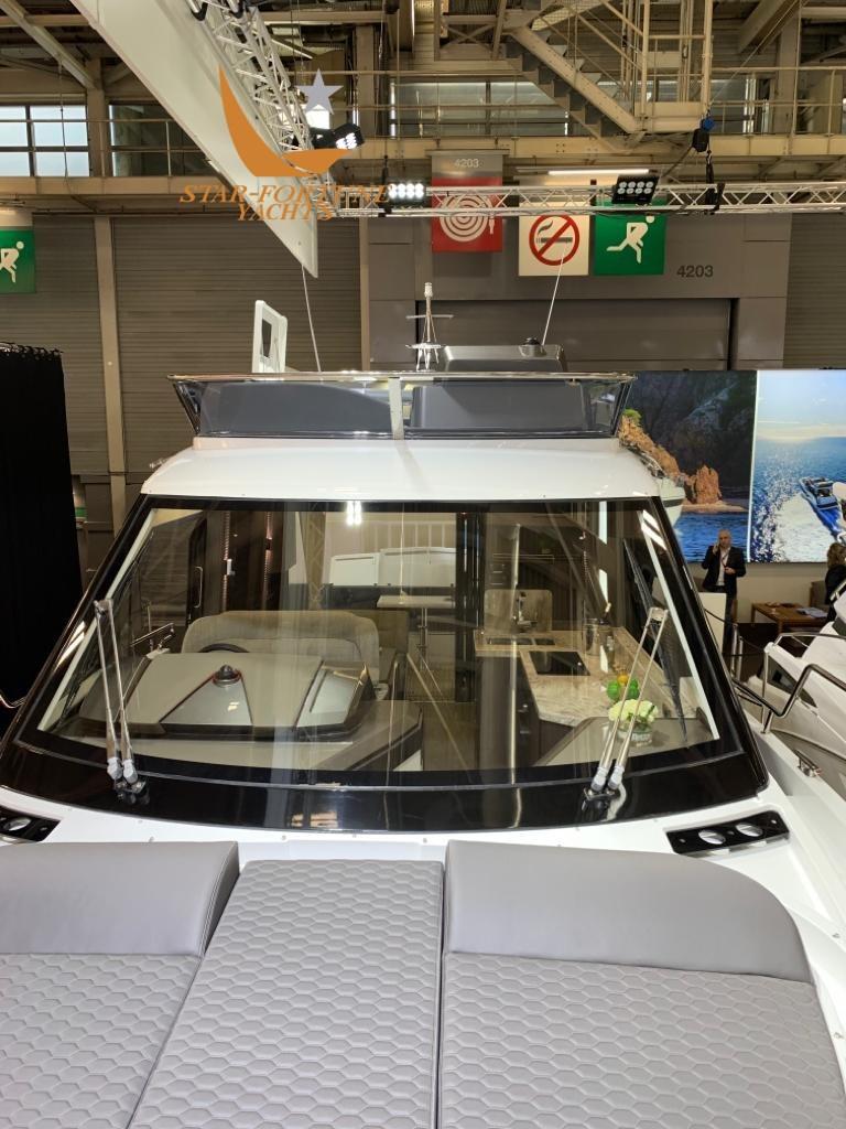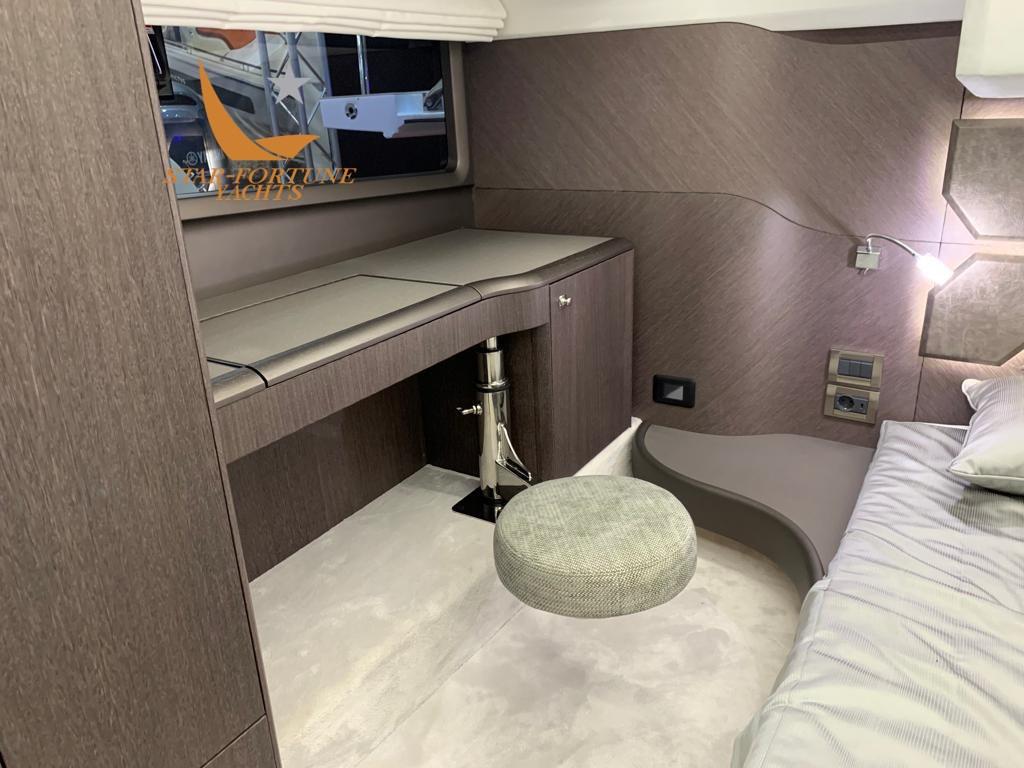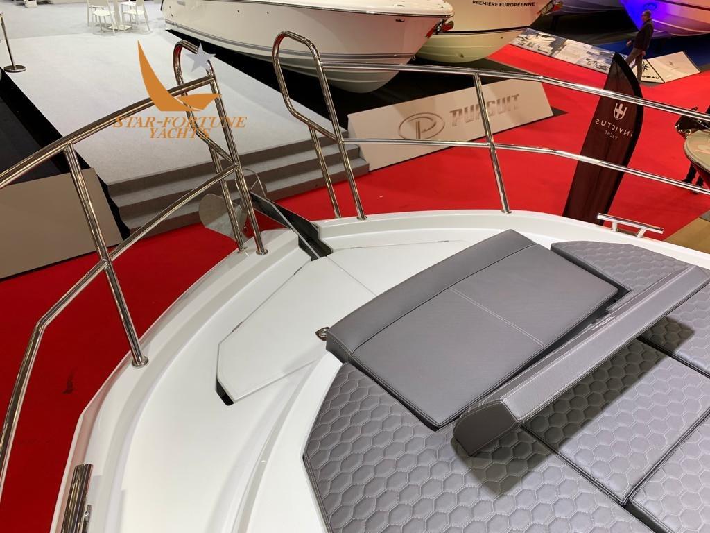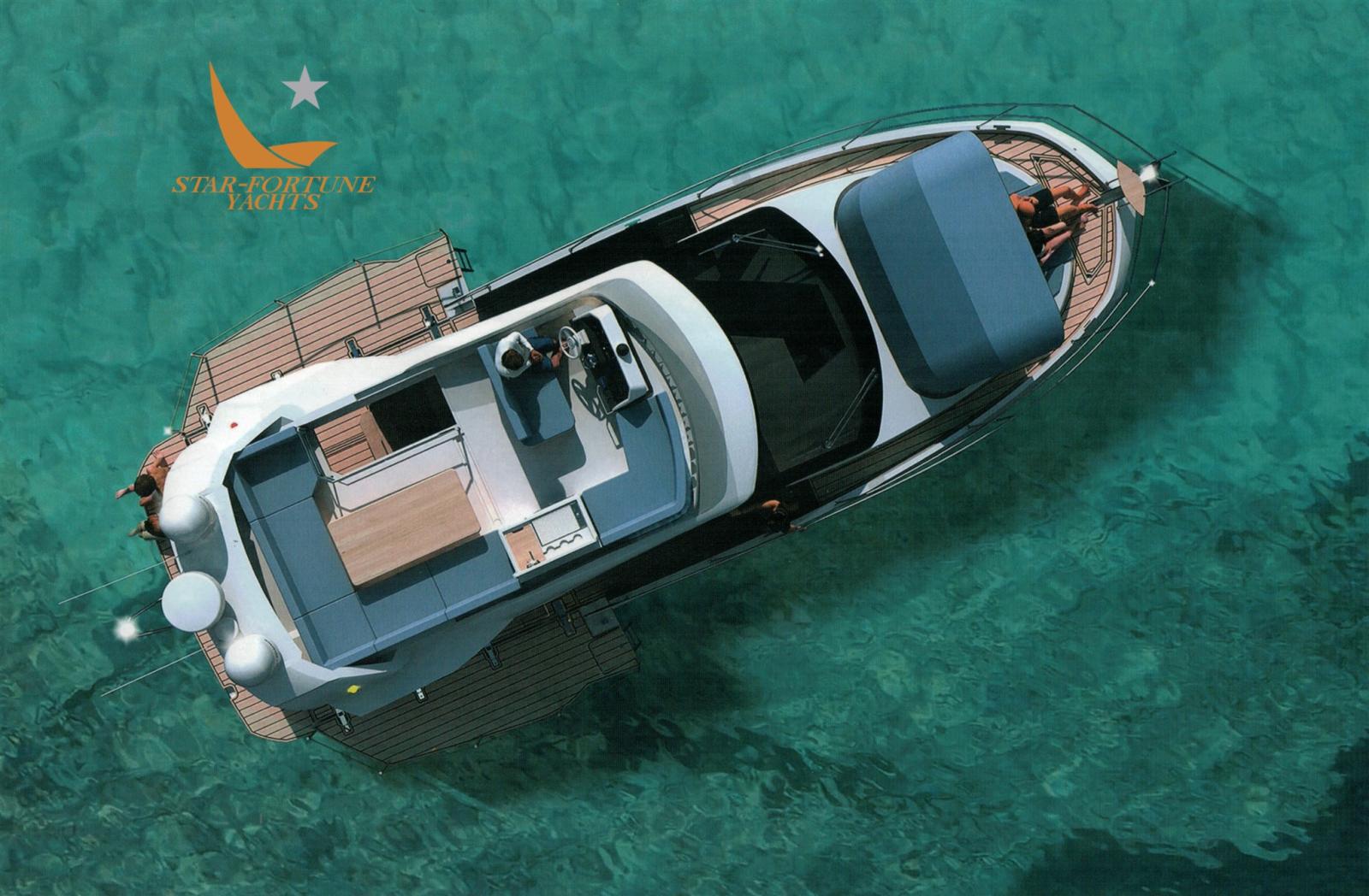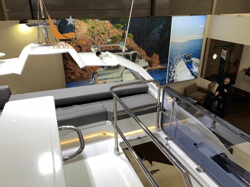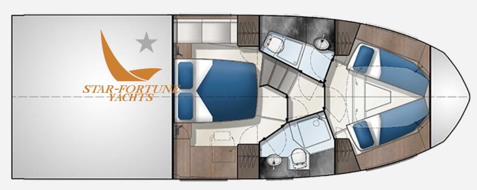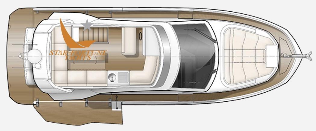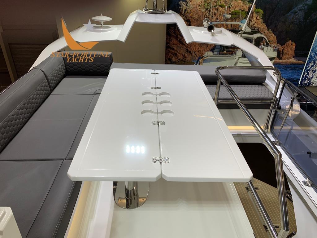 Le cockpit arrière offre un espace fonctionnel et bien pensé, avec un canapé et une table qui peuvent être convertis en bain de soleil. Le cockpit avant est un espace de loisirs, avec un grand matelas solaire. La version standard du yacht est propulsée par deux moteurs Volvo Penta avec affichage numérique.