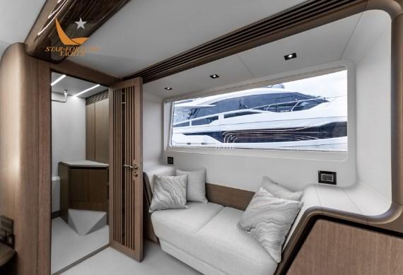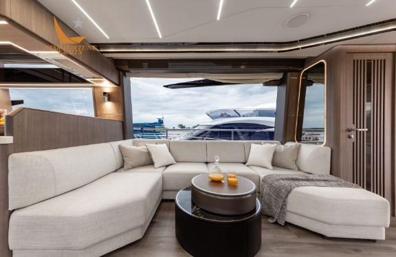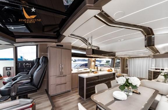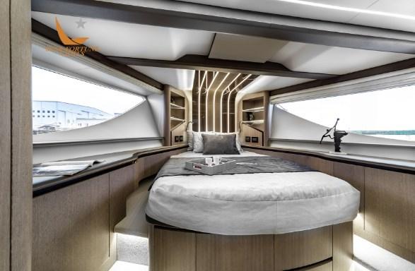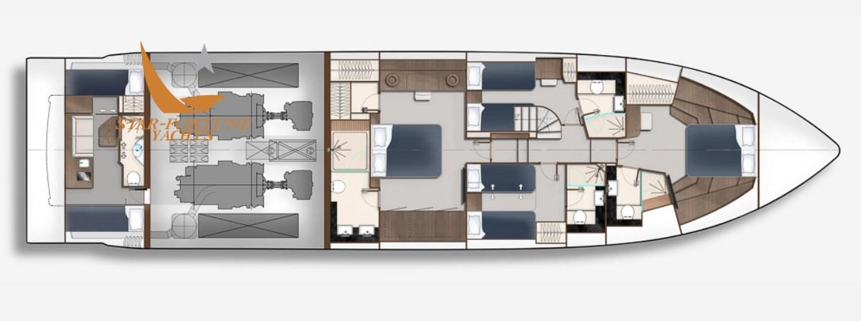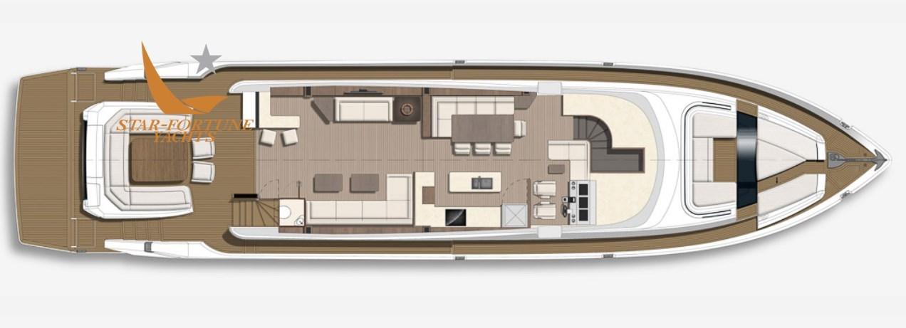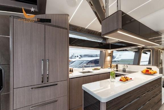 Les éléments de structure en fibre de carbone ont permis d’augmenter la surface du pont supérieur, de sorte que nous pouvons y offrir non seulement un double poste de pilotage, un bar entièrement équipé, un bain de soleil confortable, quatre tables qui peuvent être adaptées aux besoins des clients, mais aussi deux énormes canapés semi-circulaires séparés entre lesquels nous avons très élégamment intégré le bain à remous. Sur le pont principal, nous pouvons profiter des intérieurs qui rappellent les meilleurs appartements. Une cuisine richement équipée avec un bel îlot de cuisine attire l’attention. À côté du double poste de pilotage, il y a un canapé confortable avec une table basse et, juste à côté, une table majestueuse pour 8 personnes. Le salon meublé avec goût offre, en plus d’élégants canapés qui vous invitent à passer plus de temps confortablement dessus, également des fenêtres exceptionnellement grandes, une télévision coulissante,