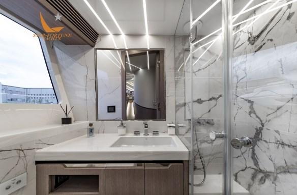 L’équipage appréciera la confortable cabine arrière du yacht, dont l’entrée est discrètement dissimulée derrière les canapés pour les invités. À l’intérieur, il y a deux lits séparés par une porte coulissante, une salle de bain attenante, une armoire, une kitchenette et un canapé confortable avec table pliante.