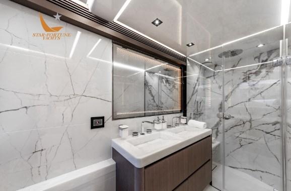 L’espace de détente arrière impressionnera tout le monde, car il offre non seulement de nombreux sièges, mais aussi beaucoup d’espace pour la tête. Le tout est complété par un rembourrage sur mesure, une terrasse en teck posée à la main, des fauteuils confortables et une table en bois. N’oublions pas la gigantesque plate-forme hydraulique qui peut transporter une tonne d’équipement. Le pont inférieur nous offre quatre cabines fantastiques avec salles de bains privatives. Chacune des salles de bains dispose d’un espace sec séparé, est richement décorée, a accès à la lumière naturelle et impressionne par ses détails en acier inoxydable que nous fabriquons nous-mêmes et finissons à la main. Au milieu du navire se trouve la cabine du propriétaire avec un grand lit double au centre et un dressing à côté. Dans la section avant, il y a une cabine VIP avec un lit double impressionnant, d’où il n’est pas nécessaire de se déplacer pour admirer les étoiles la nuit, grâce à la fenêtre aérienne géante.