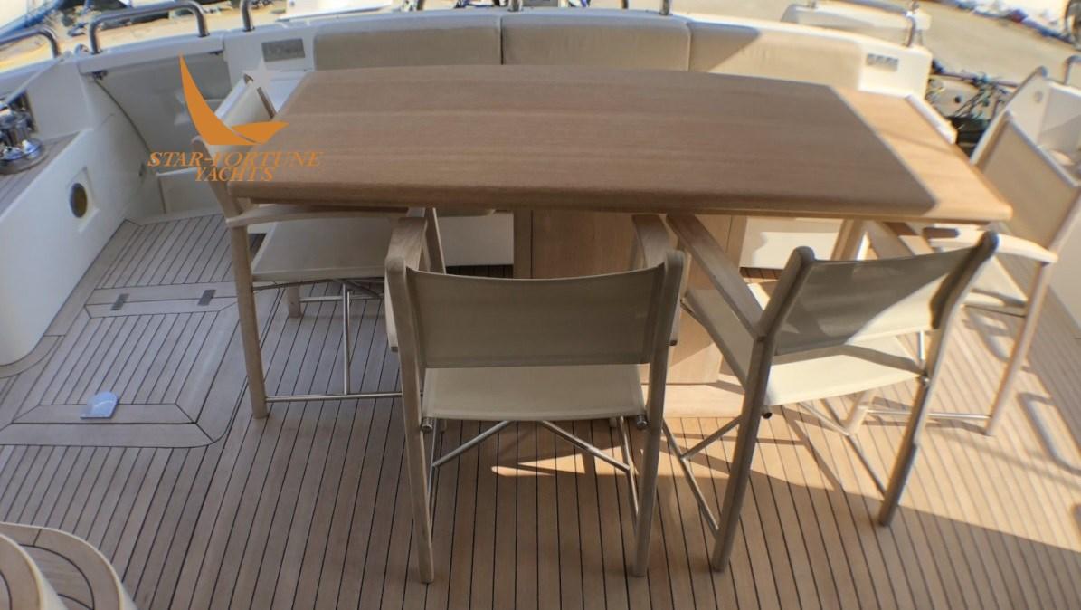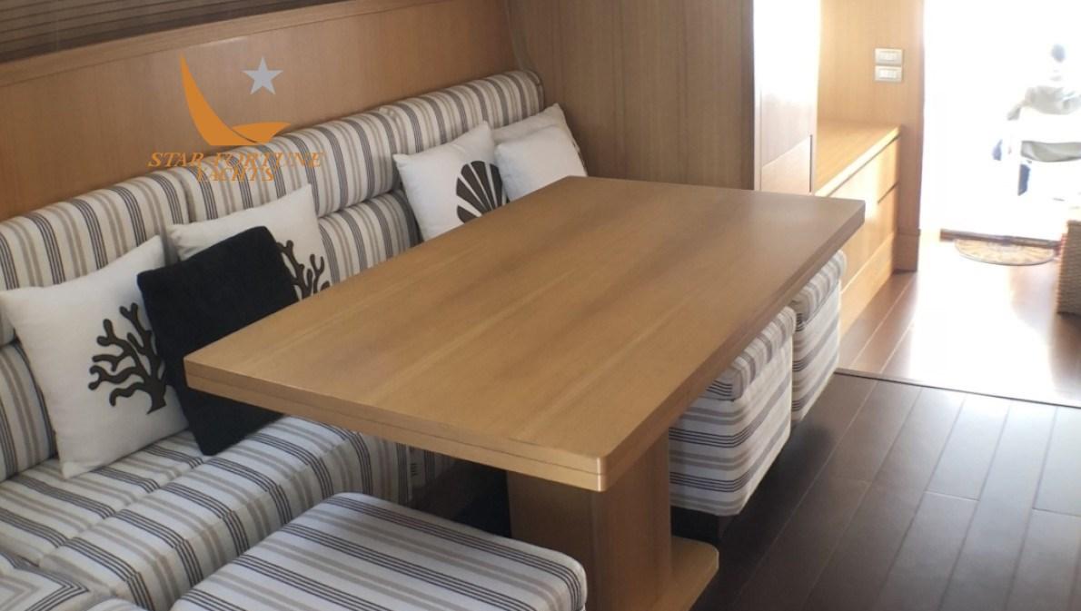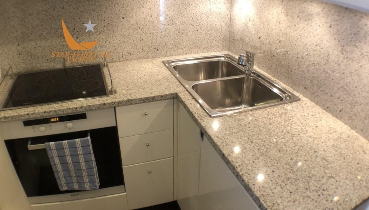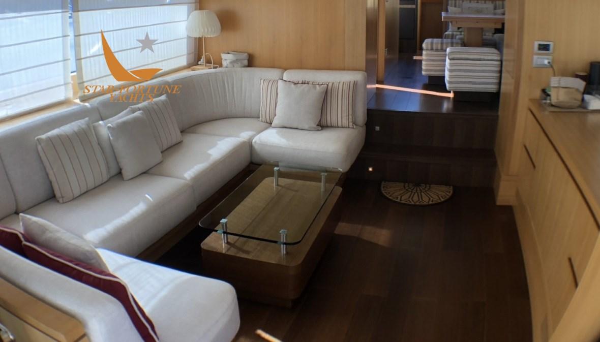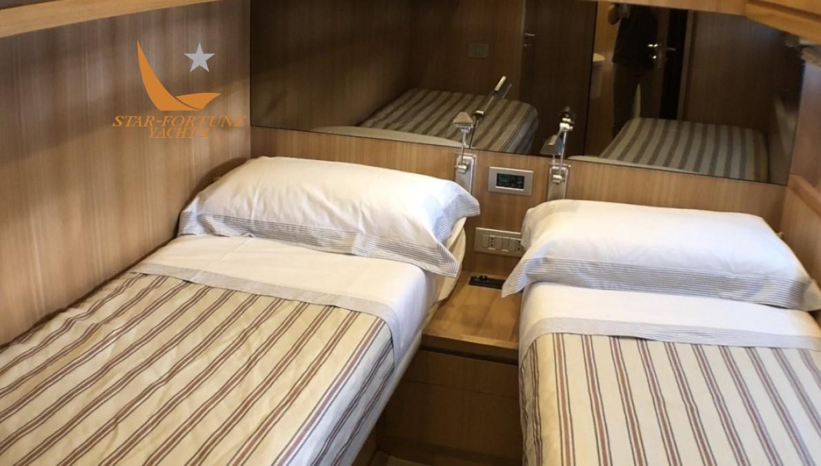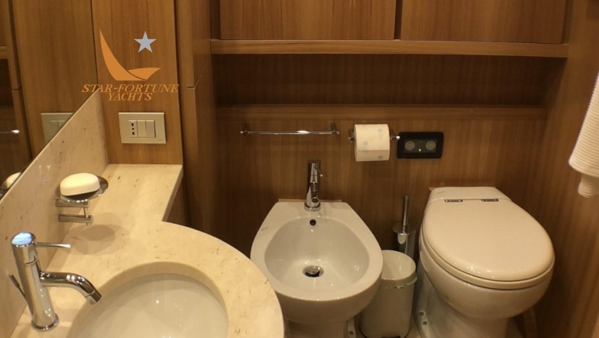 3 cabines avec salle de bain privée, 1 cabine équipage à l’avant avec 2 lits et 1 salle de bain Master Cabin Cabine principale pleine largeur avec lit double, canapé et armoire. Salle de bain privée avec douche, lavabo et bidet. En sécurité dans la cabine principale.