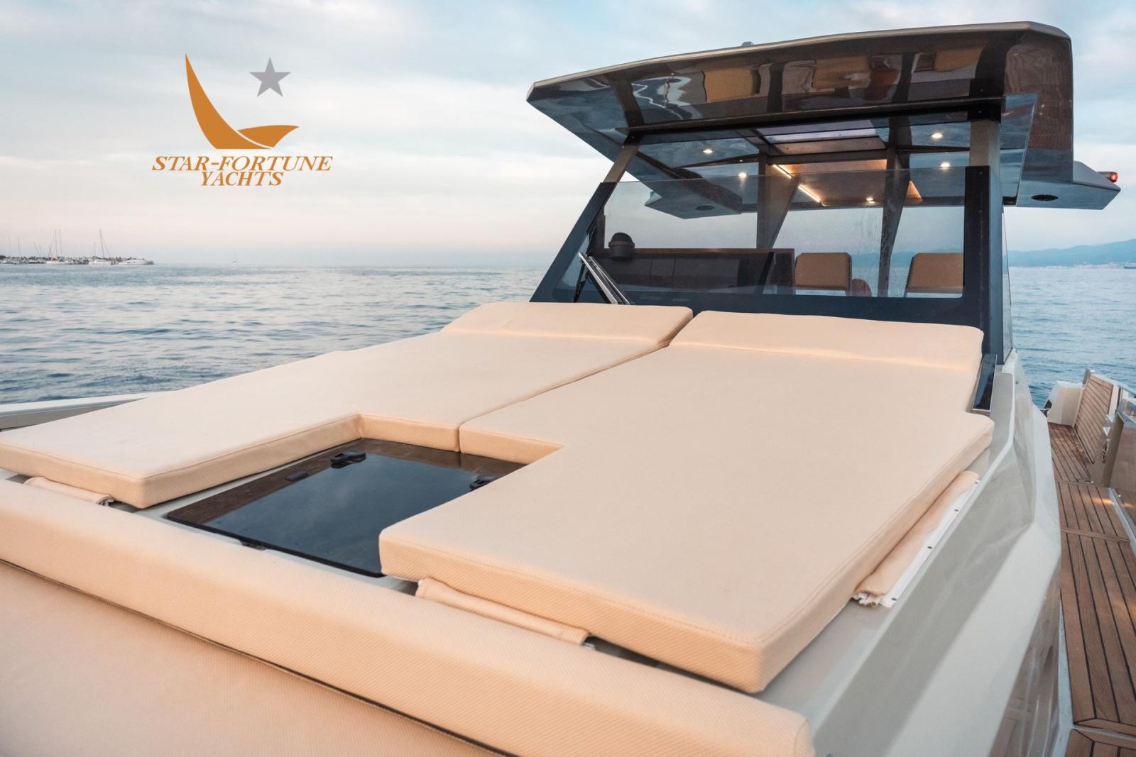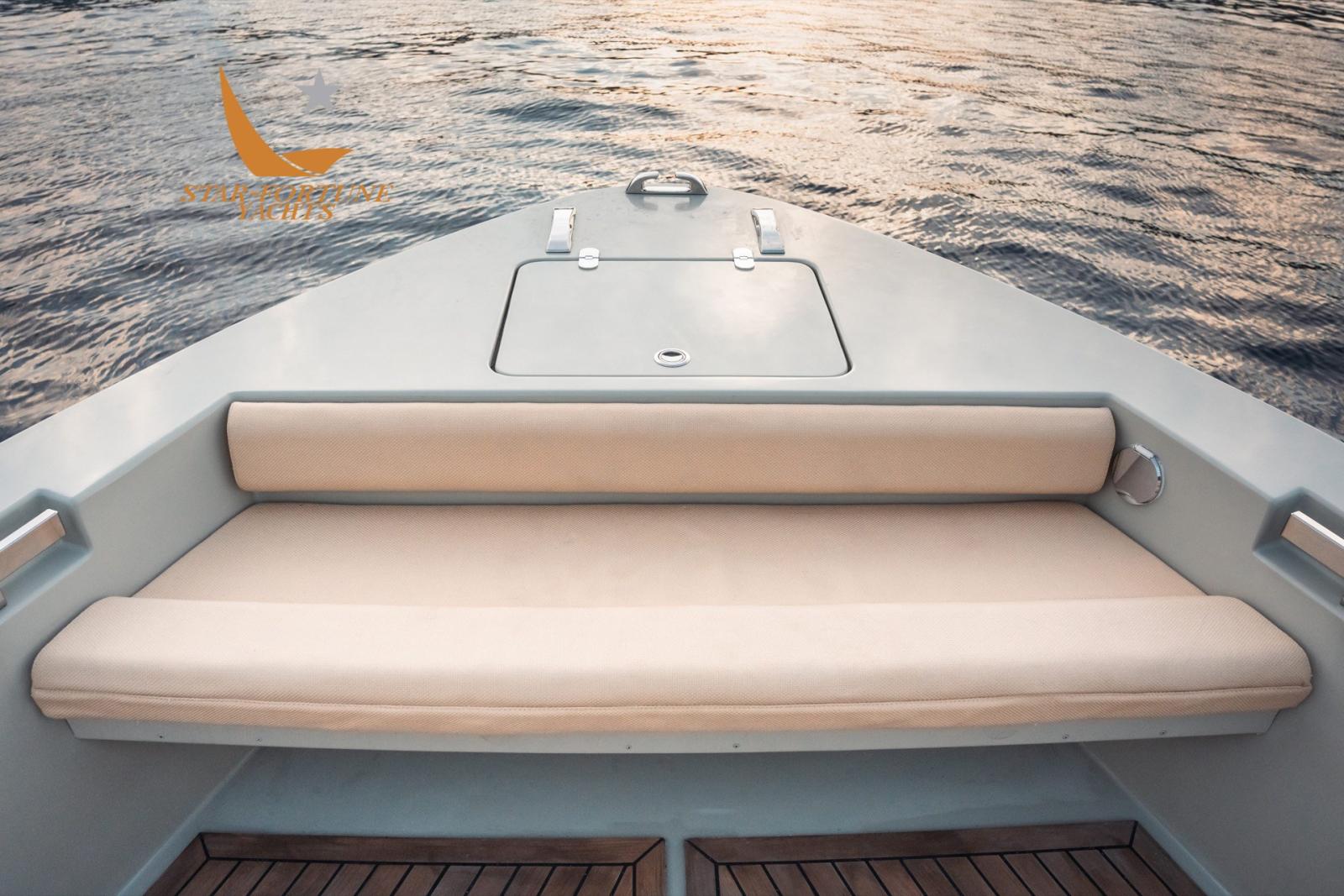 Sur ce pont, il y a une grande timonerie avec trois fauteuils, deux terrasses confortables à l’arrière et à l’avant, une grande armoire de cuisine équipée, une table extensible avec des bancs et des sièges pouvant accueillir jusqu’à 10 personnes ainsi que deux canapés à l’avant.