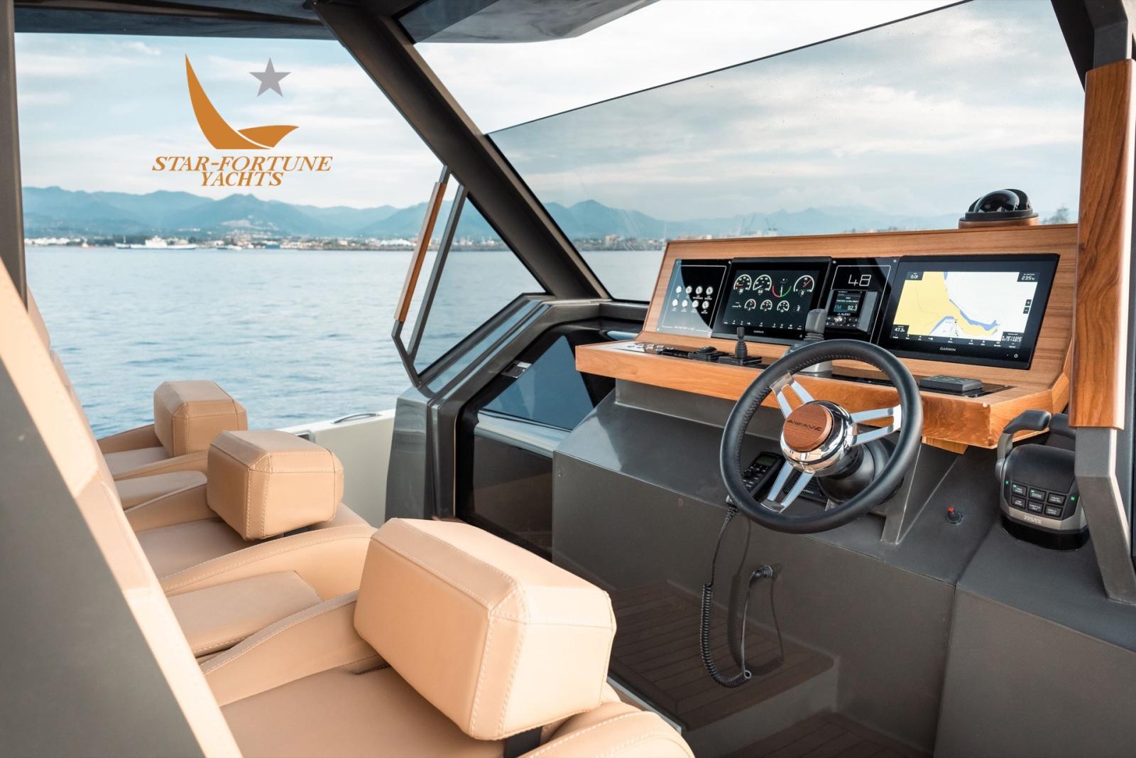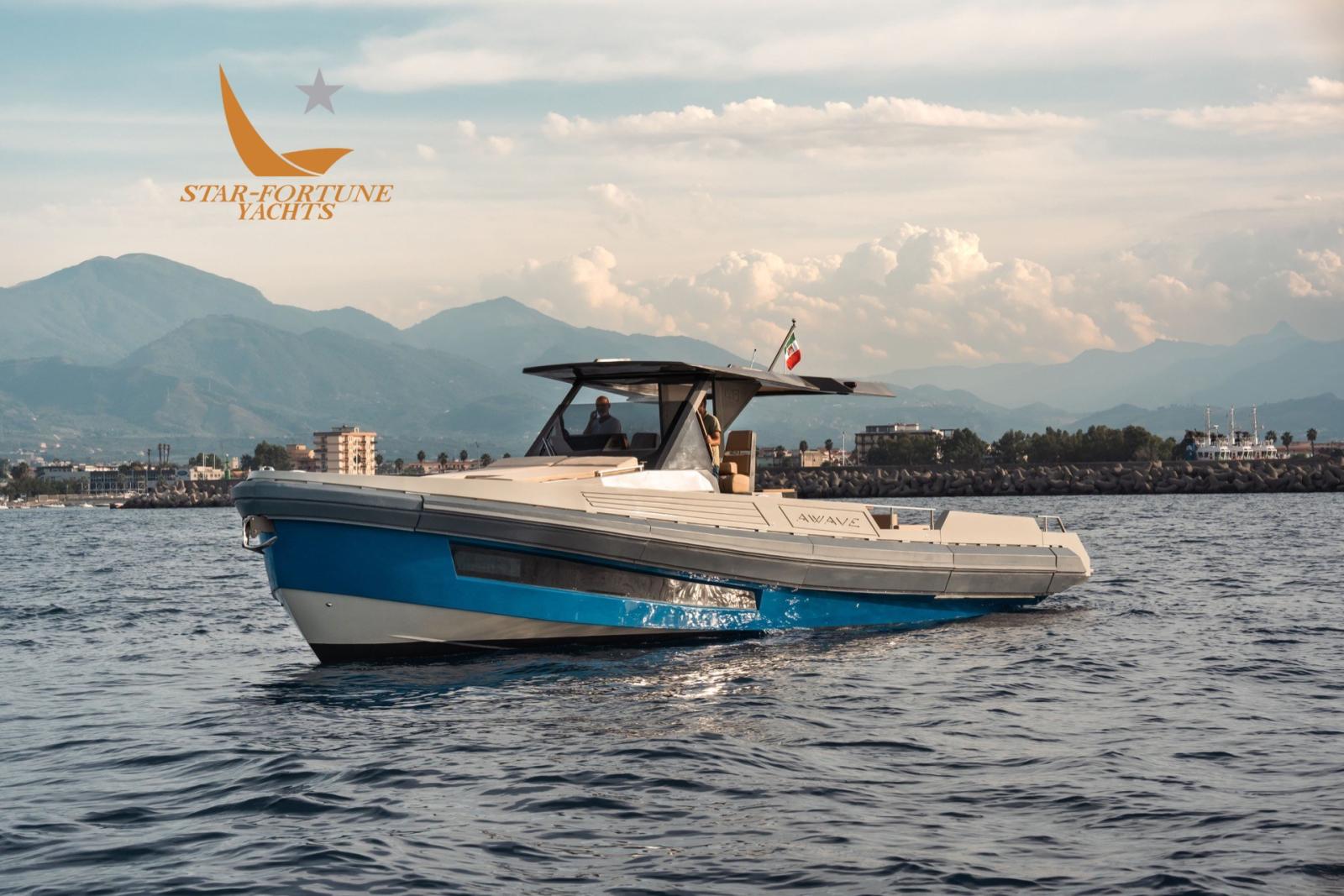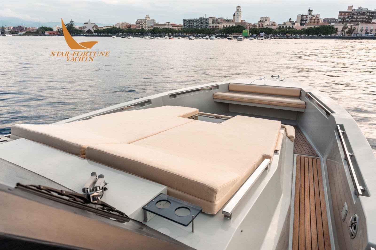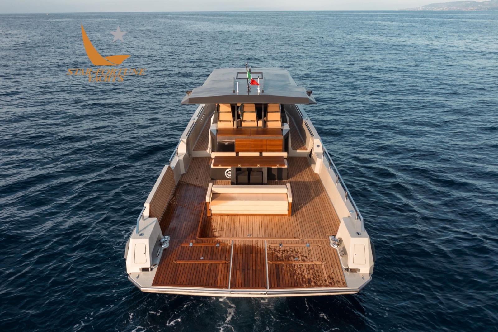 Performances brillantes de ce maxi-rib équipé d’un moteur sterndrive composé de 2 moteurs Volvo Penta de 430ch chacun qui lui permet d’atteindre une vitesse maximale de 36 nœuds. Pour obtenir de meilleures performances, vous pouvez installer 3 moteurs hors-bord de 450 ch chacun. Le pont couvert, avec une grande surface totale de m². 52, grâce également à ses deux terrasses mobiles, accueille confortablement les invités permettant à ce maxi-rib d’être utilisé également comme bateau de fête.