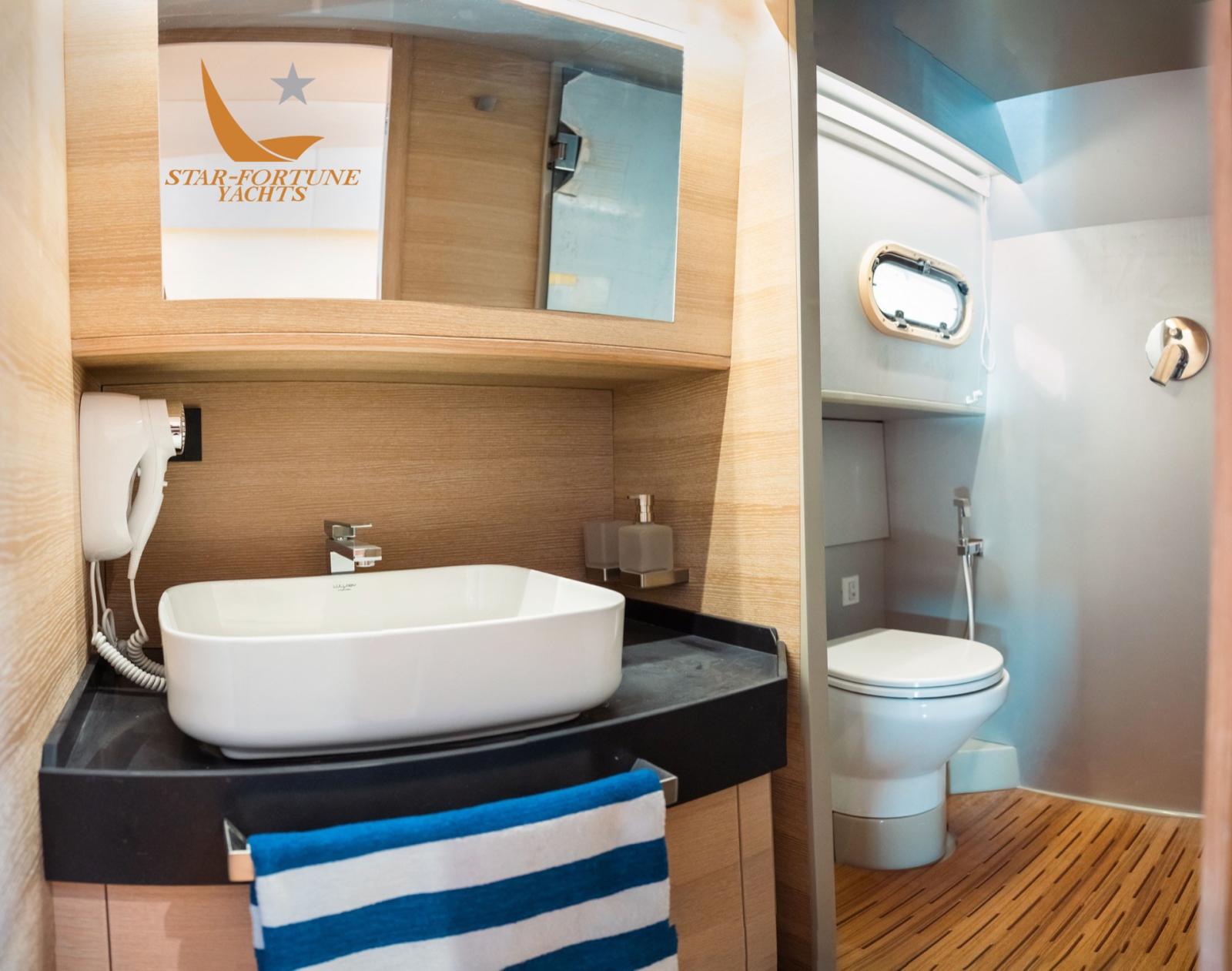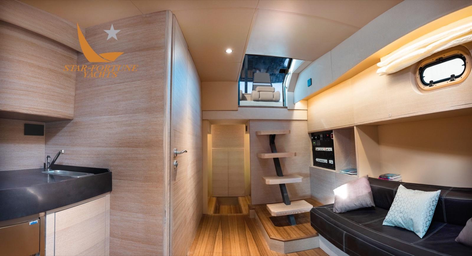 Le pont sous le pont bénéficie de grands espaces en hauteur; Il y a une cabine avant confortable également équipée de deux armoires, une salle à manger centrale équipée d’un canapé et d’une armoire de service avec machine à glaçons ainsi qu’une grande cabine au milieu des navires équipée de deux grands lits sur le Français et de conteneurs de placard confortables