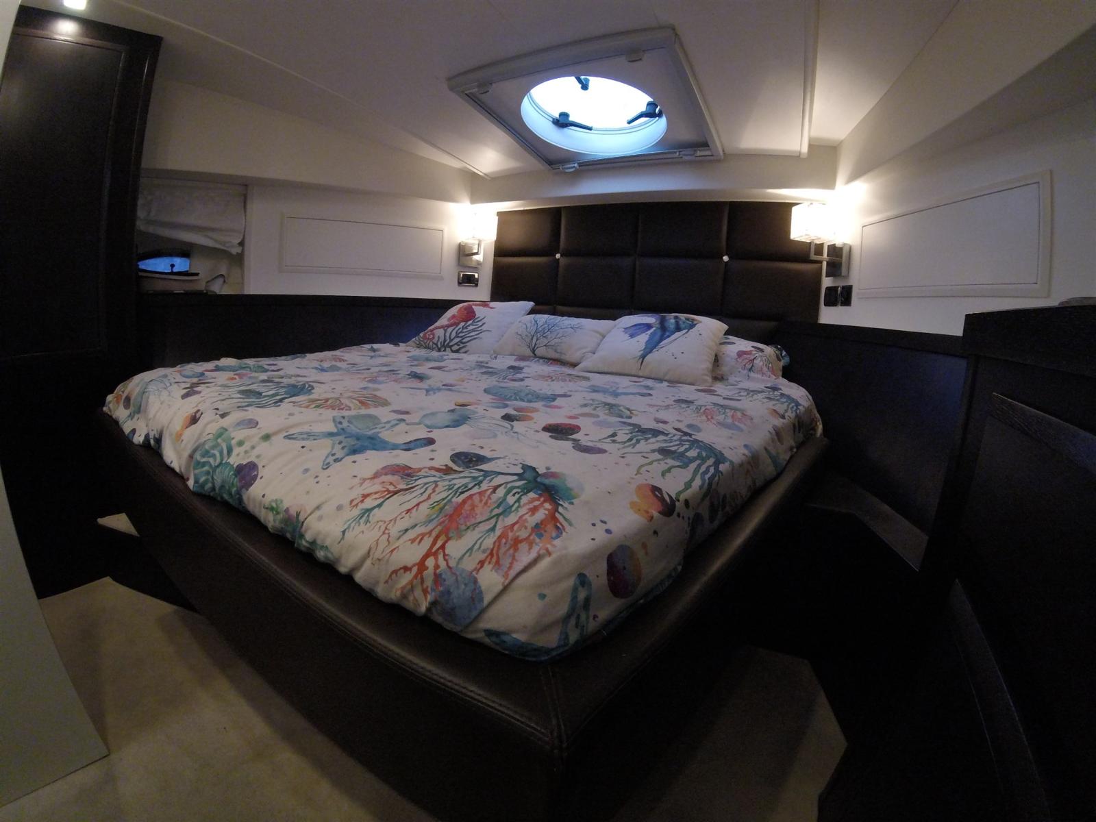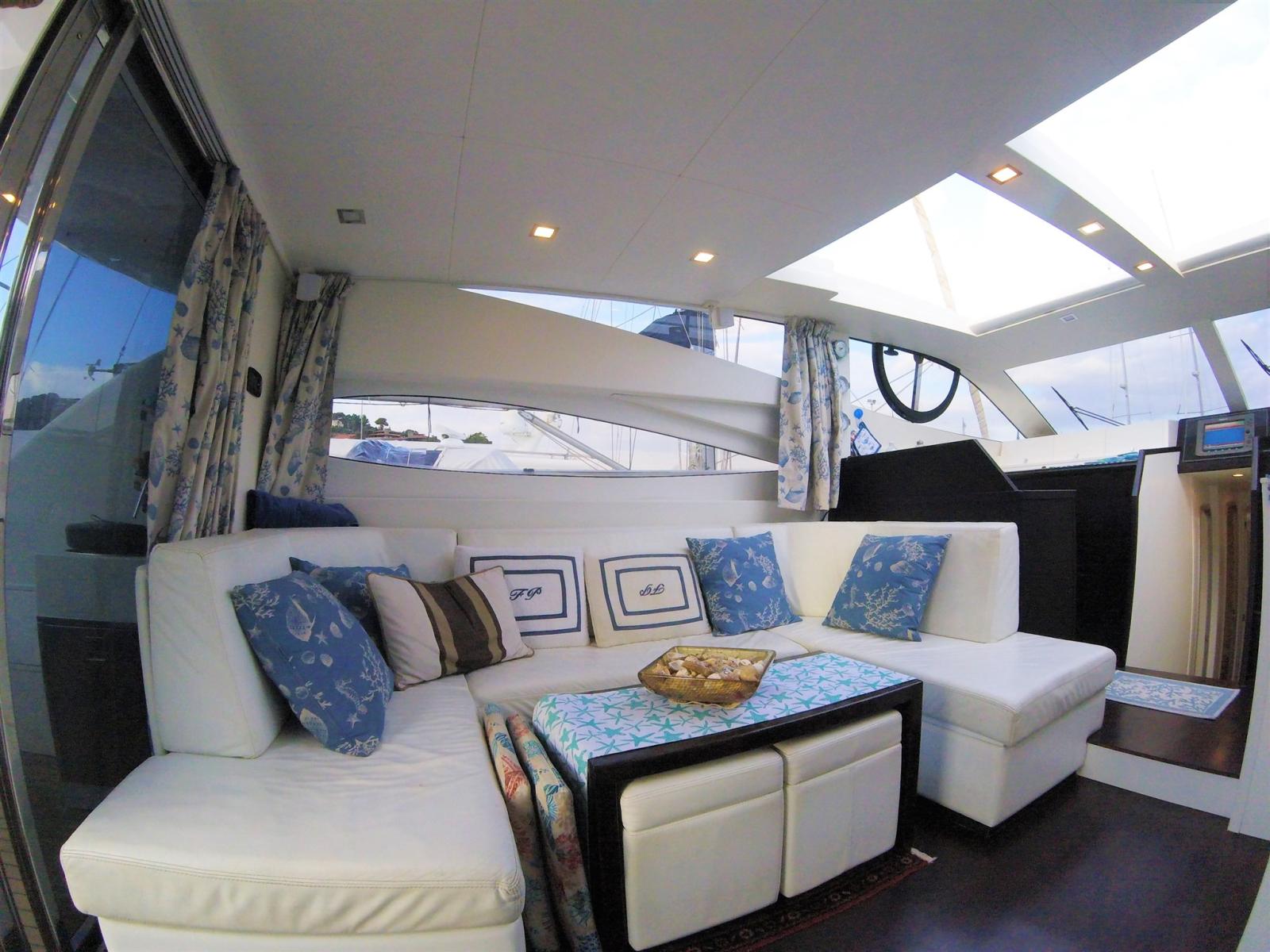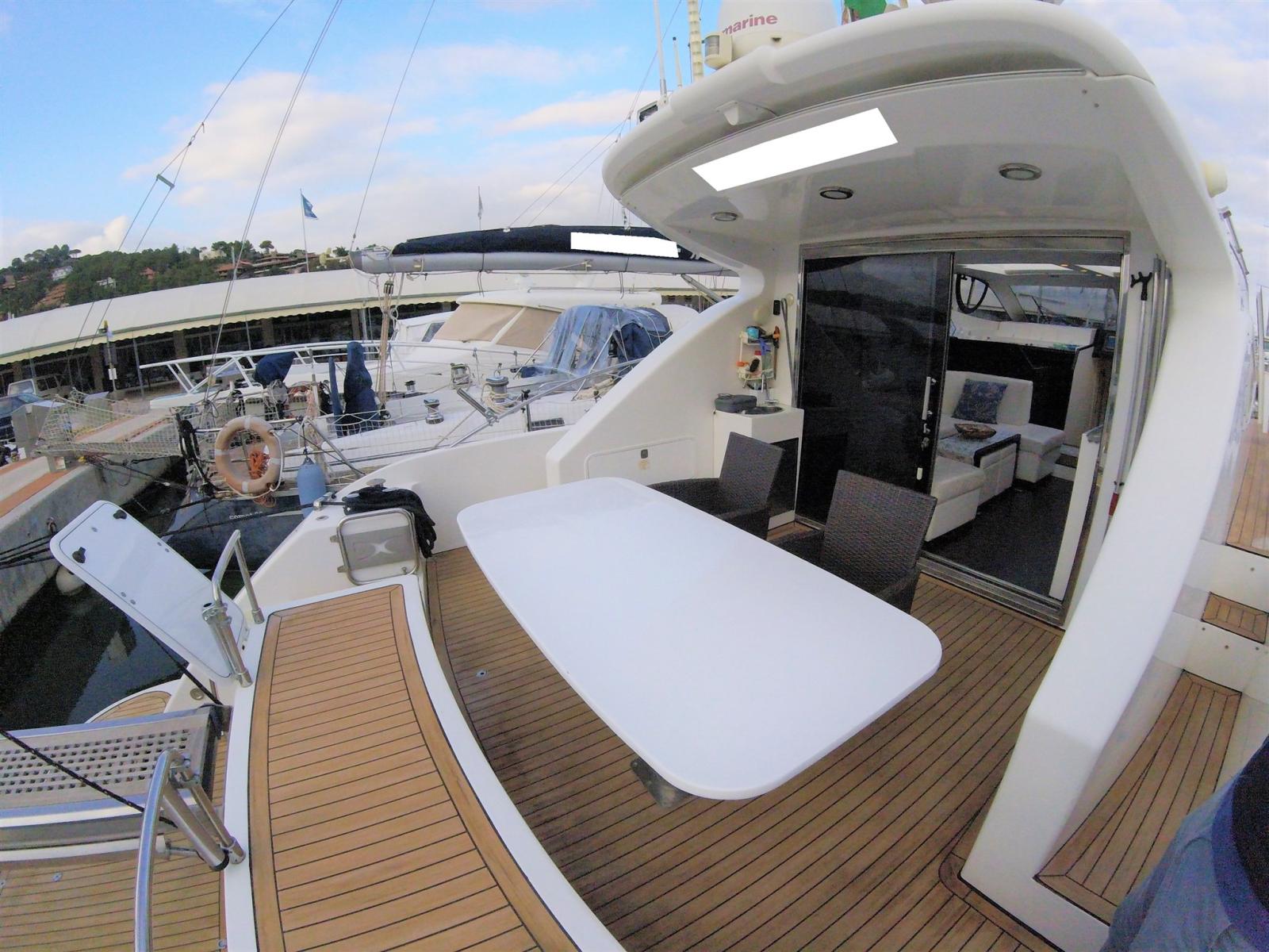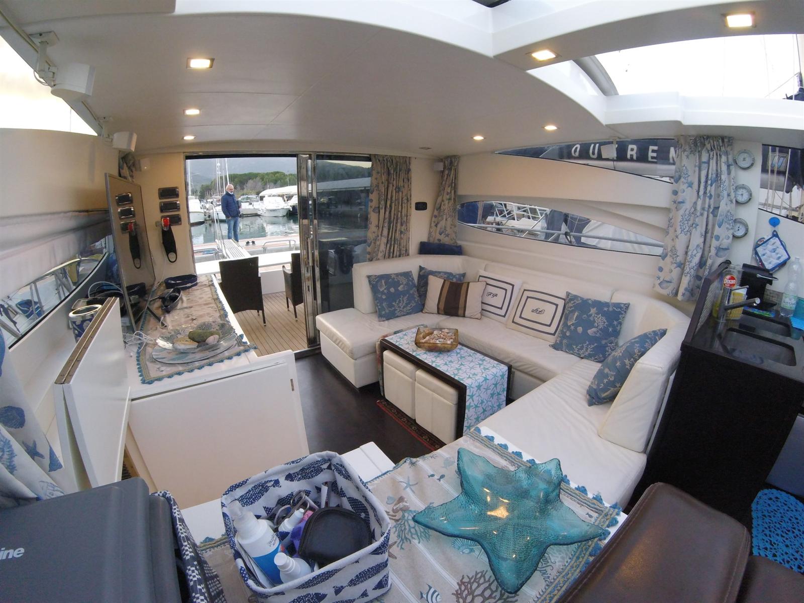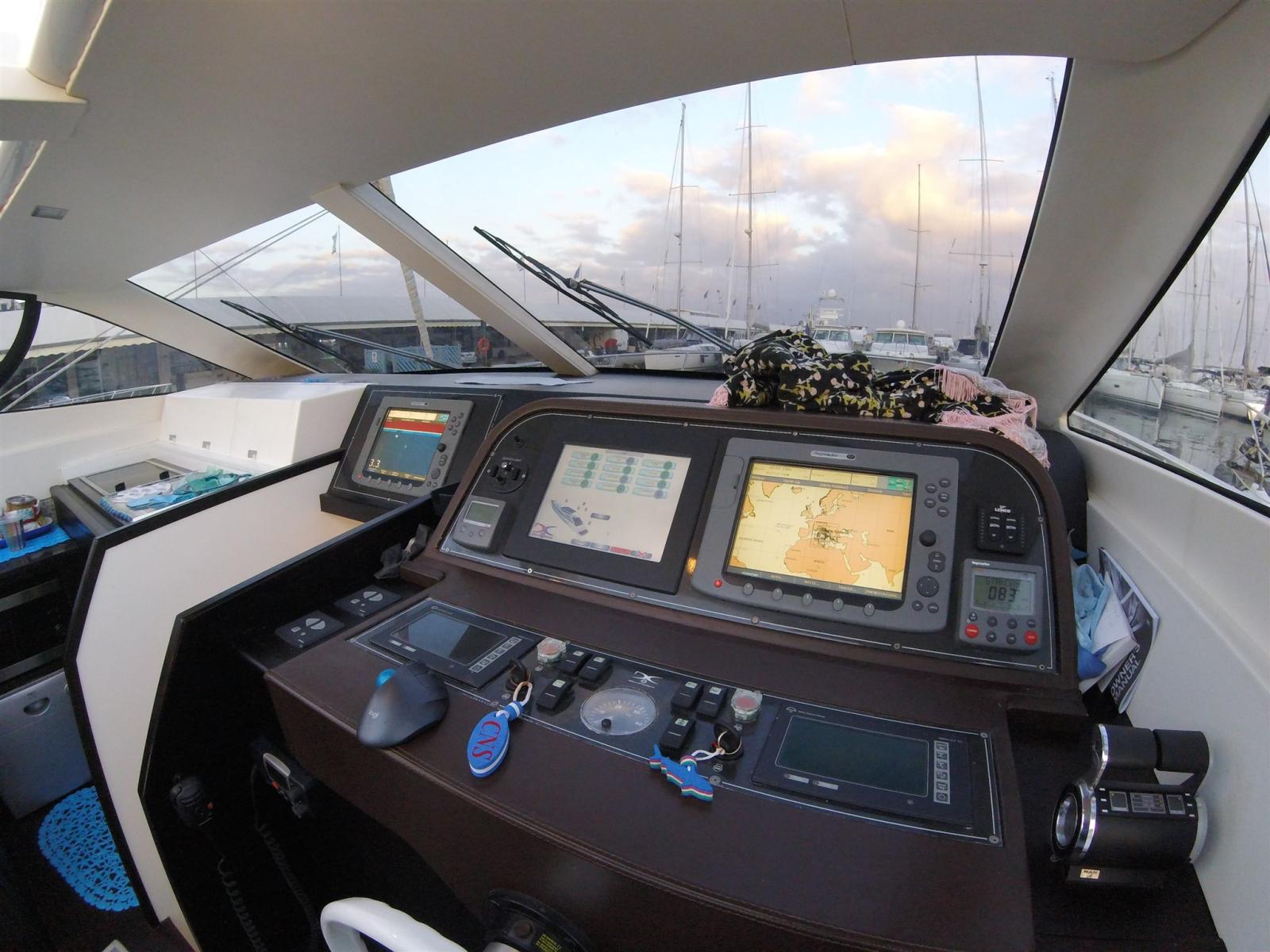 Eau sous pression, 5 Batteries, Passavant en teck (sintetico), Chargeur de batterie (12 + 24), Douche de cockpit (prua e poppa), Phare de poursuite, Flaps hydrauliques, Hard top (Aperetura elettrica), Indicateurs de flaps, Éclairage de courtoisie, Passerelle (Idraulica), Plateforme arrière, Pompe de cale automatique, Porte latérale (in Acciaio), Porte latérale, Cockpit en teck (sintetico), Prise de quai, Connexion eau sous pression à quai, Guindeau électrique, Echelle de bain, table de cockpit, 2 Winch électrique (a poppa).