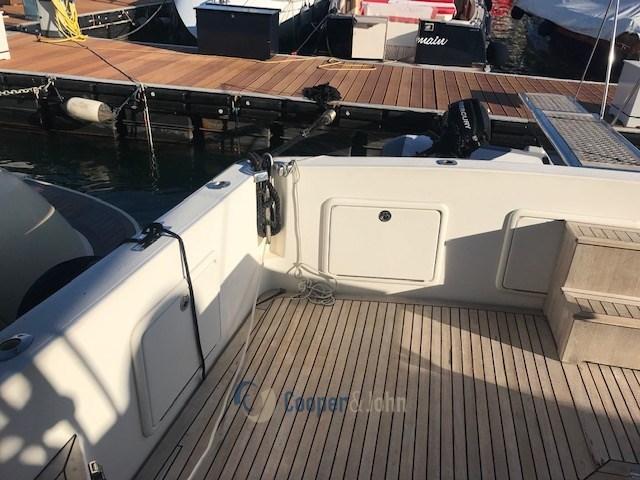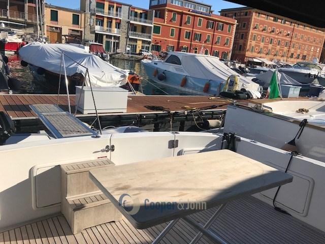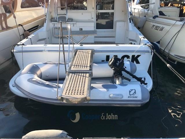 Eau sous pression, 6 Batteries, Douche de cockpit, Flaps hydrauliques, Hard top, Passerelle (idraulica), Cockpit en teck, Prise de quai, Guindeau électrique, Echelle de bain, Annexe (+ 3,5 hp).