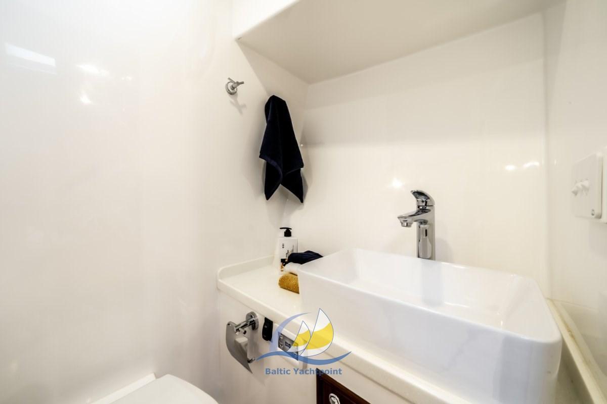 La suite principale est située au milieu des navires avec une hauteur de tête complète, un lit de plain-pied, beaucoup d’espace de rangement et une salle de bains privative. La cabine invités dispose également d’un lit à l’italienne et d’une salle de bains privative, qui peut également être utilisée comme toilette de jour et dispose d’une entrée séparée du couloir principal. Comme pour tous les yachts Integrity, les propriétaires ont le choix entre différents intérieurs.