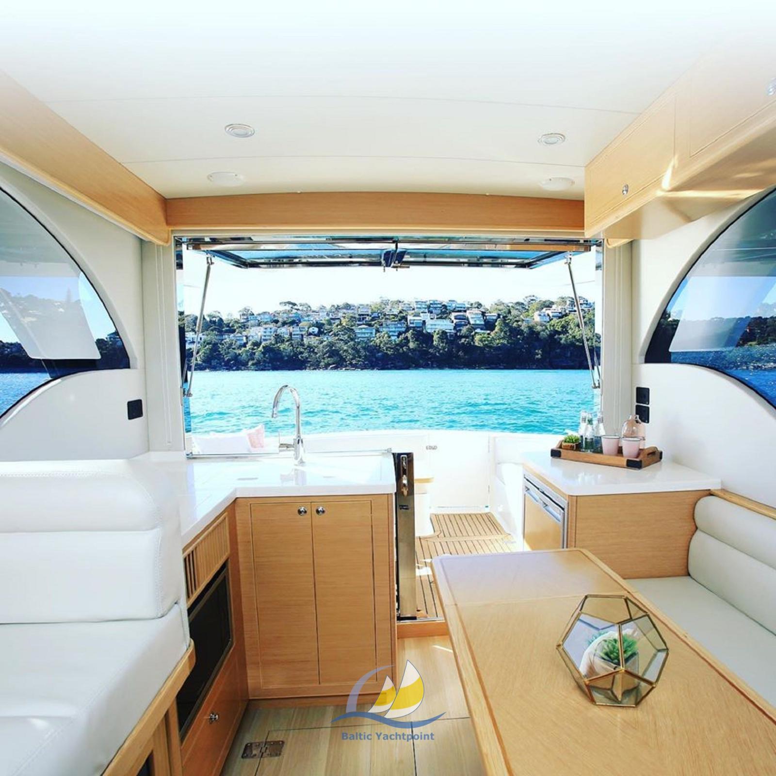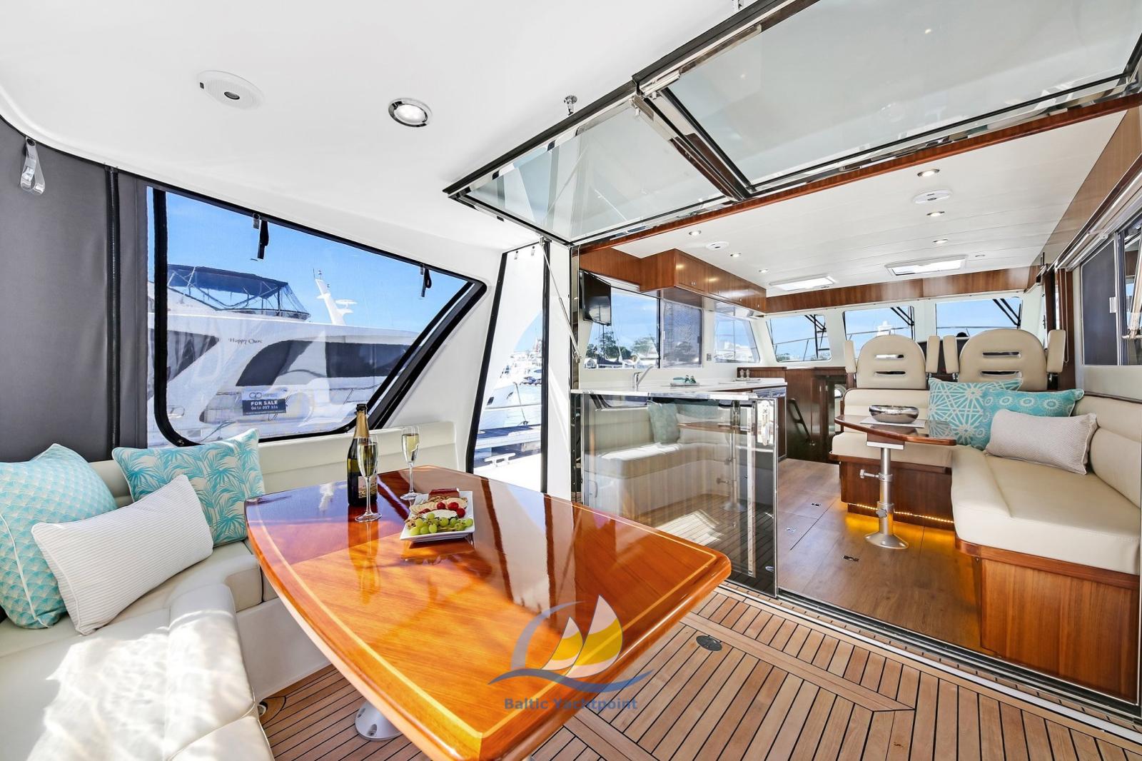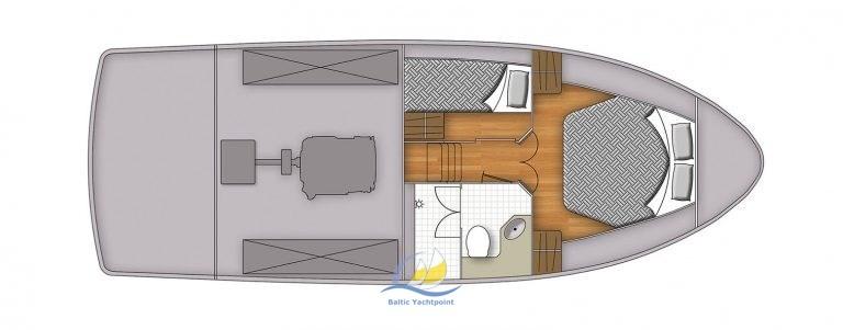 « Tout autour » pont accessible. Accès rapide et sûr à toutes les parties du navire sans restrictions Cockpit spacieux avec grande salle à manger, sièges rembourrés confortablement et espace de rangement supplémentaire