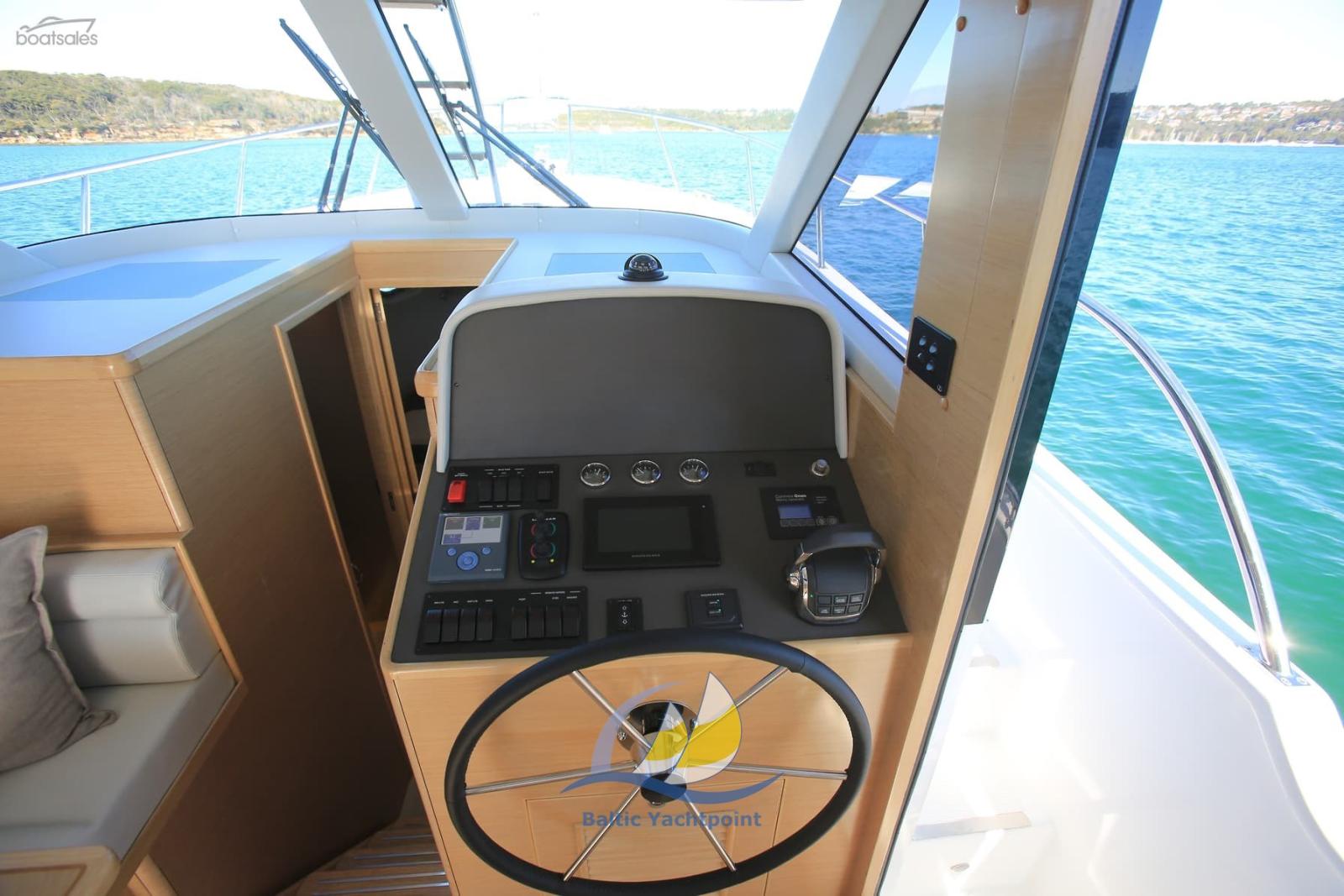Plate-forme de conduite avec porte coulissante. Accès facile et rapide de l’intérieur et de l’extérieur par une porte coulissante directement sur la cabine, ce qui permet une utilisation plus facile d’une seule main lors de la manœuvre et de l’amarrage du bateau.