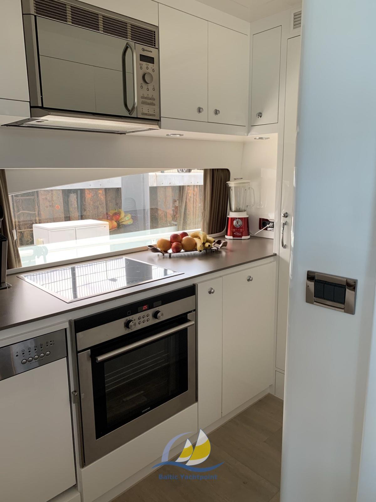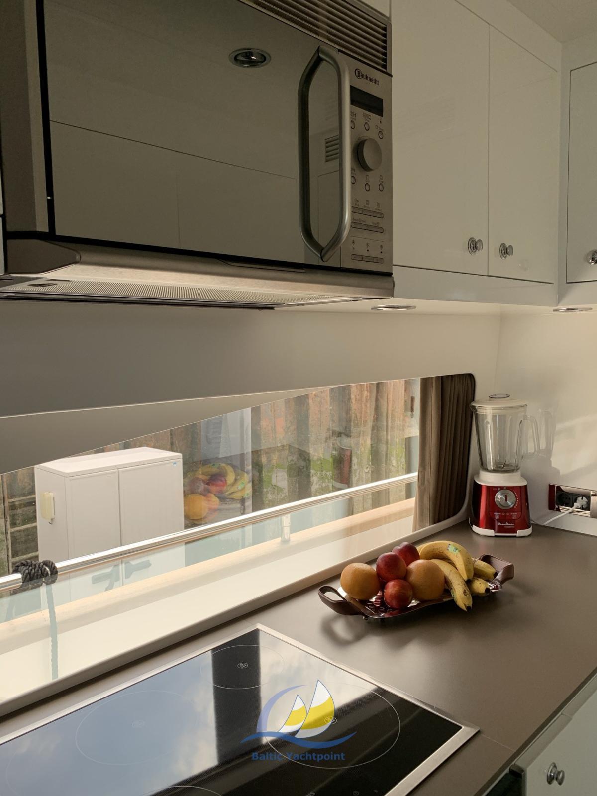 Avec ses 72 pieds, il offre un espace supérieur à la moyenne pour la vie, le divertissement et les trajets longue distance. L’intérieur comprend quatre cabines complètes avec salle de bain attenante, dont une grande suite principale et trois cabines d’amis confortables. Le vaste salon et la cuisine entièrement équipée complètent l’espace de vie à un niveau sophistiqué.