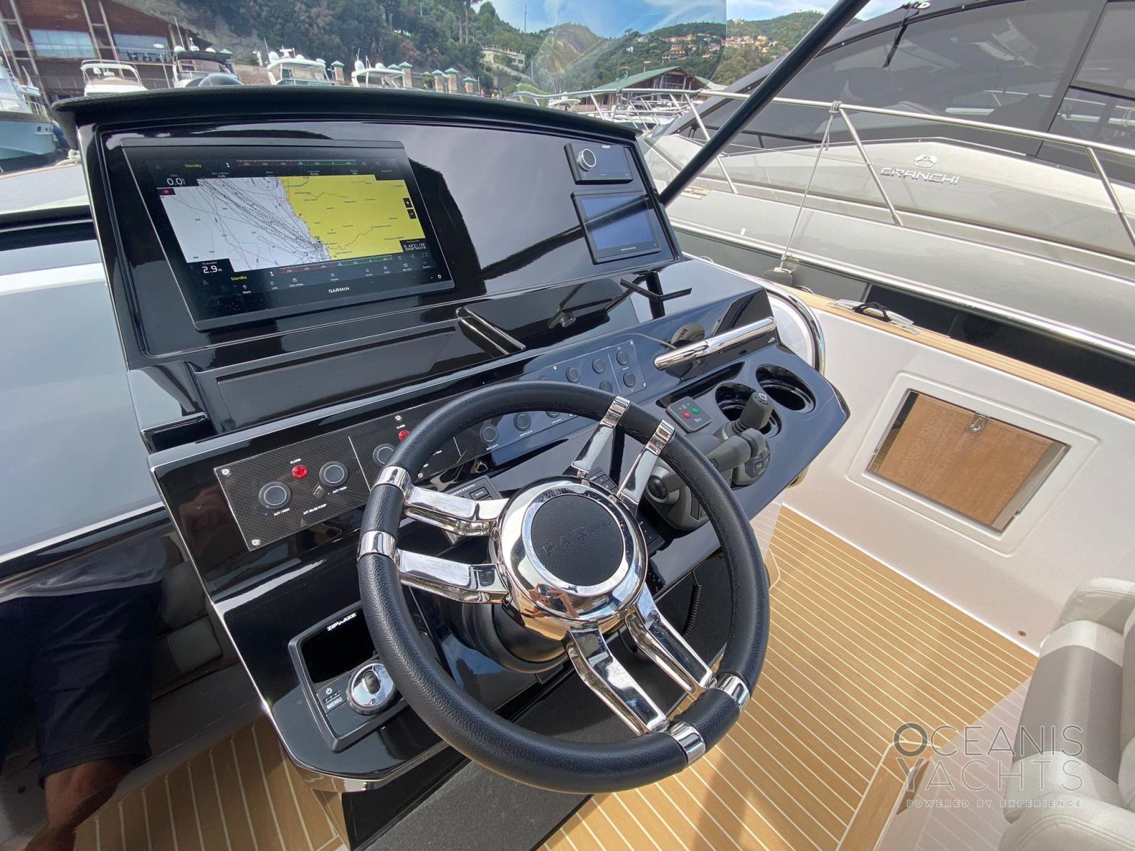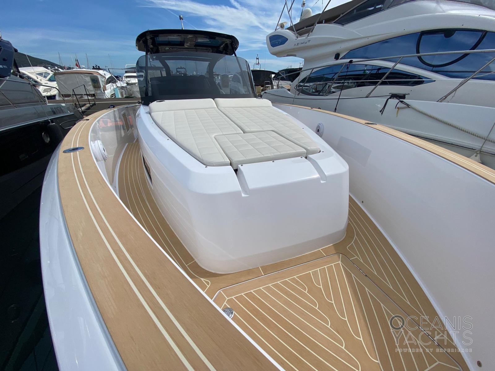 Eau sous pression, Trim hydraulique (Zipwake), 6 Batteries, Taquets pliants, Chargeur de batterie (60 Ah), Douche de cockpit, Plateforme arrière (maggiorata), Porte latérale, Cockpit en teck (Flexiteck), Prise de quai, Guindeau électrique, Echelle de bain (con tinetibene integrato), table de cockpit (elettrico), T-Top.