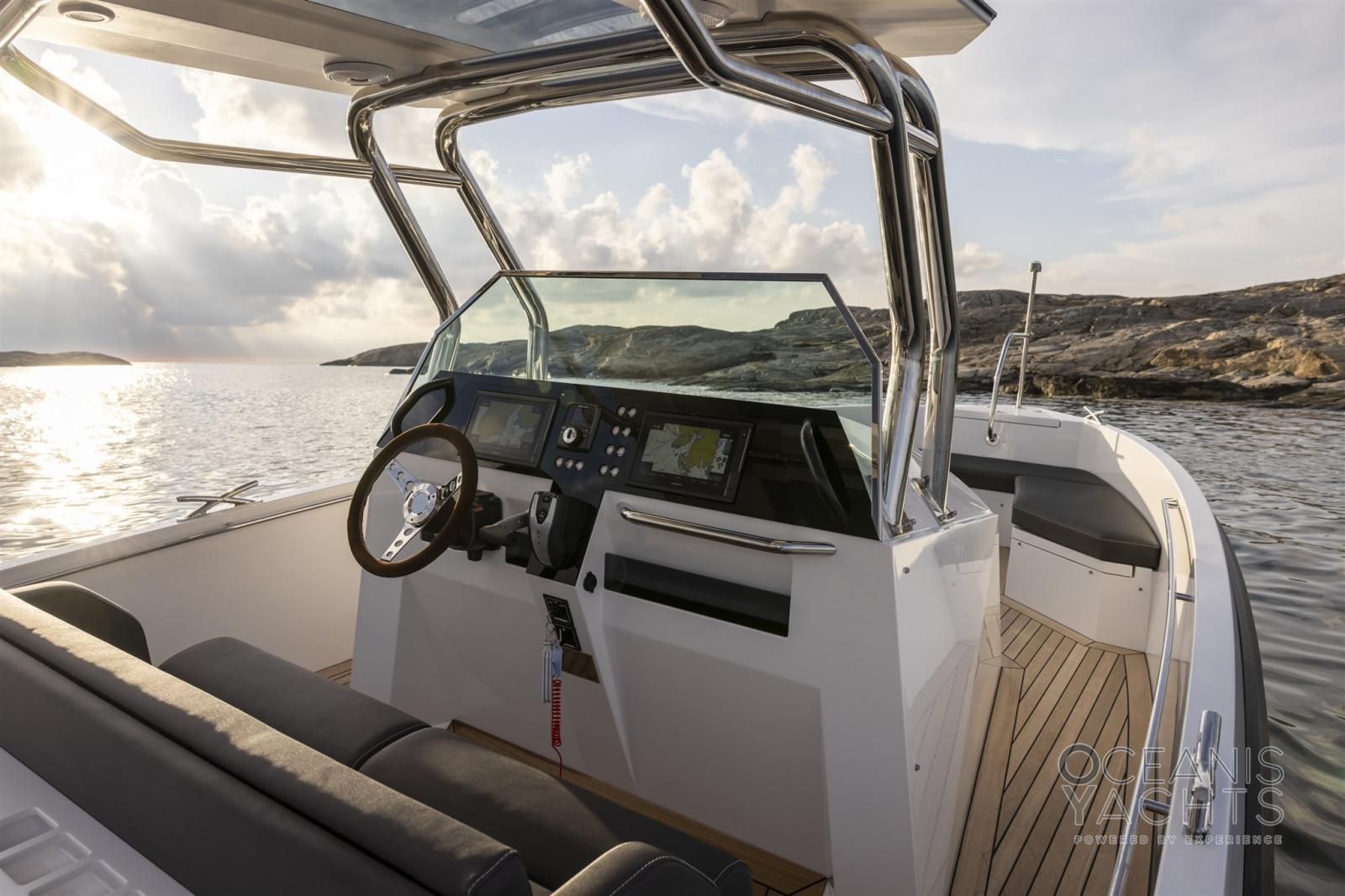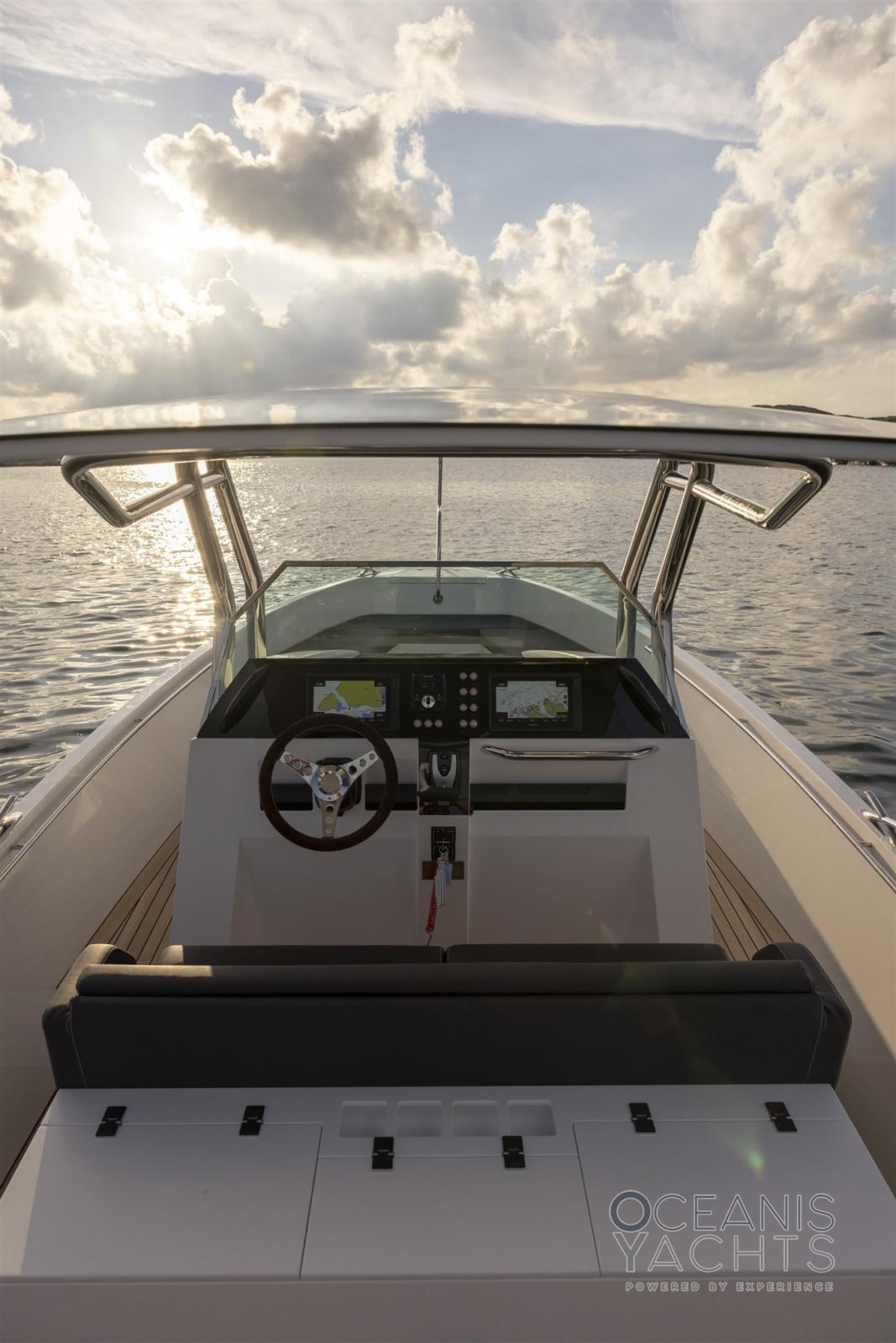 Eau sous pression, Passavant en teck, Douche de cockpit, Flaps électriques, Hard top, Éclairage de courtoisie, Spots sous-marins, Plateforme arrière, Pompe de cale automatique, Porte latérale, Cockpit en teck, Prise de quai, Guindeau électrique, Echelle de bain, 2 table de cockpit, Corne, T-Top, Winch électrique avant.