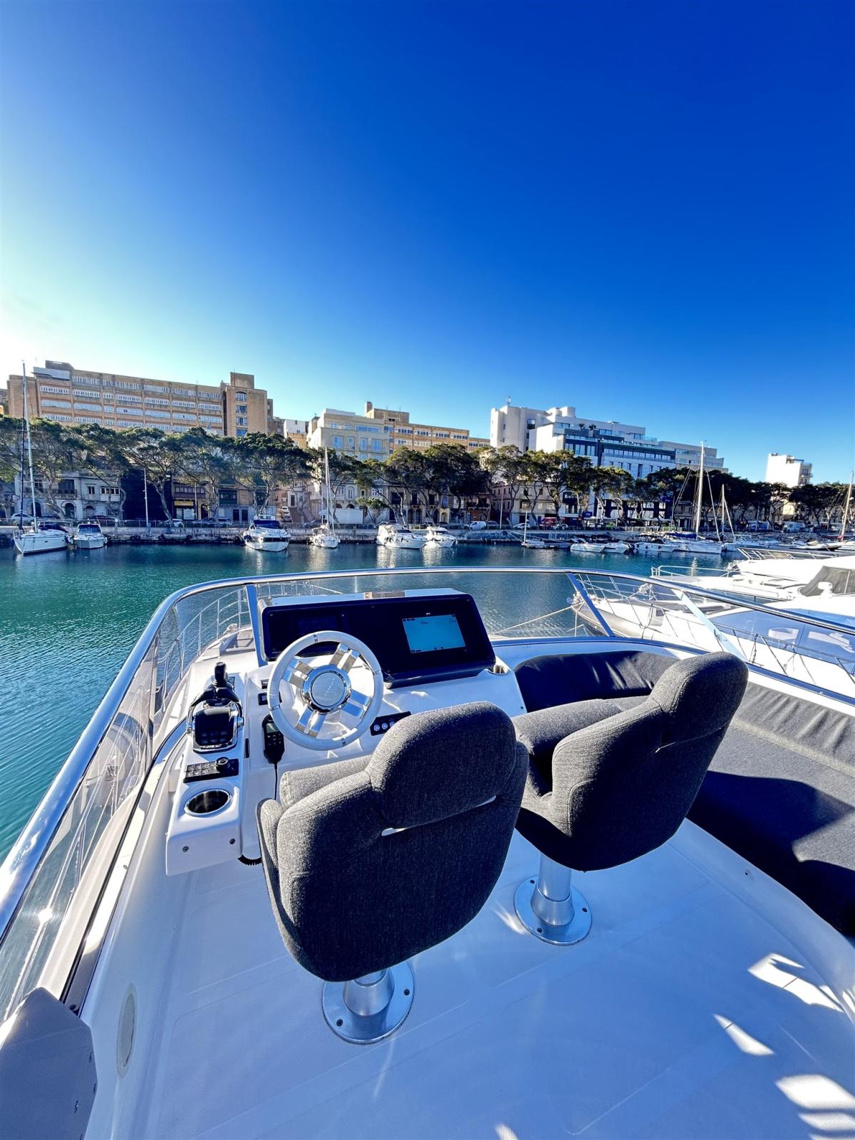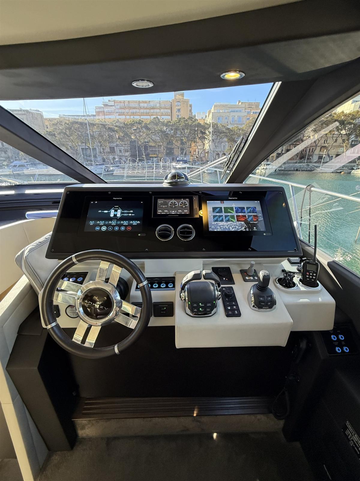 Alarme moteur, Alarme de pompe de cale, Eau sous pression, Trim hydraulique, Passavant en teck, Douche de cockpit, Extincteur(s) fixe(s), Jet Boat, Lavage de chaine, Éclairage de courtoisie, Spots sous-marins, Passerelle, Plateforme arrière, Pompe de cale automatique, Pompe de cale manuelle, Cockpit en teck, Guindeau électrique, Echelle de bain, table de cockpit, Annexe, Corne, Winch électrique avant.