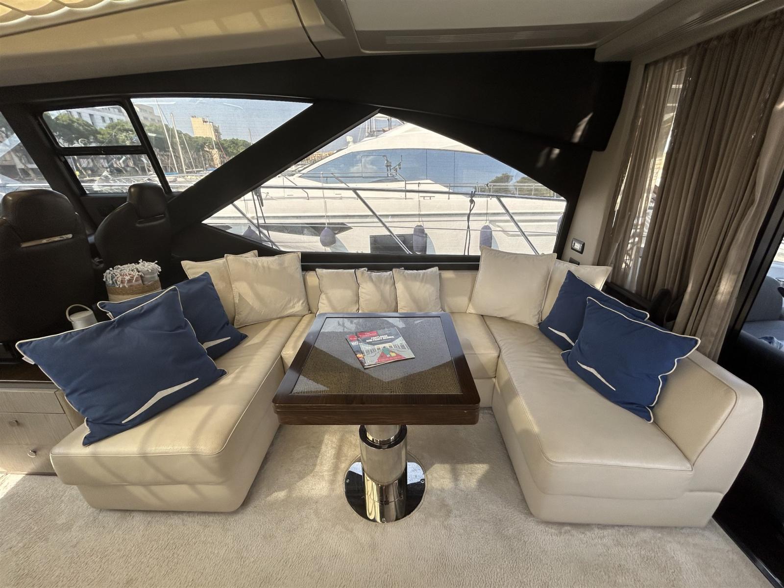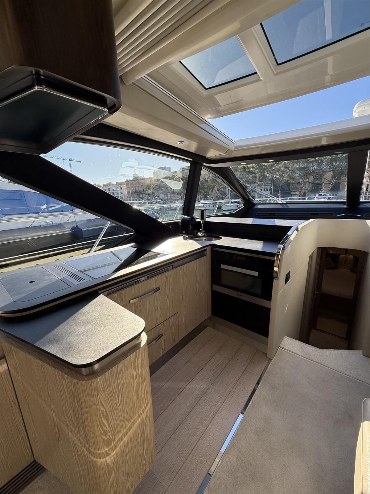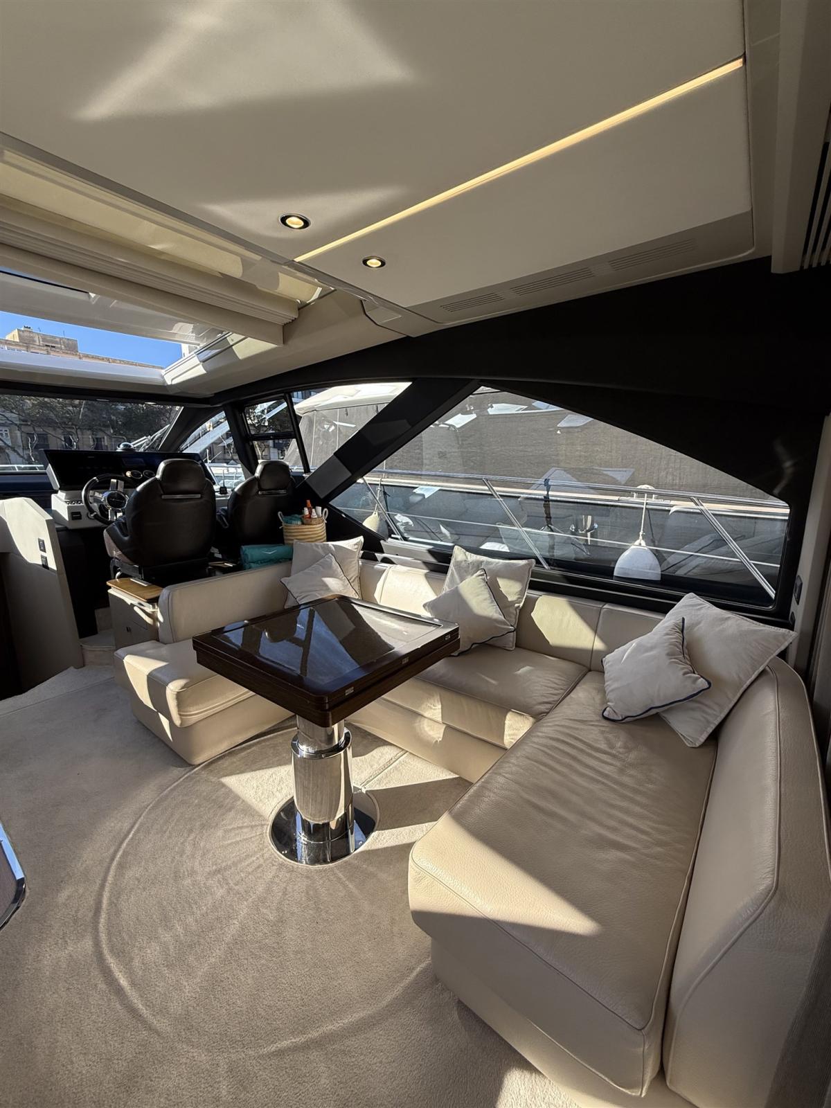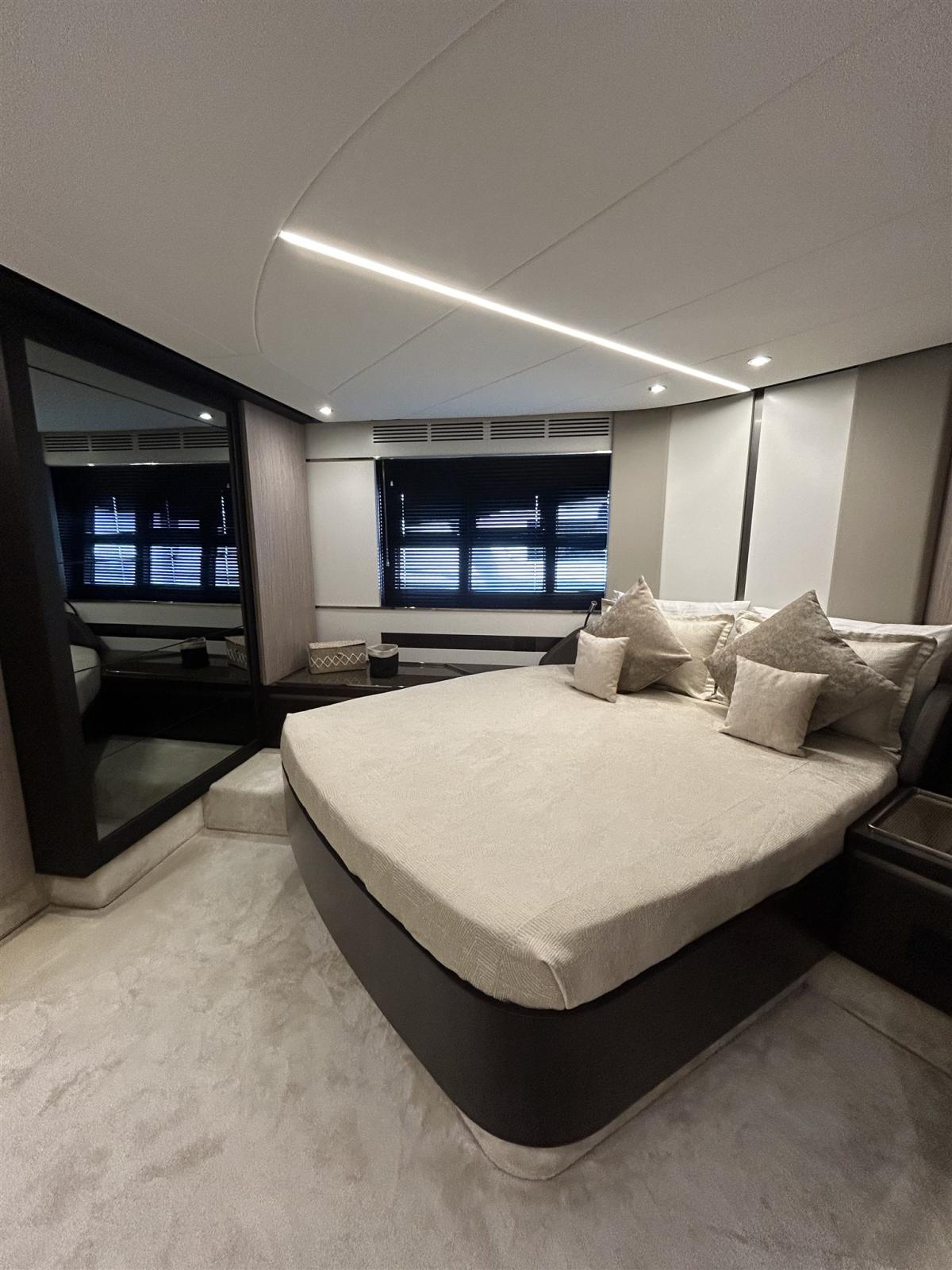 Le design extérieur sportif est de Stefano Righini, avec les fenêtres emblématiques en forme de losange de la marque donnant au bateau un profil indéniablement attrayant. Les intérieurs sont l’œuvre de Francesco Guida
