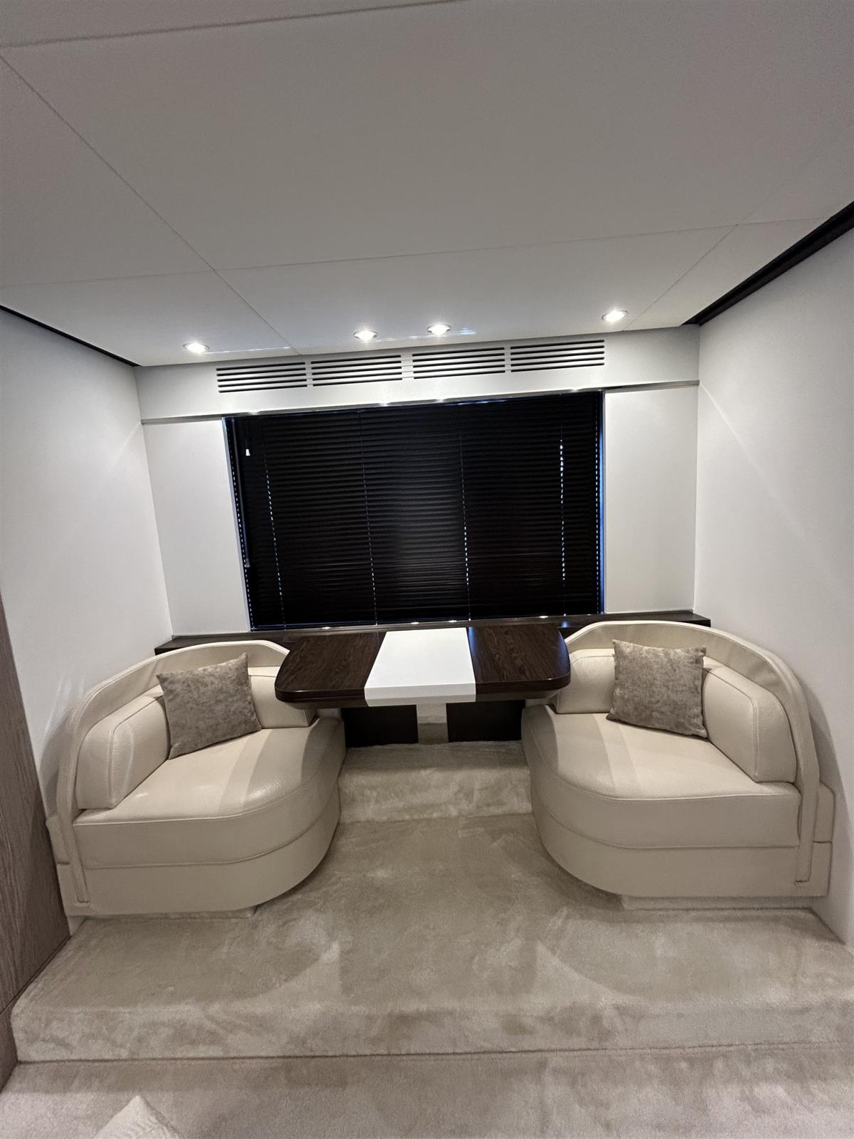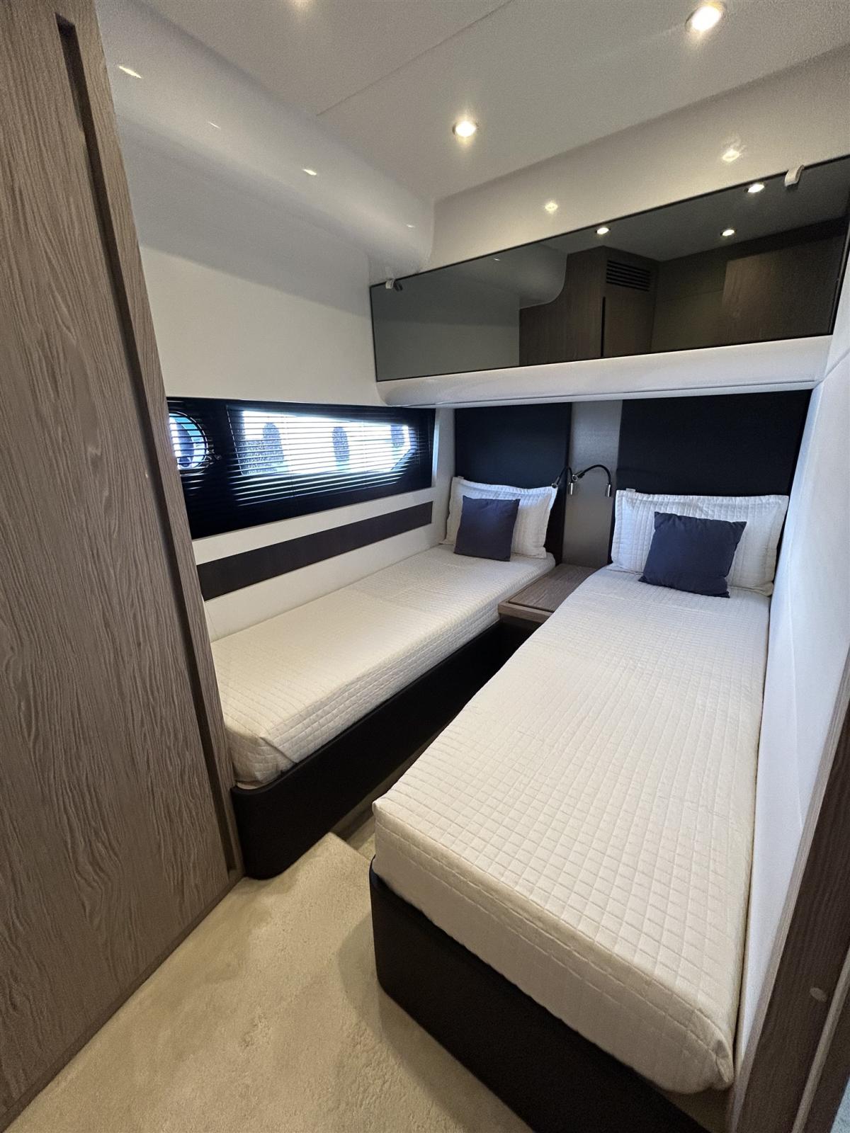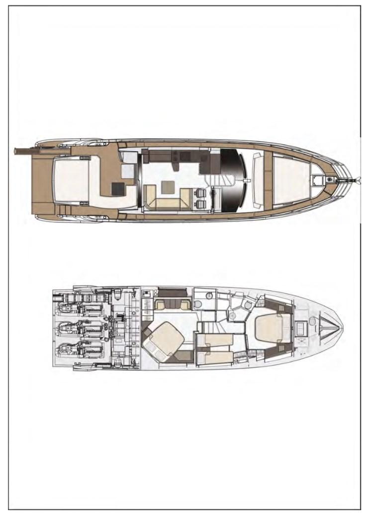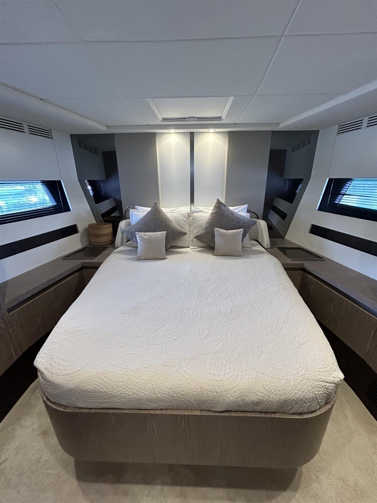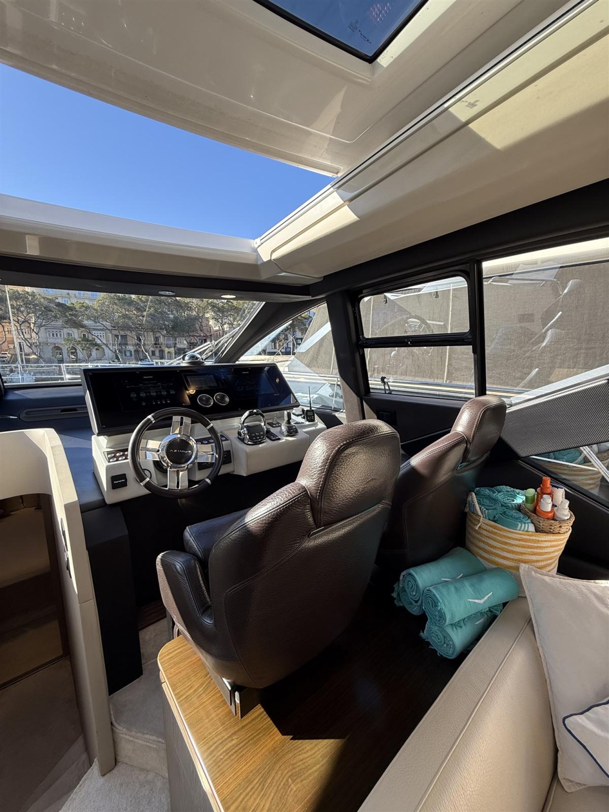 Le design extérieur sportif est de Stefano Righini, avec les fenêtres emblématiques en forme de losange de la marque donnant au bateau un profil indéniablement attrayant. Les intérieurs sont l’œuvre de Francesco Guida