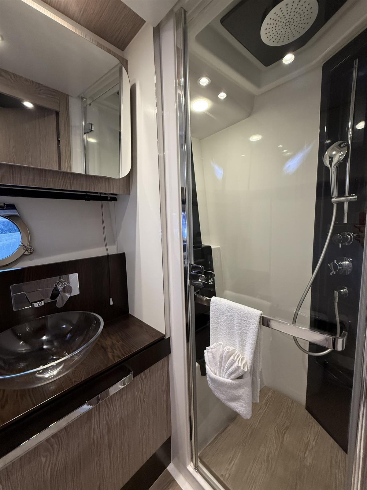 Alarme de pompe de cale, Eau sous pression, Trim hydraulique, Douche de cockpit, Phare de poursuite, Garage à annexe, Extincteur(s) fixe(s), Jet Boat, Lavage de chaine, Spots sous-marins, Passerelle, Plateforme arrière, Pompe de cale automatique, Pompe de cale manuelle, Porte latérale, Prise de quai, Guindeau électrique, Echelle de bain, Annexe, Corne, Pont en teck, Winch électrique avant.