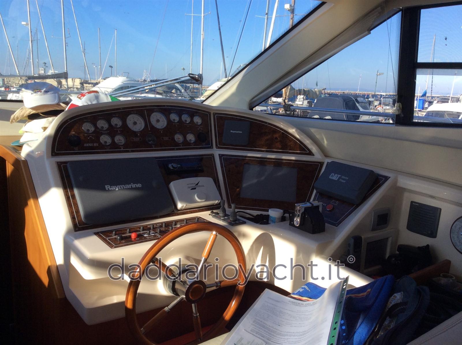 Eau sous pression, Douche de cockpit, Double barre à roue, Flaps hydrauliques (N°2), Passerelle (IDRAULICA CON TELECOMANDO), Plateforme arrière (TEAK), Pompe de cale automatique, Porte latérale, Cockpit en teck, Connexion eau sous pression à quai, Guindeau électrique, Echelle de bain, table de cockpit, Annexe, Corne, Winch électrique arrière.