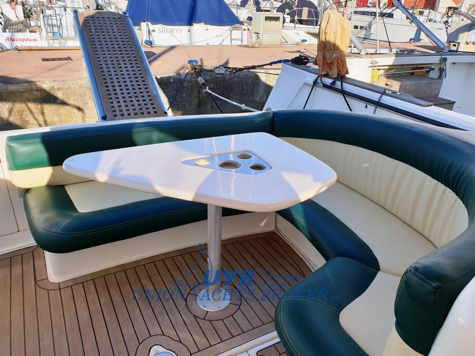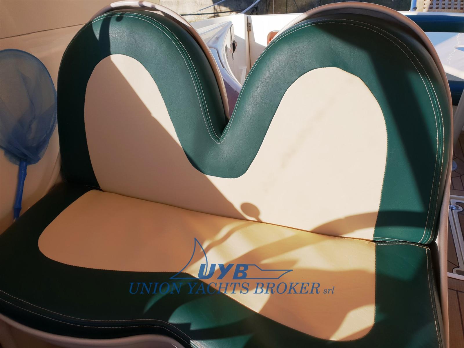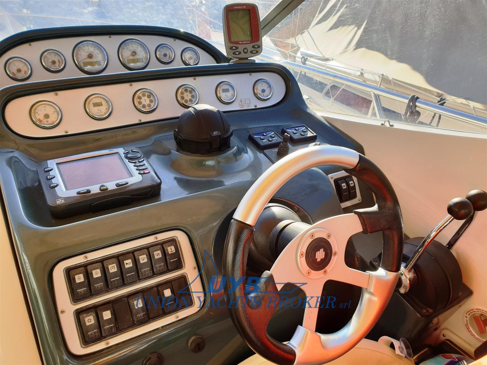 Eau sous pression, 3 Batteries (2x140 + 1x120), Douche de cockpit, Phare de poursuite, Passerelle (Idraulica besenzoni), Pompe de cale automatique, Porte latérale, Cockpit en teck, Prise de quai, Rollbar, Guindeau électrique (con telecomando), Echelle de bain, table de cockpit.