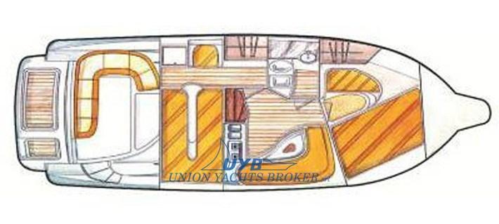 Extérieur : Cockpit avec canapé en forme de « u » convertible en solarium, armoire de cuisine extérieure avec évier, feu, réfrigérateur et espace pour le rangement, vers la chaise longue avant et poste de pilotage avec double siège réglable. Immense compartiment technique au milieu des navires