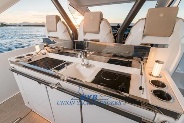 Alarme moteur, Alarme de pompe de cale, Alternateur, Ouverture du compartiment moteur électrique, Ligne d'arbre de rechange, Eau sous pression, Passavant en teck, Câble d’alimentation à quai, Couleur spéciale (VERNICE SCAFO METALLIZZATA PREMIUM), Douche de cockpit, Flaps électriques, Lavabo dans le cockpit, Éclairage de courtoisie, Spots sous-marins, Moniteur de batterie, Passerelle, Plateforme arrière, Pompe de cale automatique, Pompe de cale manuelle, Pont en teck, Porte latérale, Cockpit en teck, Prise de quai, Connexion eau sous pression à quai, Onduleur, Guindeau électrique, Echelle de bain, table de cockpit, Corne.