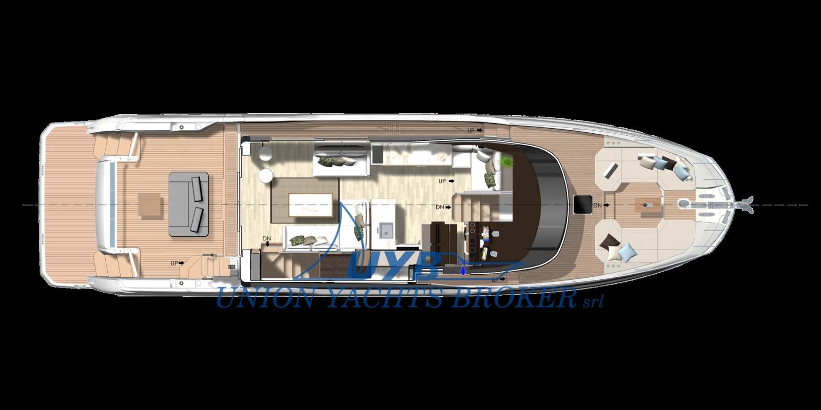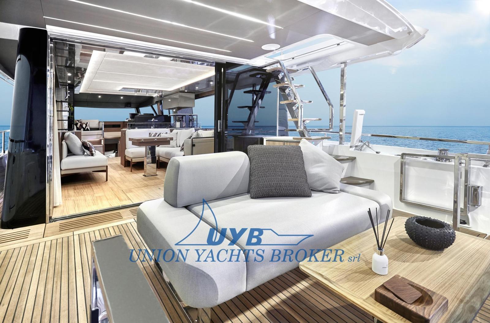 Passavant en teck, Douche de cockpit, Double barre à roue, Hard top (flybridge), Spots sous-marins, Passerelle (idraulica), Plateforme arrière (teak), Pompe de cale automatique, Porte latérale, Cockpit en teck, Prise de quai, Connexion eau sous pression à quai, Guindeau électrique, Echelle de bain, Stabilisateurs (Seakeeper SK9), Corne.