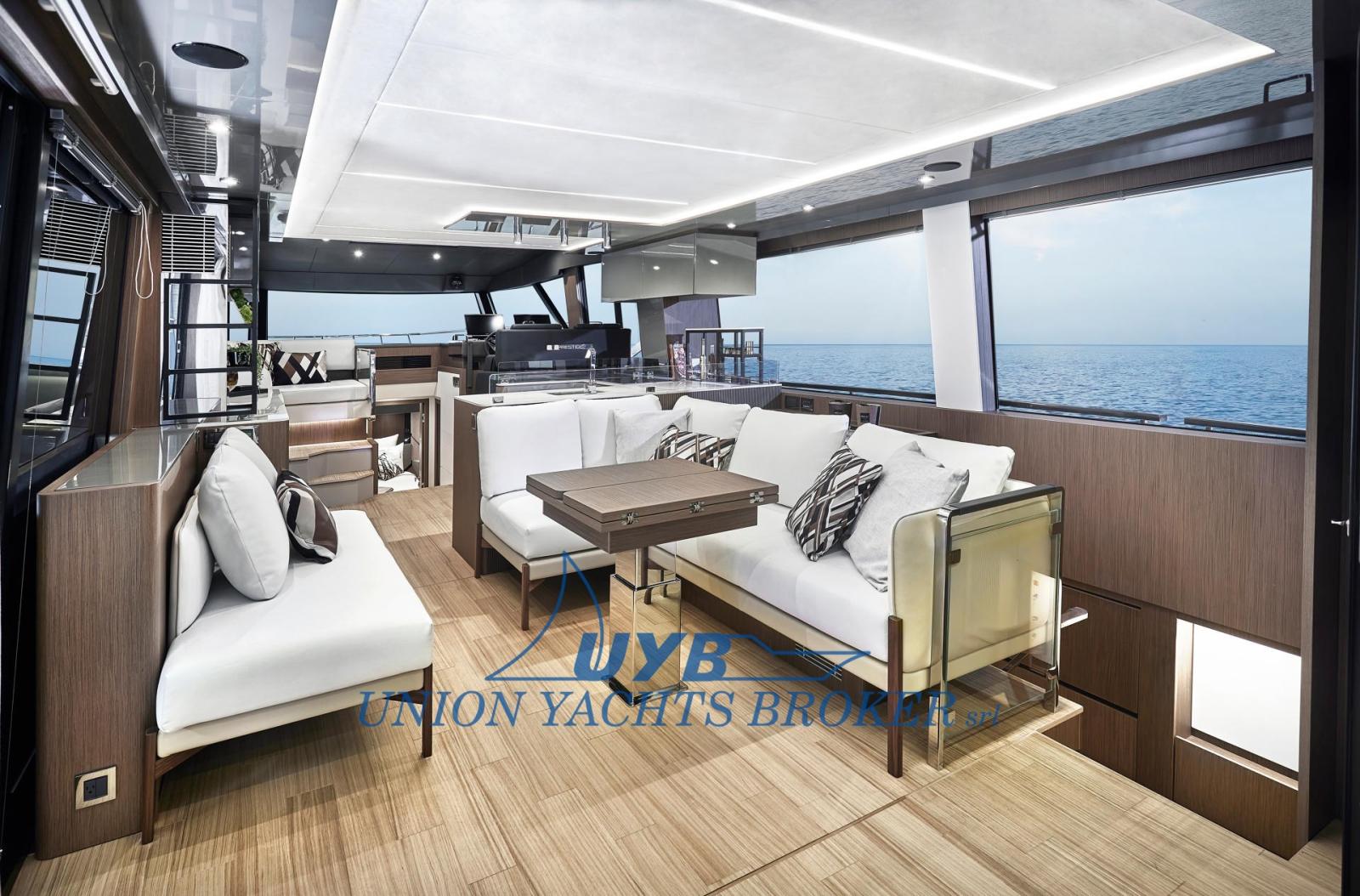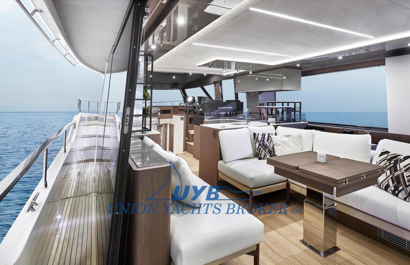 Conçu pour des croisières calmes et agréables, son design crée une connexion illimitée avec la mer. Entièrement ouvert, le cockpit à débordement offre une belle vue sur la mer et communique facilement avec le carré grâce à un grand vitrage électrique.