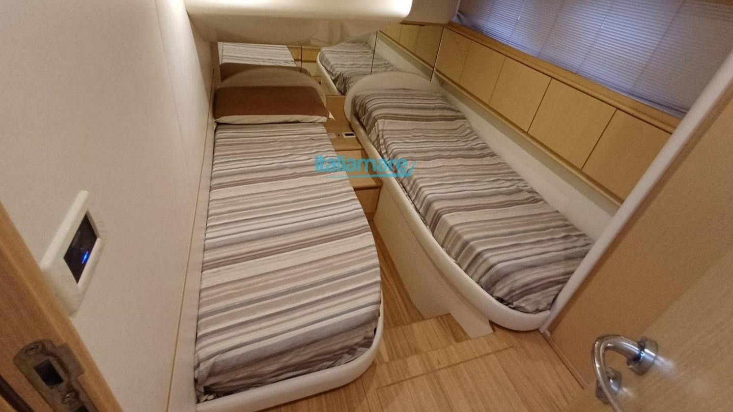 Cabine principale à l’avant avec salle de bain attenante, cabine double VIP, cabine d’invités avec deux lits simples et salle de bain avec douche.