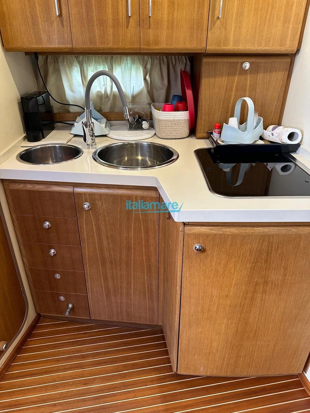 L’aménagement intérieur comprend trois cabines, deux salles de bains et une dinette spacieuse avec une cuisine entièrement équipée, offrant jusqu’à six couchettes dans un espace aéré et bien fini. À l’extérieur, le cockpit en teck est spacieux et fonctionnel, avec une table qui se transforme en bain de soleil, une passerelle hydraulique et des espaces de détente confortables à l’avant et à l’arrière. Le bateau est équipé de la climatisation, d’un générateur, de systèmes audio et TV et d’un équipement de navigation électronique complet.