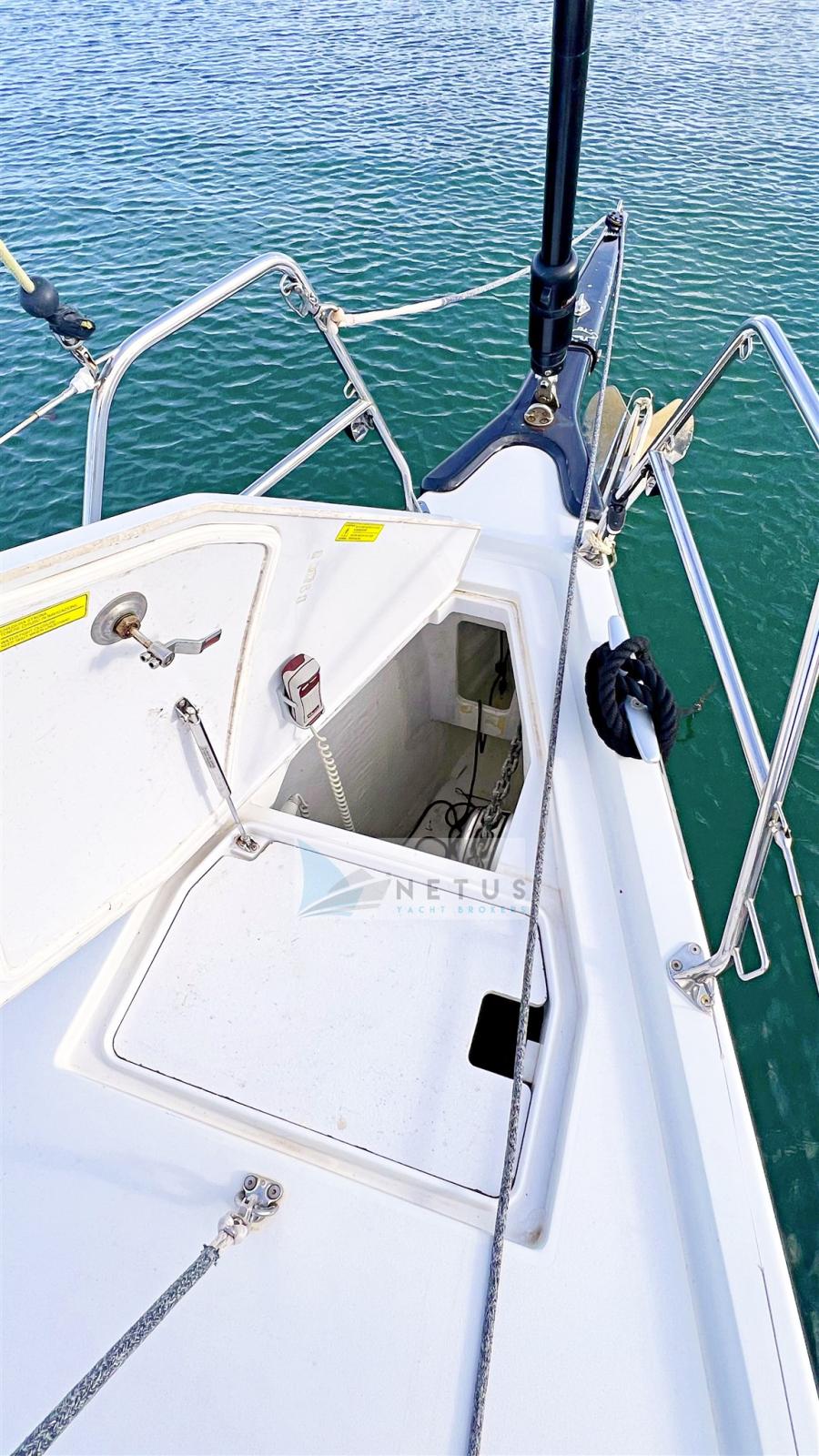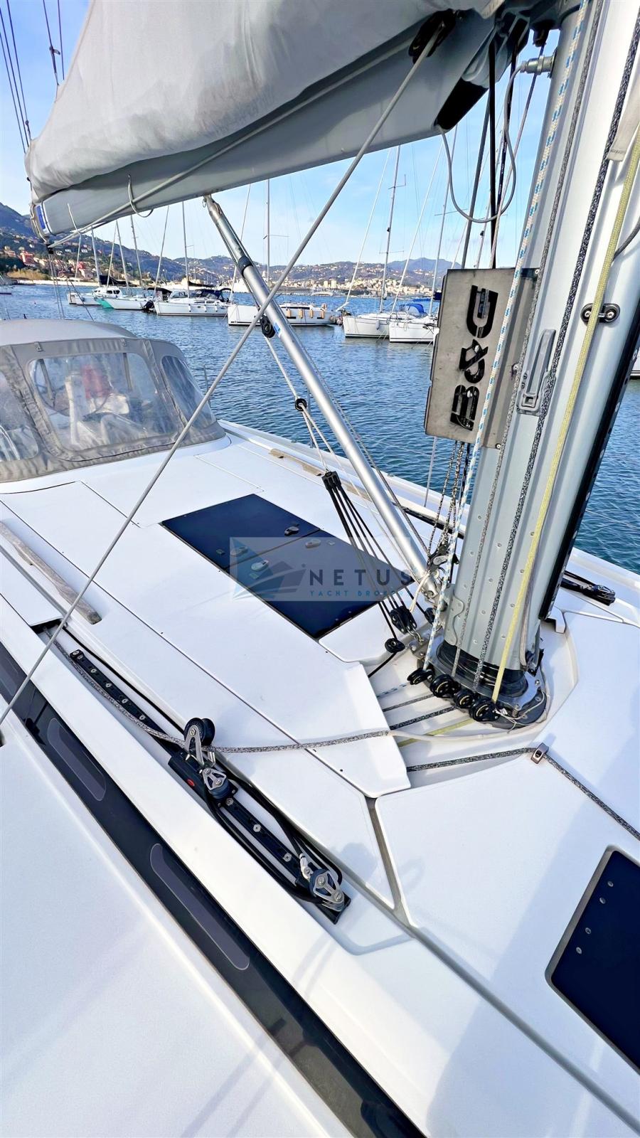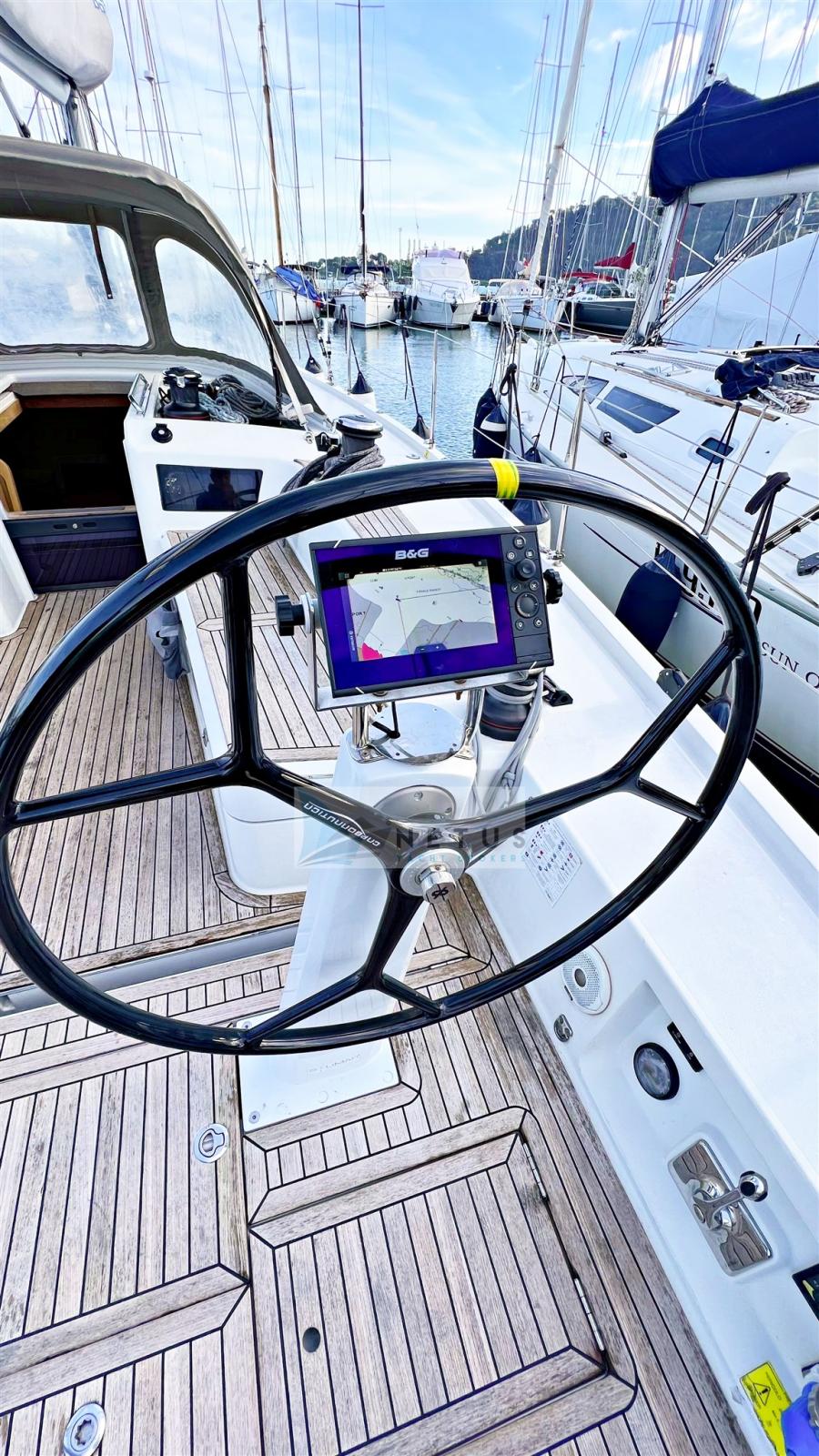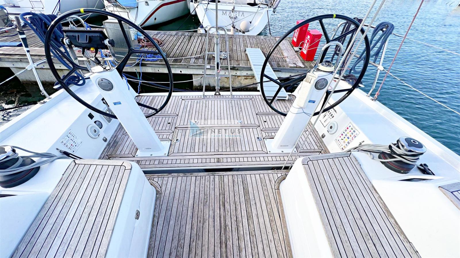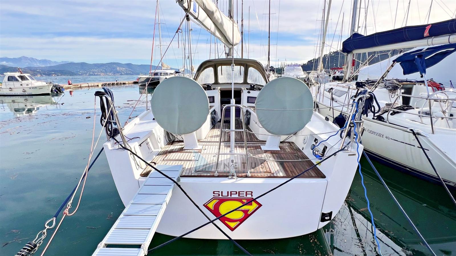Ancre (Delta), Eau sous pression, Radeau de sauvetage (2022), 3 Batteries, Douche de cockpit, Double barre à roue, Passerelle, Pompe de cale manuelle, Cockpit en teck, Prise de quai, Répétiteur électronique, Guindeau électrique, Gréement Rod, Echelle de bain, Chaise support HB, table de cockpit, Annexe (+outboard engine), Tuff Luff, 5 Winch, Windex.
