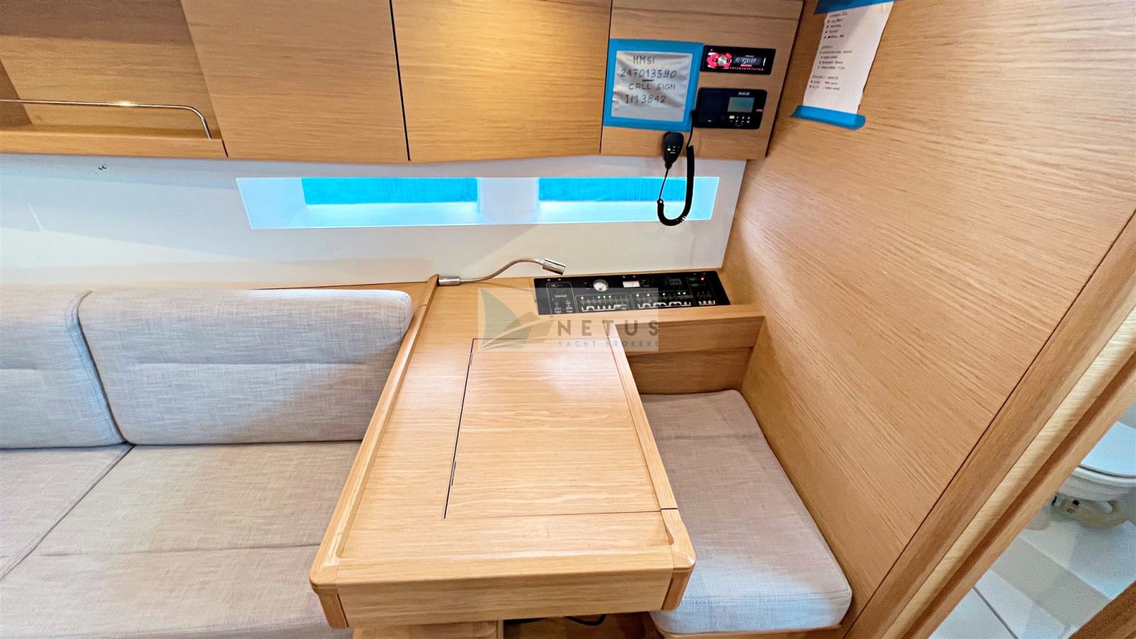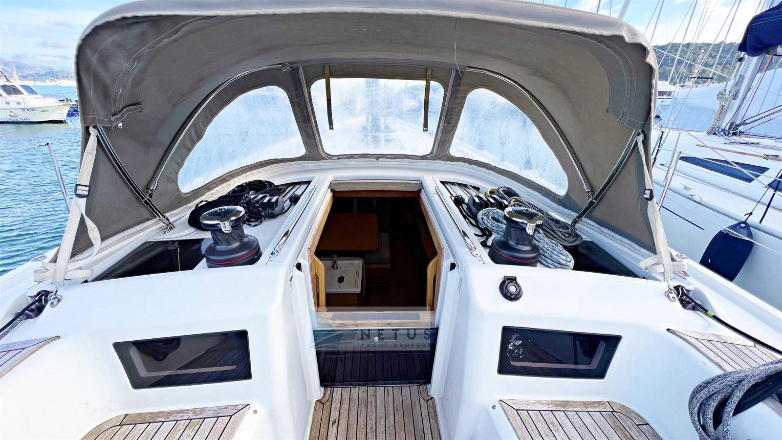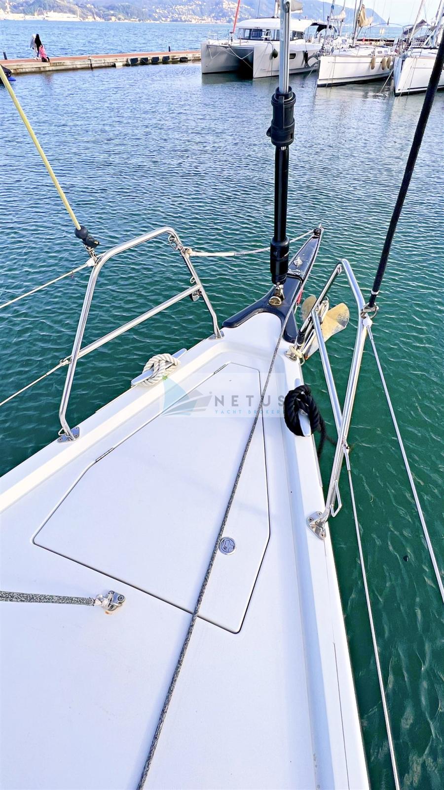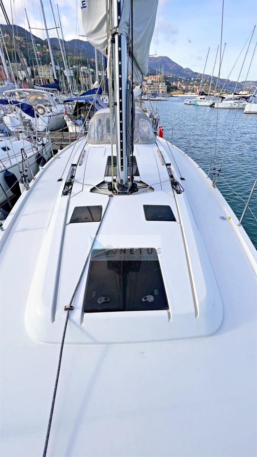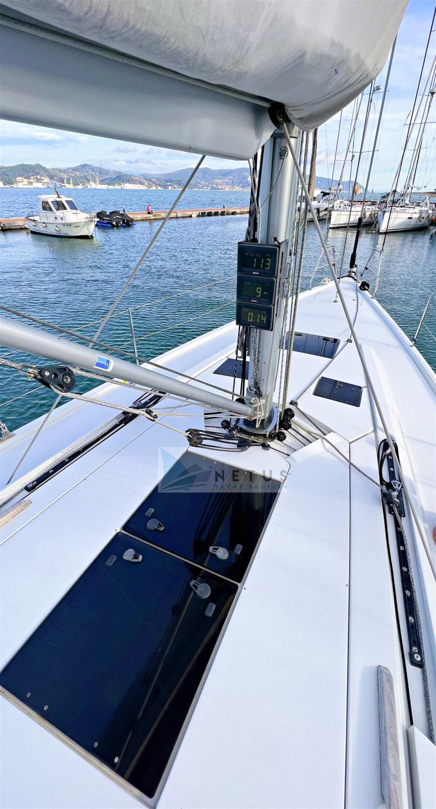 Ancre (Delta), Eau sous pression, Radeau de sauvetage (2022), 3 Batteries, Douche de cockpit, Double barre à roue, Passerelle, Pompe de cale manuelle, Cockpit en teck, Prise de quai, Répétiteur électronique, Guindeau électrique, Gréement Rod, Echelle de bain, Chaise support HB, table de cockpit, Annexe (+outboard engine), Tuff Luff, 5 Winch, Windex.