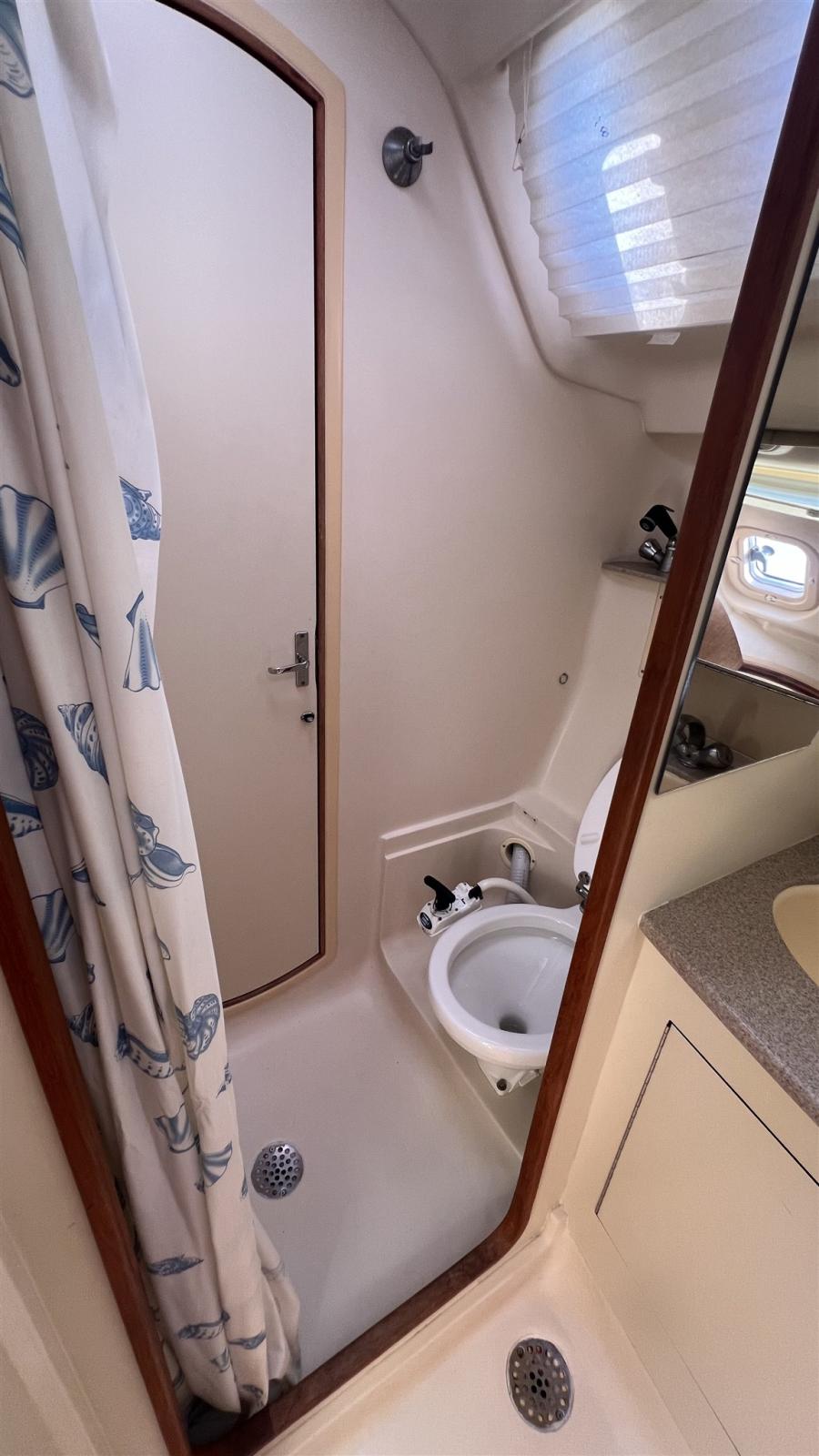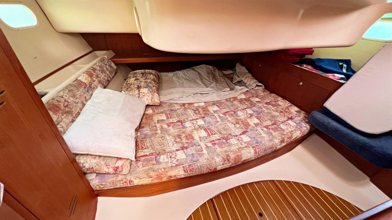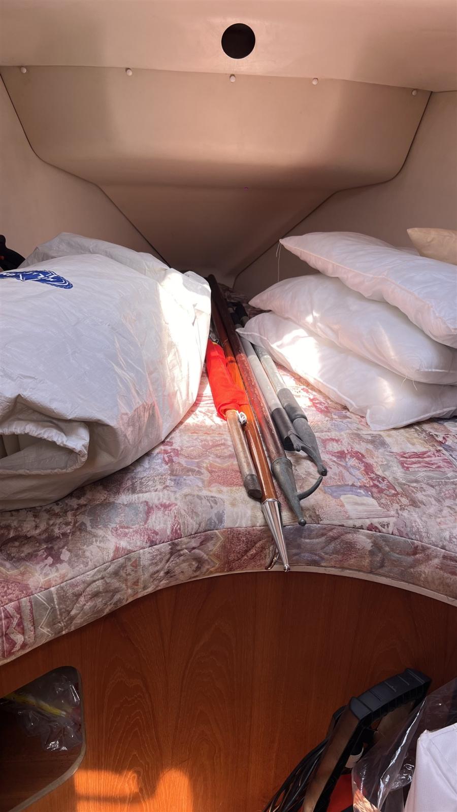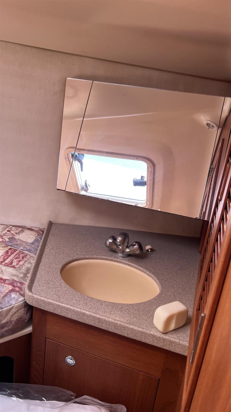 2 cabines, 1 salle de bain avec toilettes manuelles. Dinette décapotable. Instrumentation Raymarine complète avec radar. Propulseur d’étrave. Panneaux solaires 2013. Cockpit en teck synthétique. 1 treuil électrique. Séries 2022.